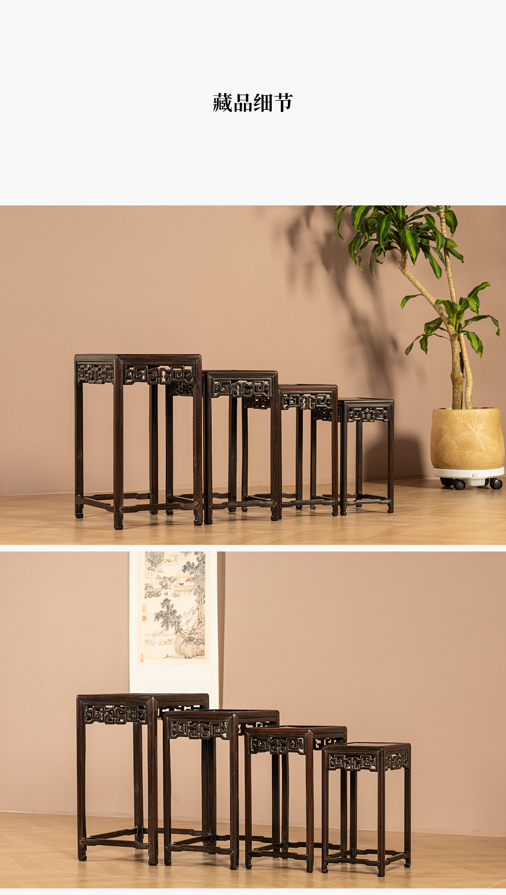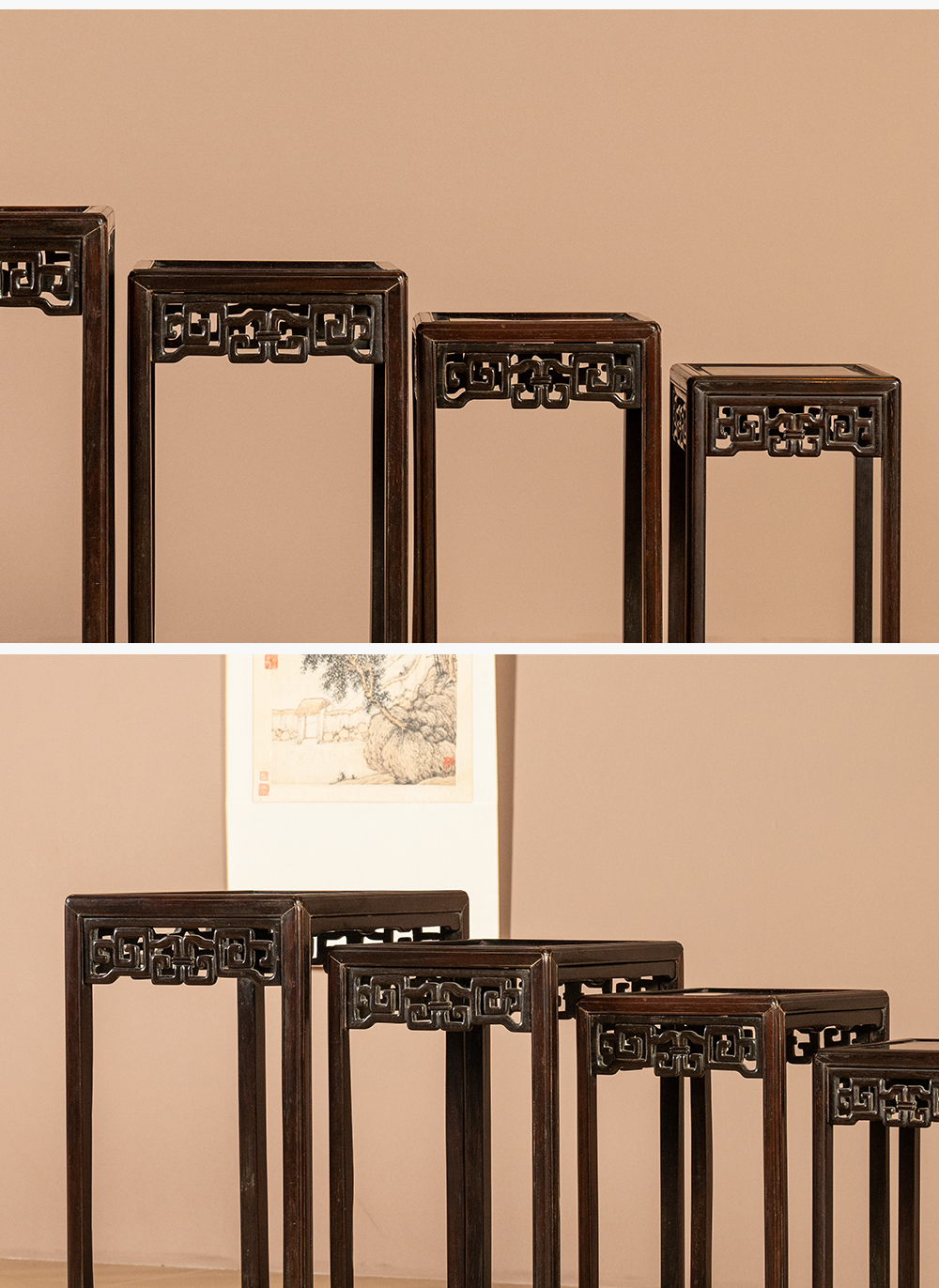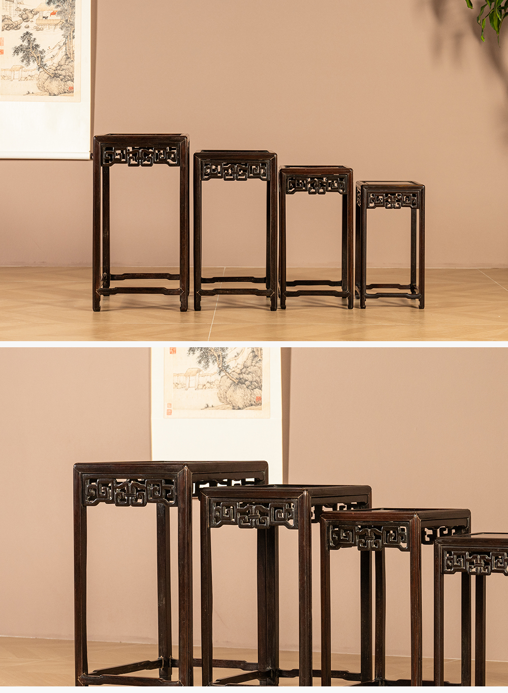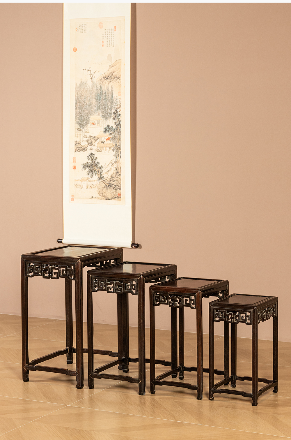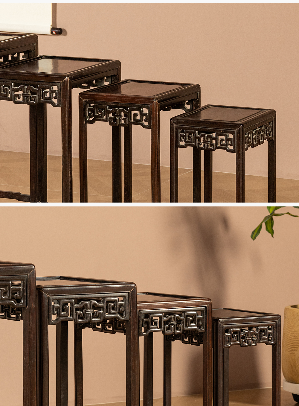 清 红木透雕拐子纹套几(一套四只)