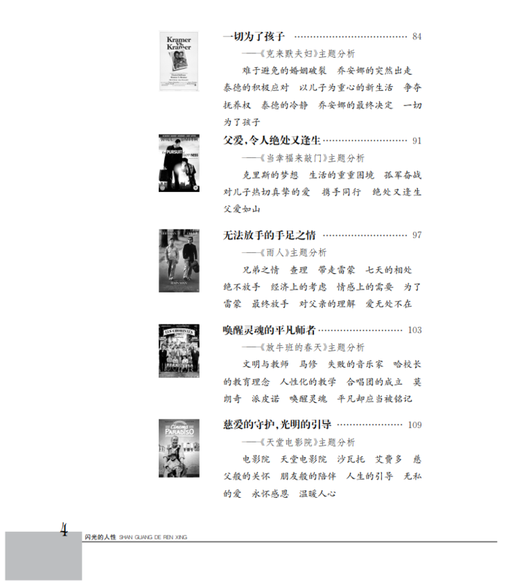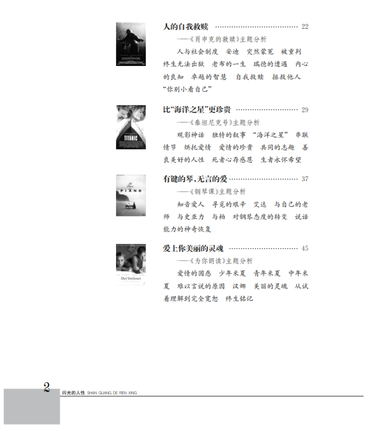本书选择的29部经典电影作品,是根据作者在长期教学过程中,与学生充分交流,共同探讨后最终确定的。如《肖生克的救赎》、《恋恋笔记本》、《泰坦尼克号》、《黑天鹅》、《平民窟的百万富翁》等。选片标准是:有利于年轻人成长的经典之作,且本书论及的电影作品均与“人性”这一关键词息息相关,本书在对经典电影主题进行分析的同时,倾注了作者对电影、对人性的探讨与看法,很有利于读者或观影者对电影主题的深入交流和身心发展。