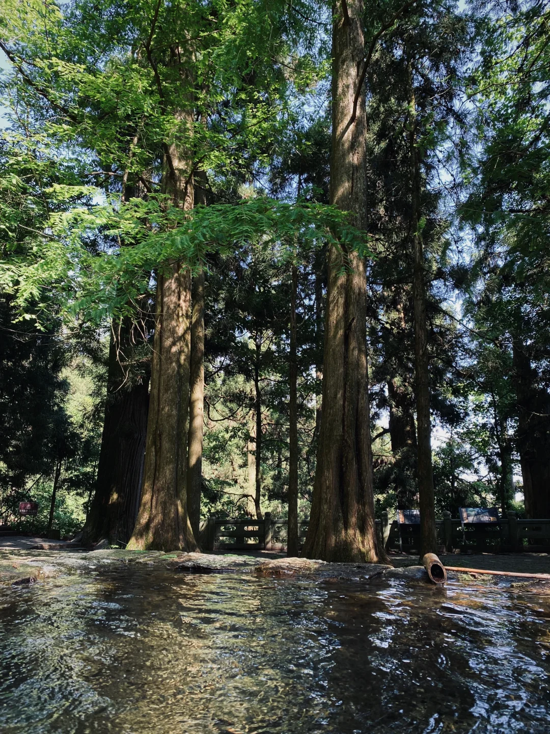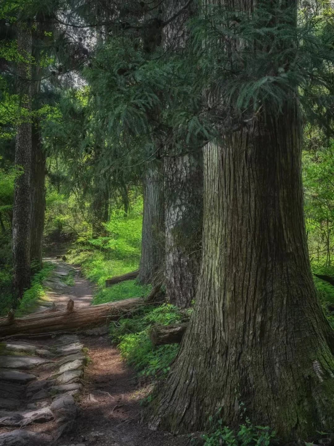走在千年古道上感受历史,青苔布满了石阶,不知名的野花小草顽强地在石缝里生存,就像闯入了迷雾森林,浓郁的绿色,随处可见参天巨树—柳杉树,体验感十分舒适。