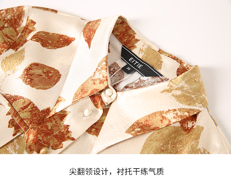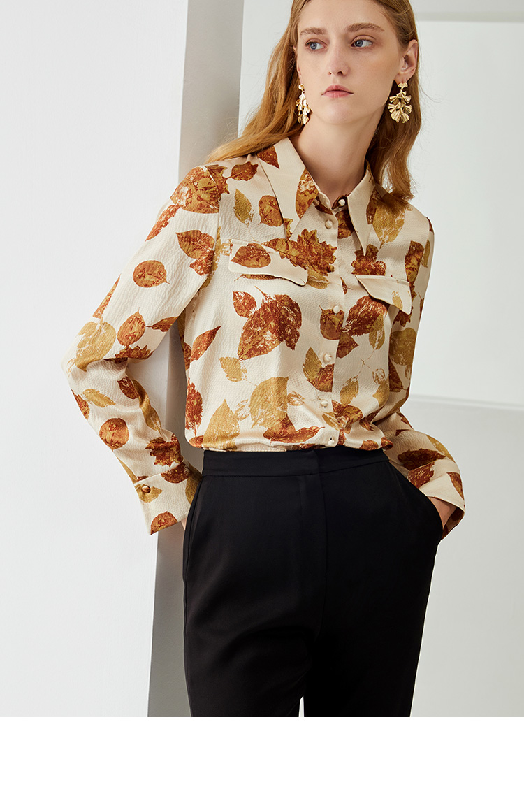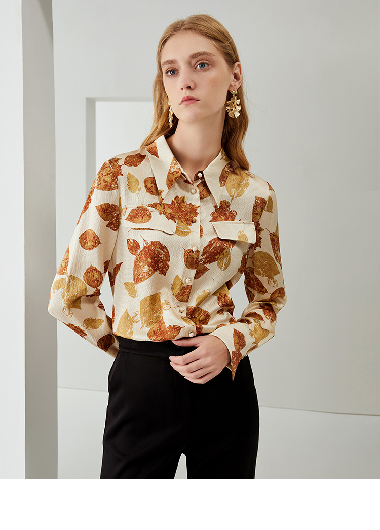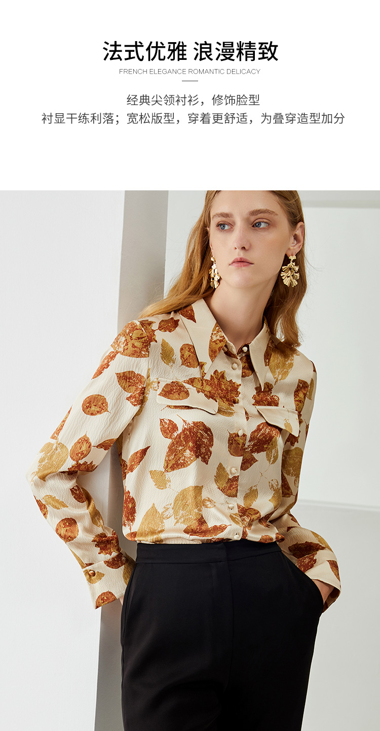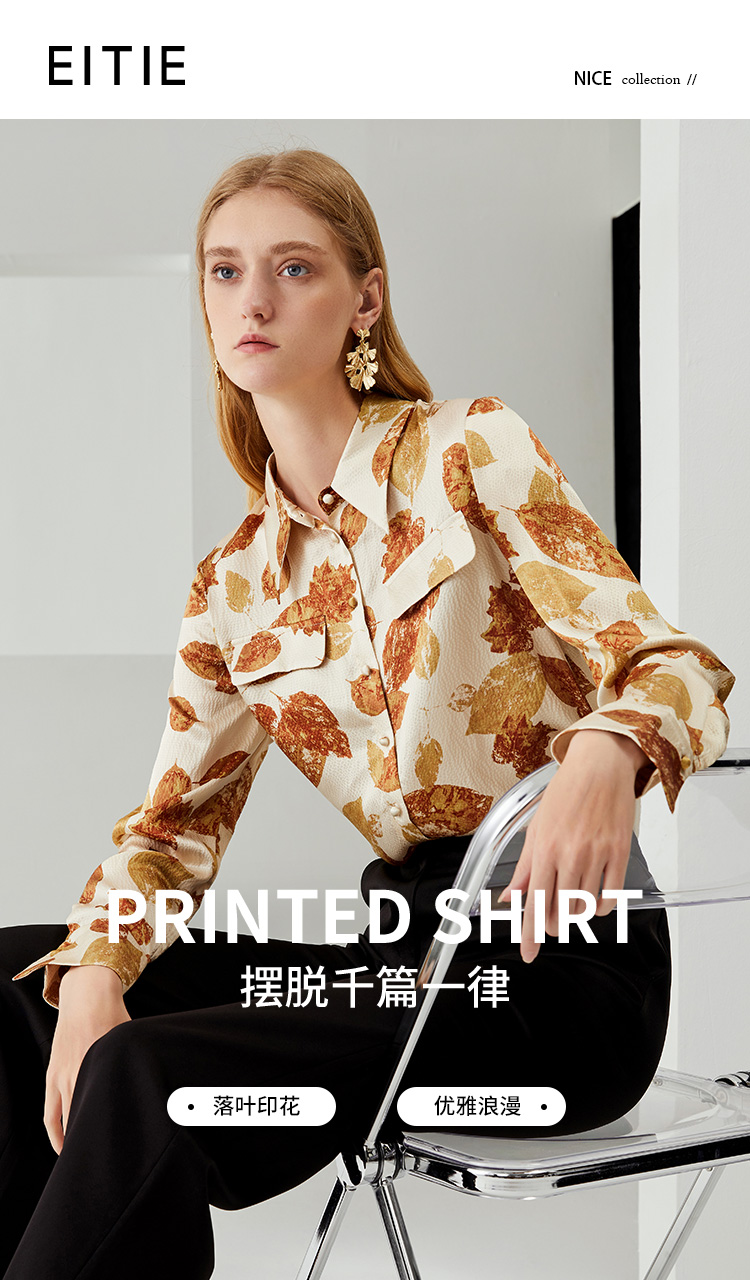 EITIE爱特爱秋季新款100%桑蚕丝女装宽松舒适枫叶印花衬衫上衣6709410