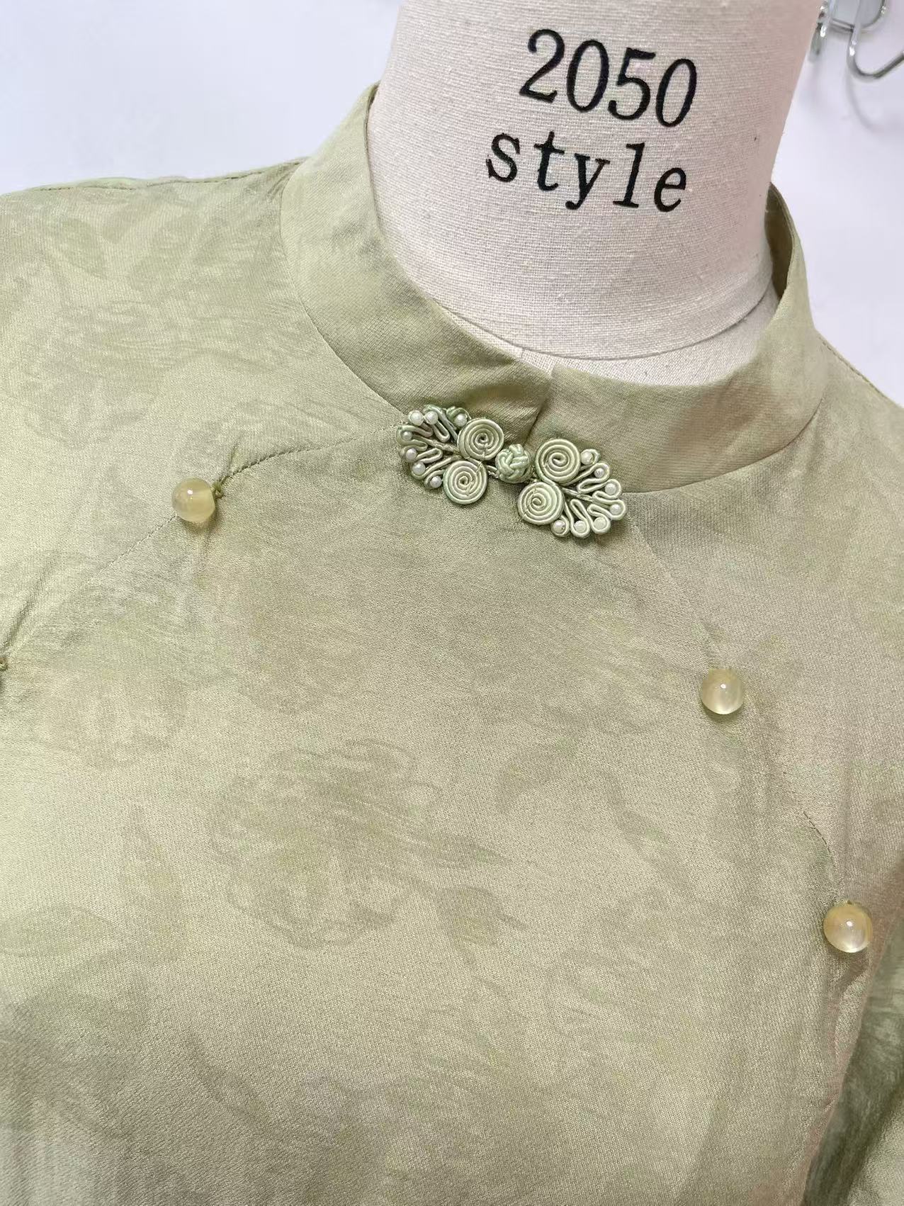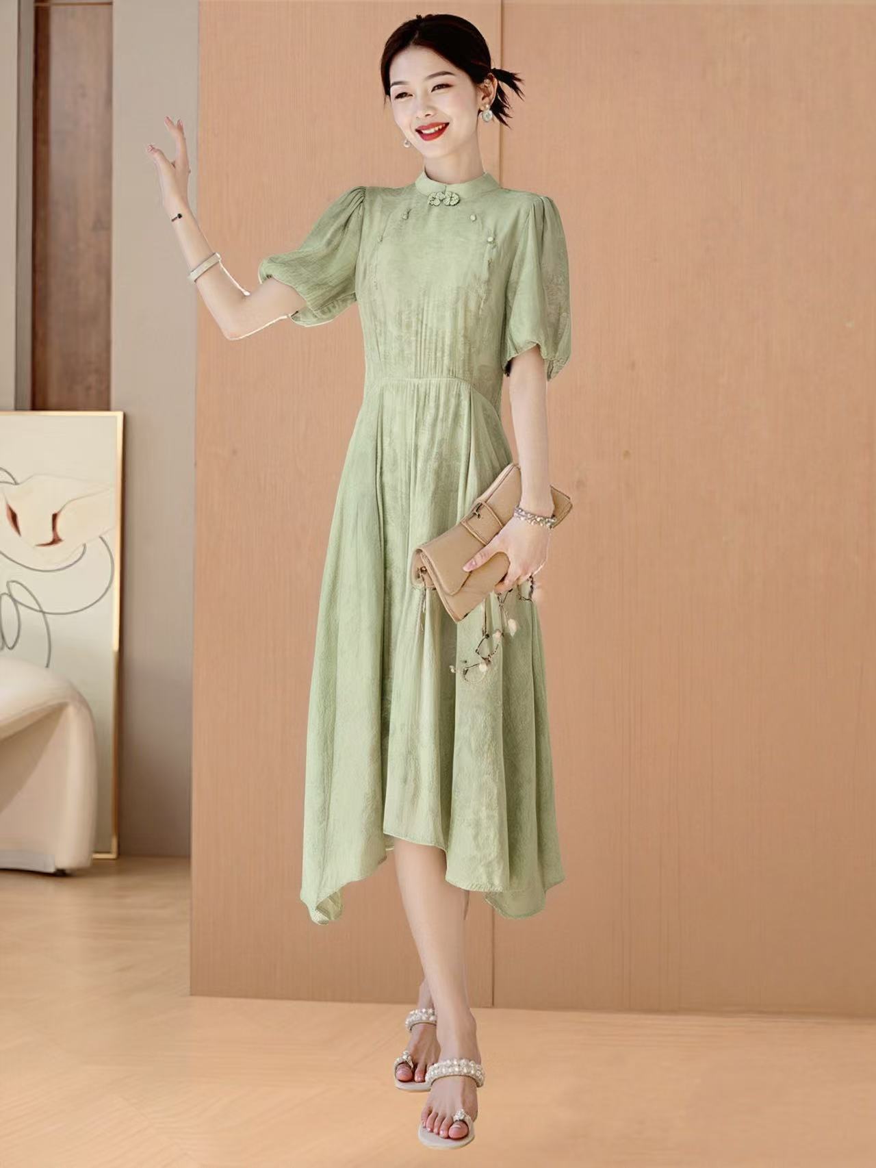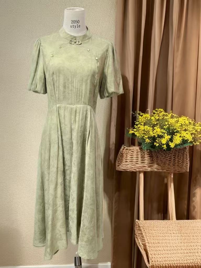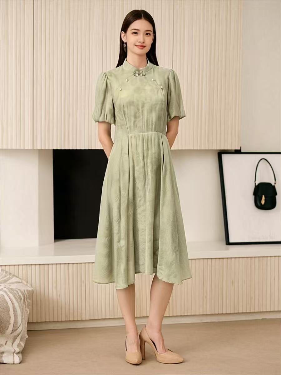 七夕福利-NO退【MYBL】(微瑕)8893暗纹泡泡袖新中式暗纹连衣裙-喜出