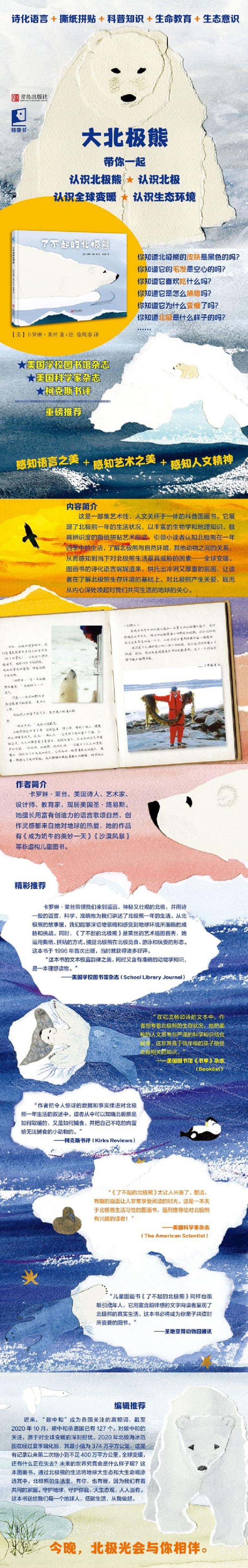 本书以撕纸的艺术形式展现了北极熊的生活习性,呼吁人们不要破坏北极熊的生存环境,为阻止全球变暖做出贡献,保护自然生态环境,是一本具有教育意义的图画书。