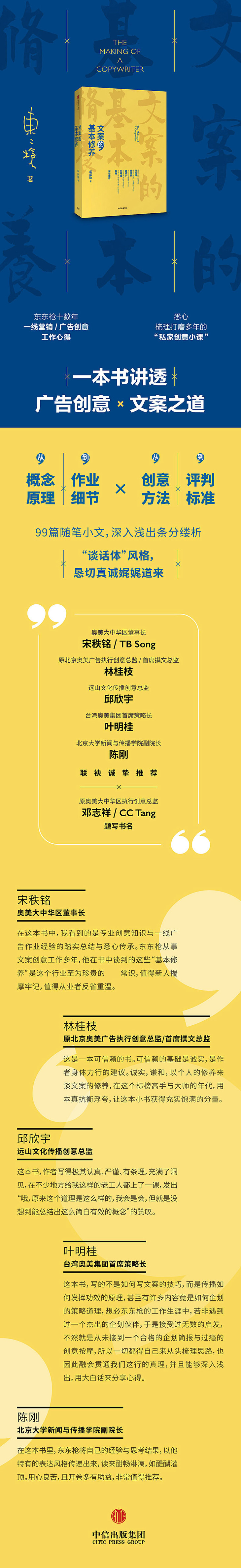 !!重量级大咖背书推荐:奥美大中华区董事长宋秩铭(TBSong)、原北京奥美广告执行创意总监/首席撰文总监林桂枝、远山文化传播创意总监邱欣宇、台湾奥美集团首席策略长叶明桂、北京大学新闻与传播学院副院长陈刚联袂诚挚推荐;原奥美大中华区执行创意总监邓志祥(CCTang)题写书名。