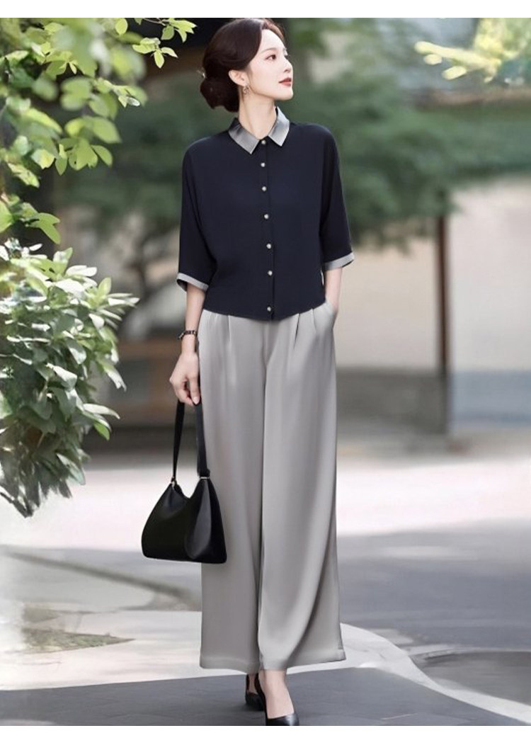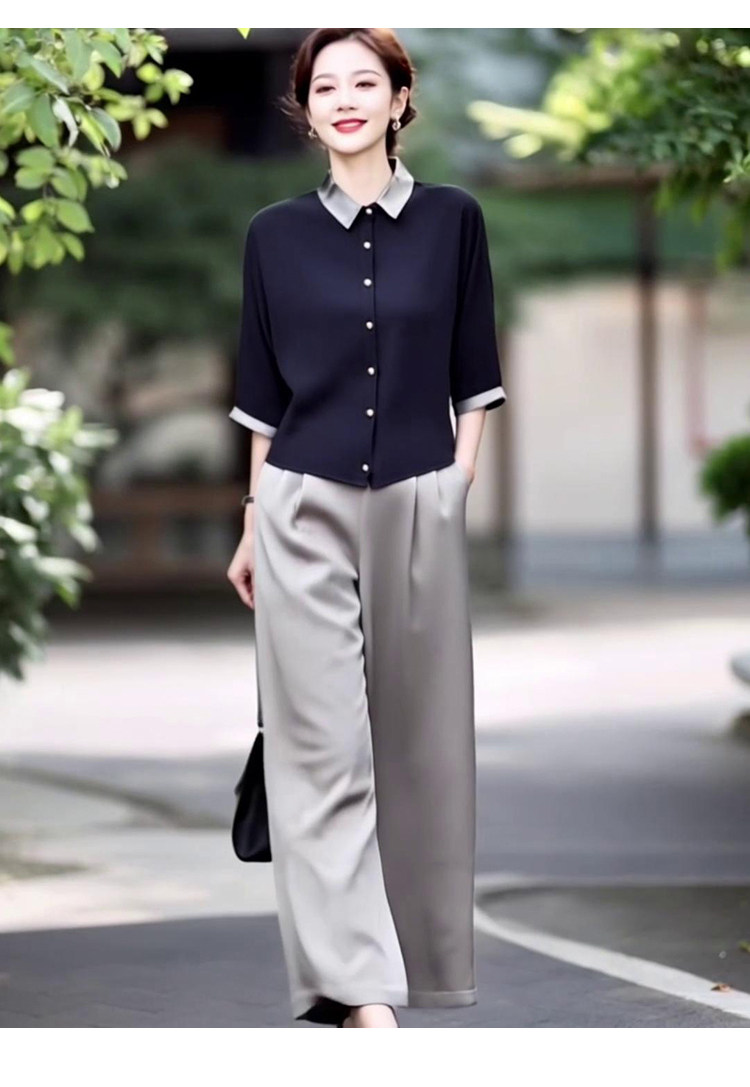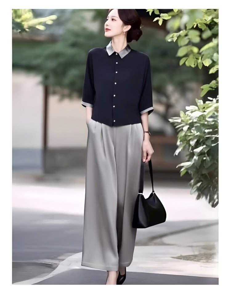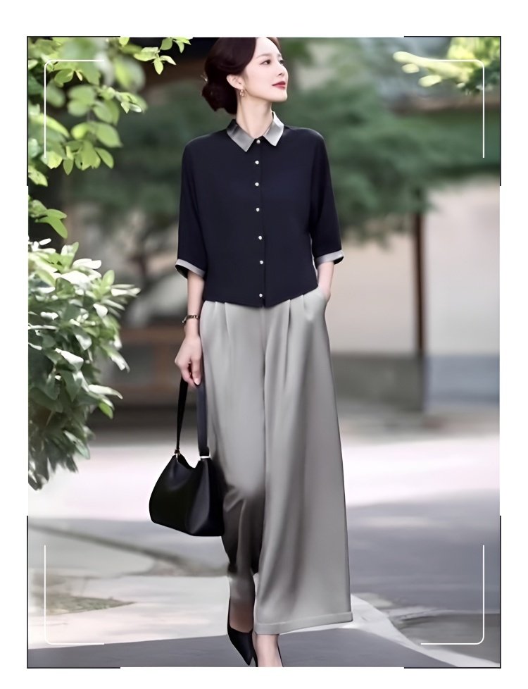 新款轻熟优雅气质纯色撞色上衣+高腰阔腿裤两件套