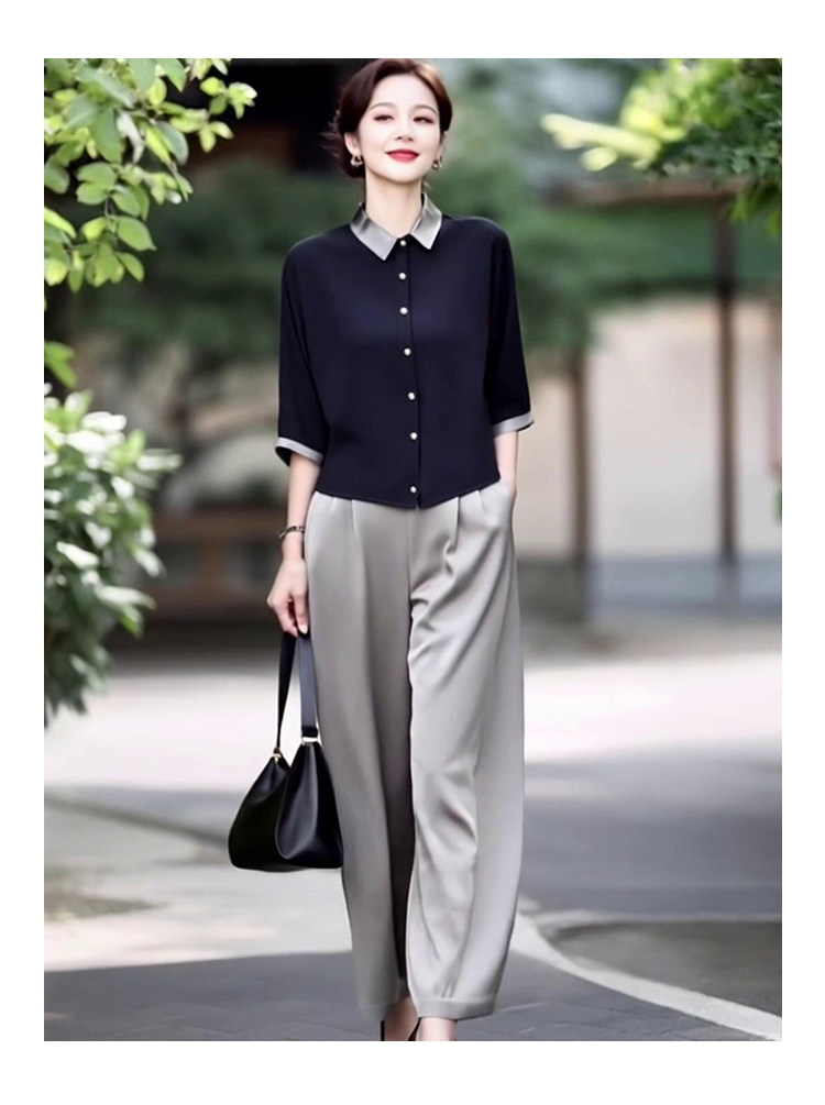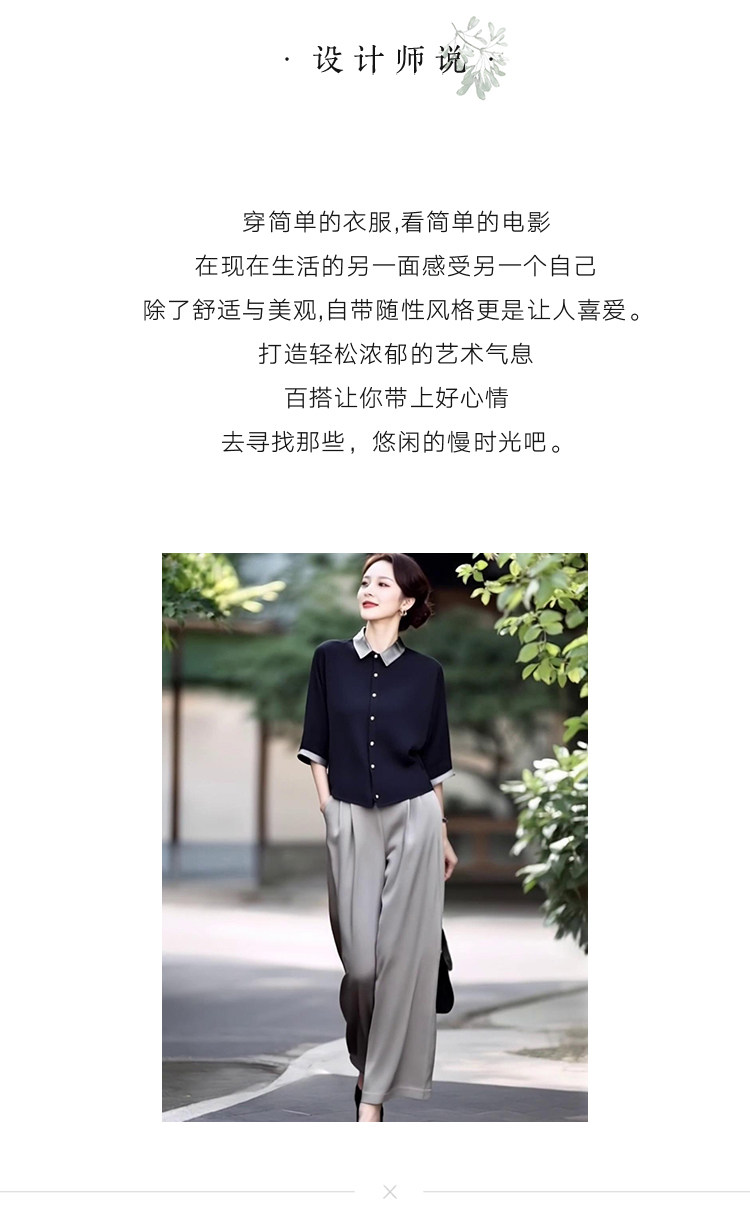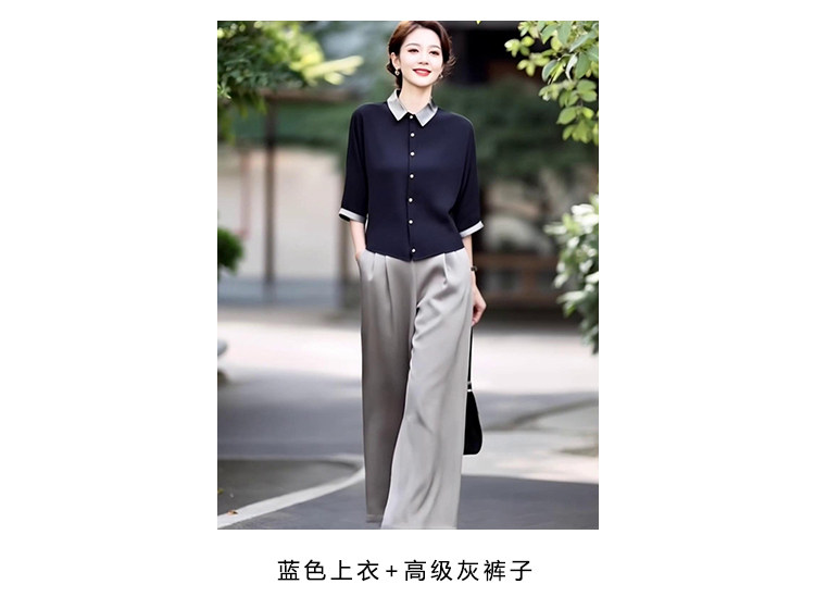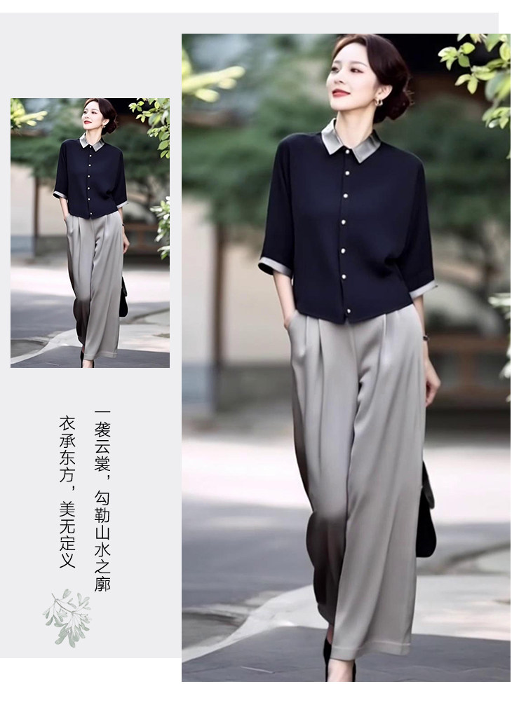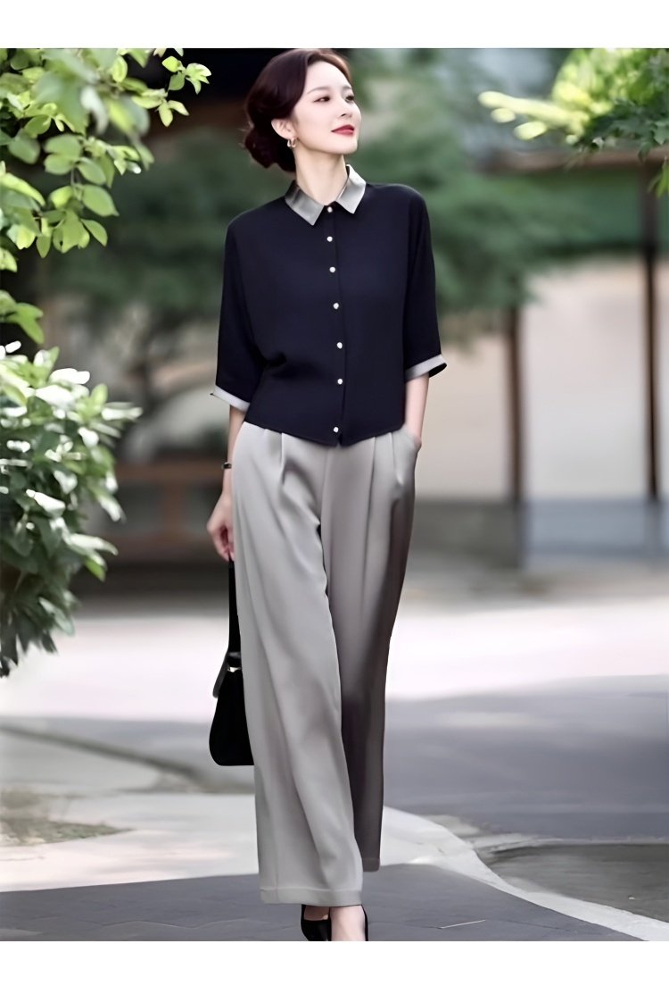 新款轻熟优雅气质纯色撞色上衣+高腰阔腿裤两件套