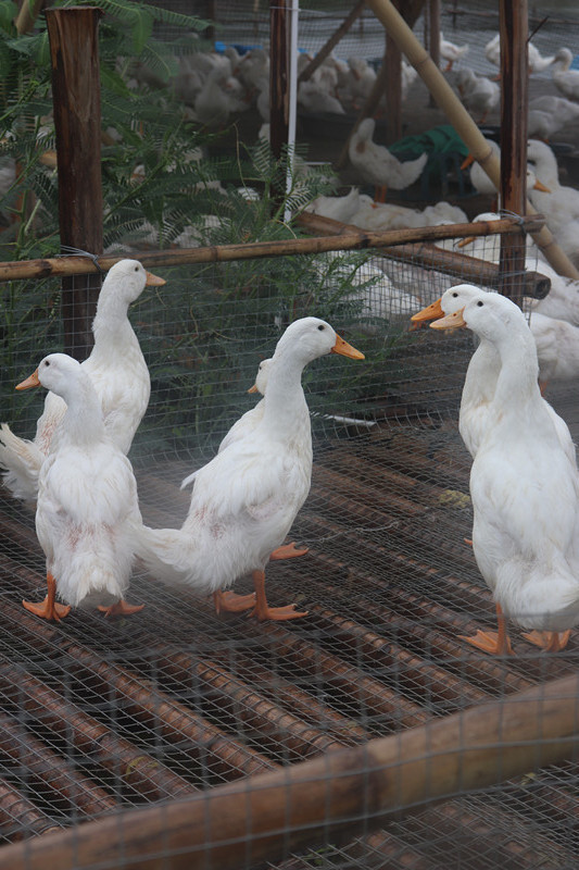 池塘内的养殖密度低,我们不使用激素、动物饲料、抗生素等。除了吃菜和草,还会补饲花生麸、玉米、米碎的哟,这样的鸭肉是紧实的。