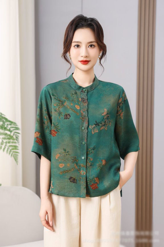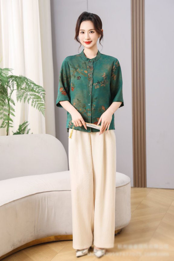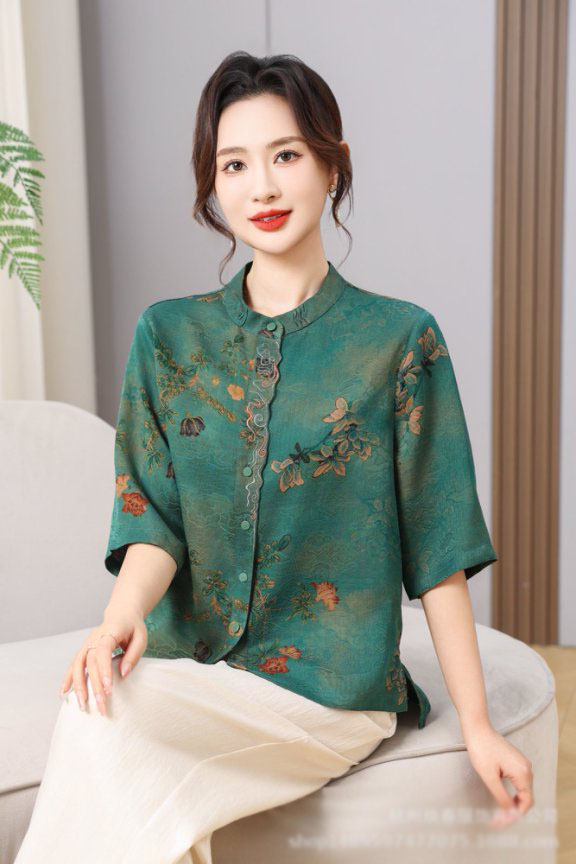 丁摩真丝香云纱中袖圆领开衫上衣夏装洋气新款花萝100桑蚕丝AL5110