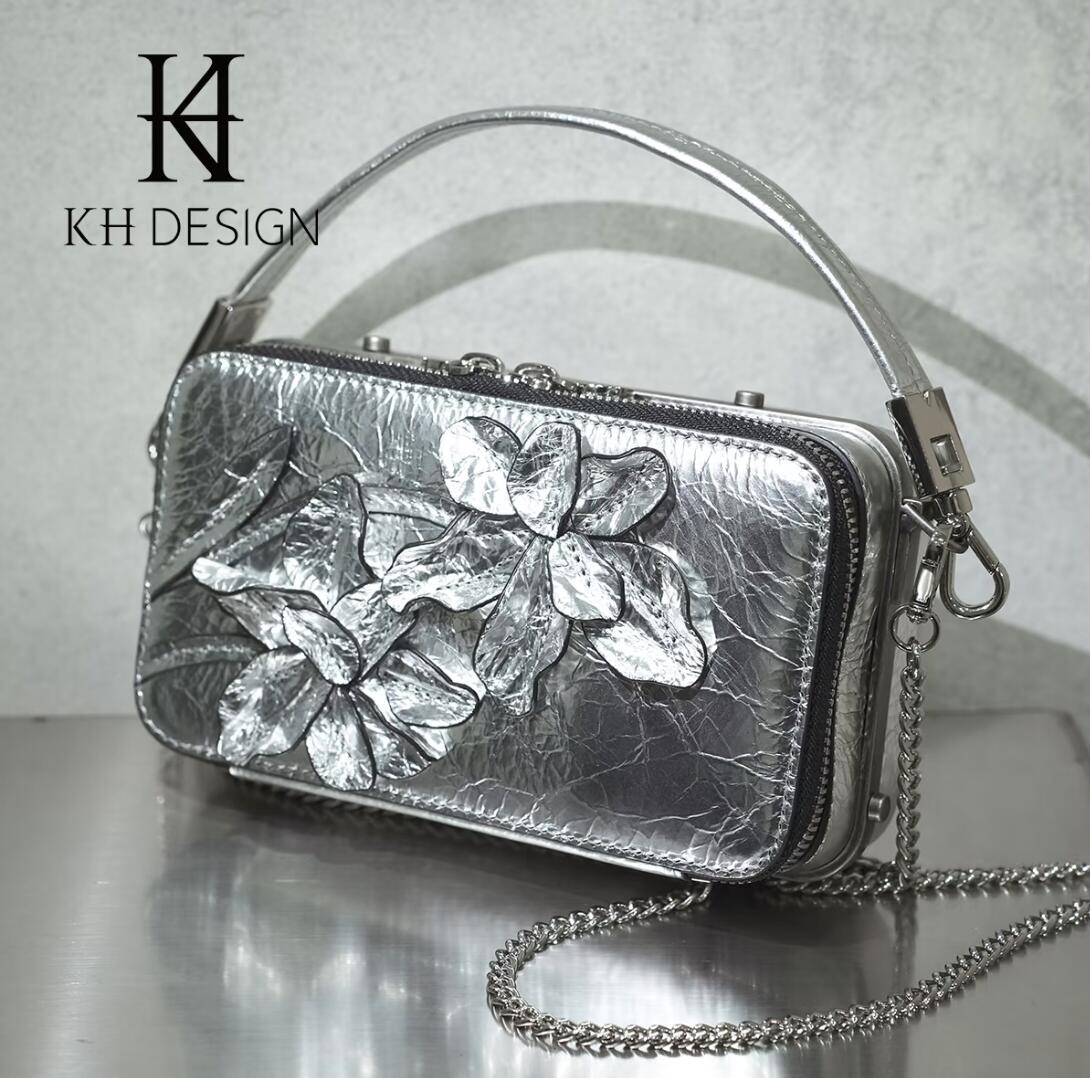 明治真皮立体花卉盒子手提包
