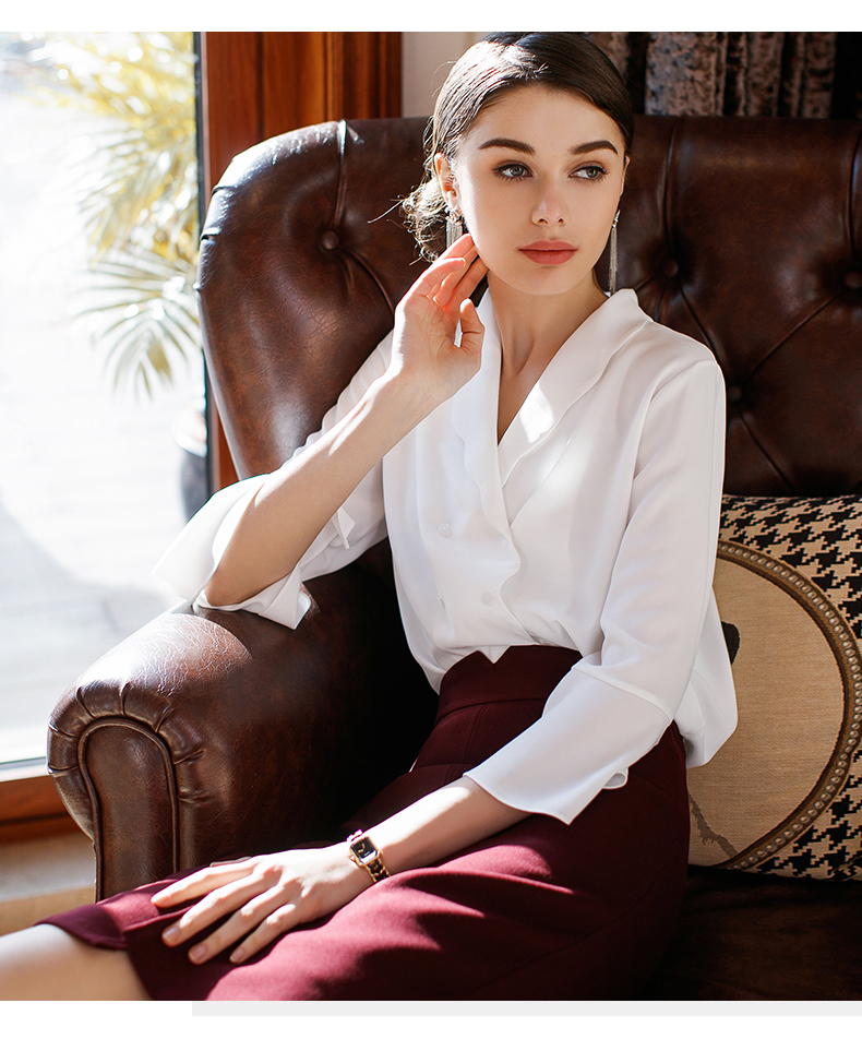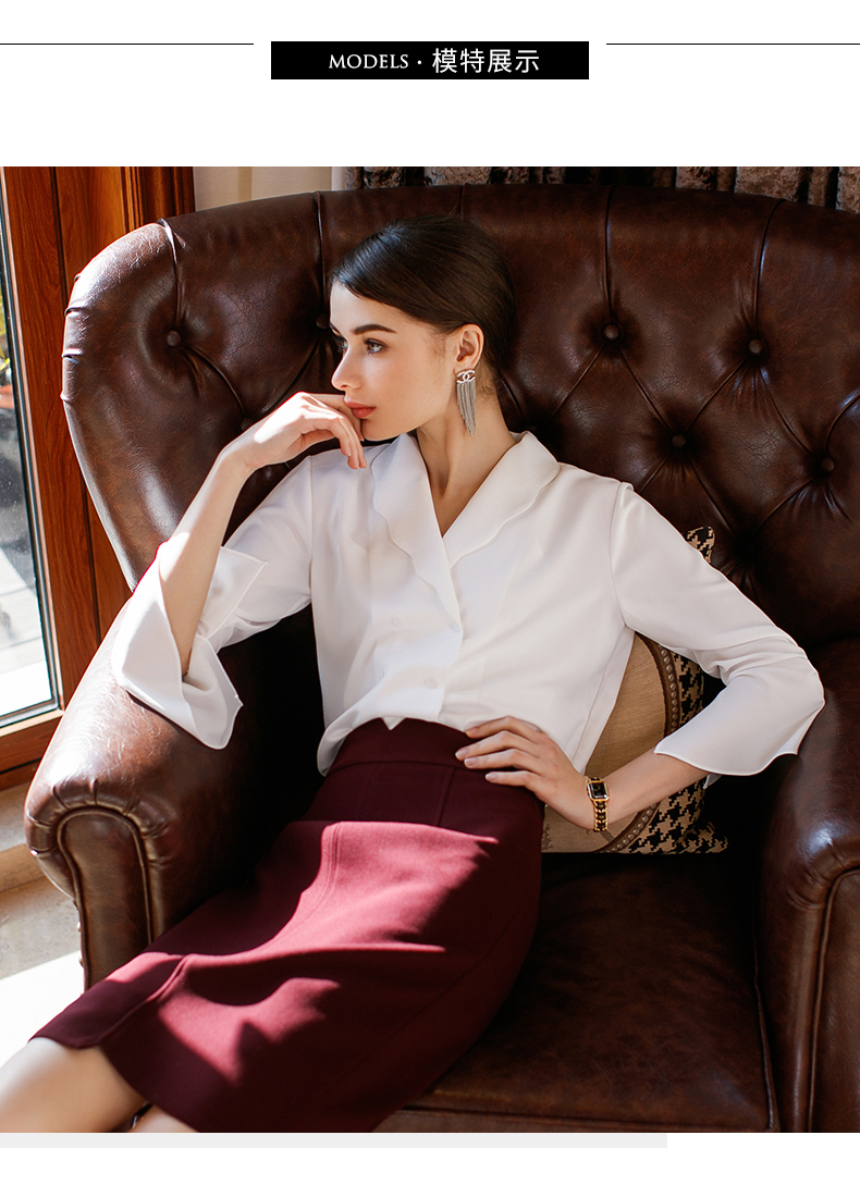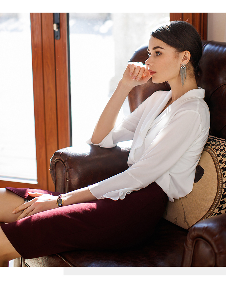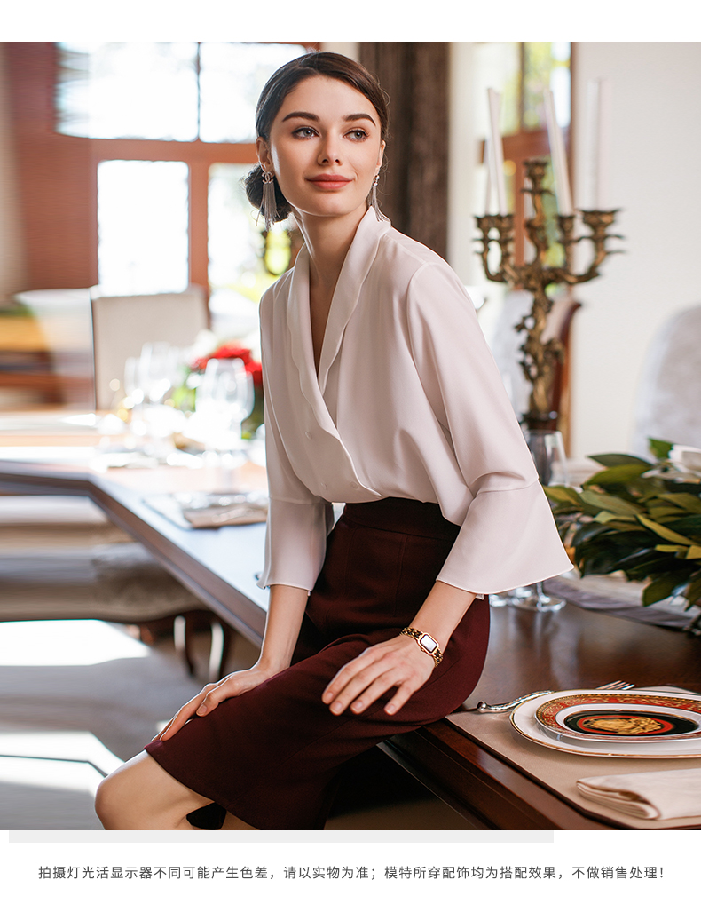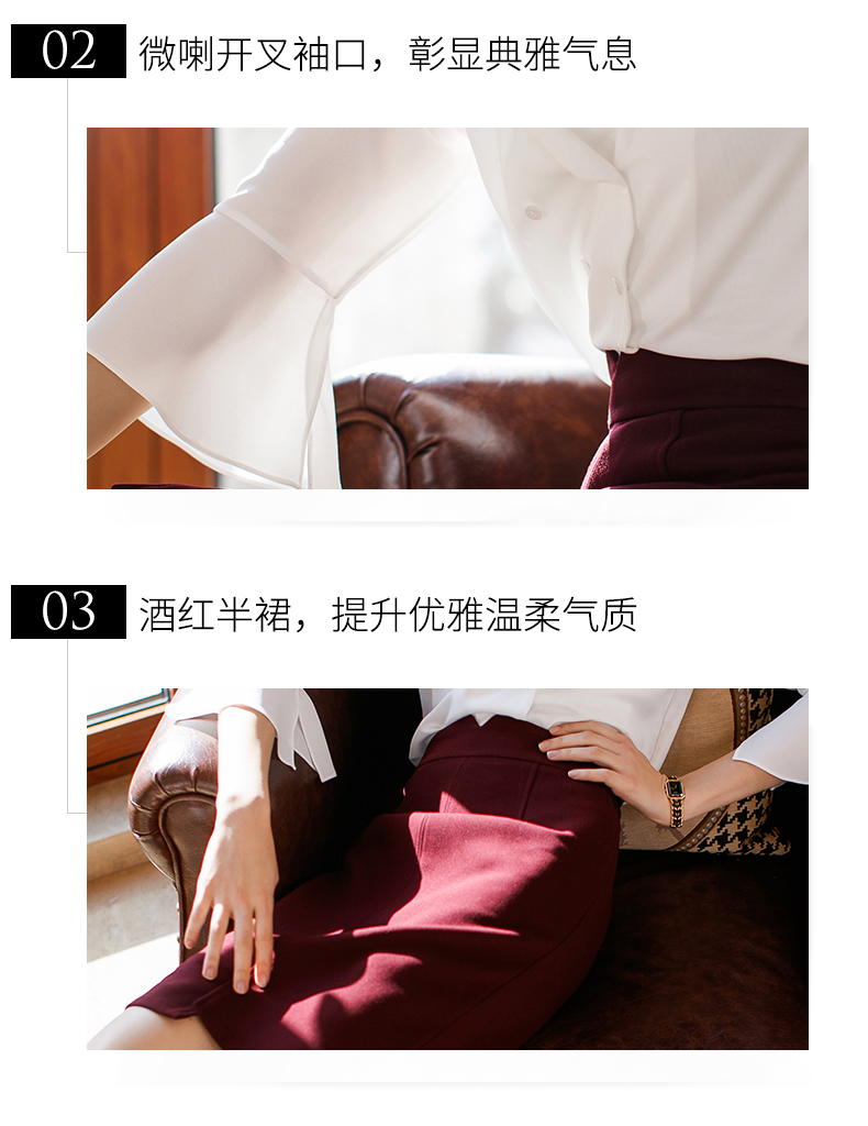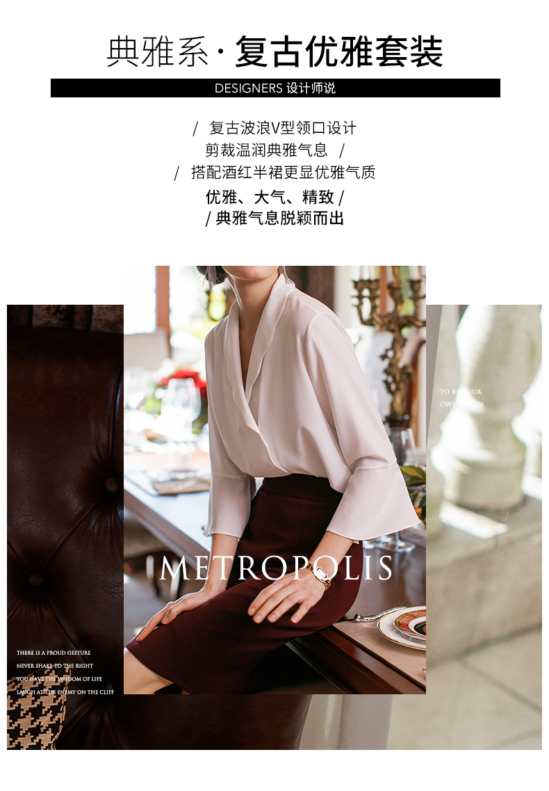 IWY/时尚职业装女式衬衫气质白色V领长袖气质酒红色半裙套装B58+S243