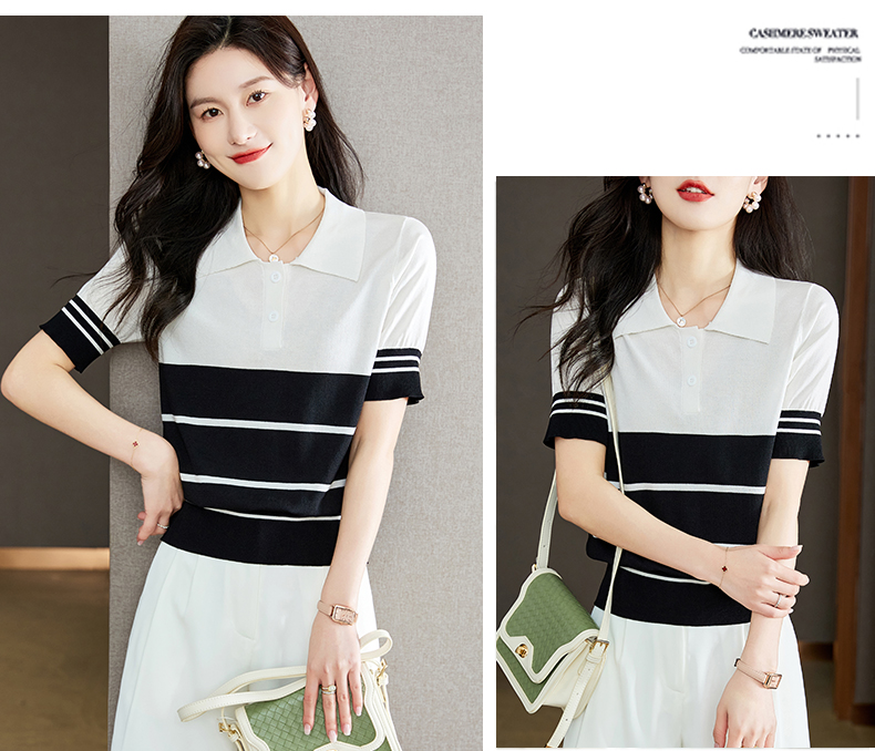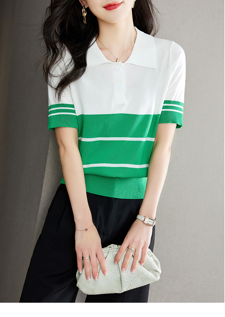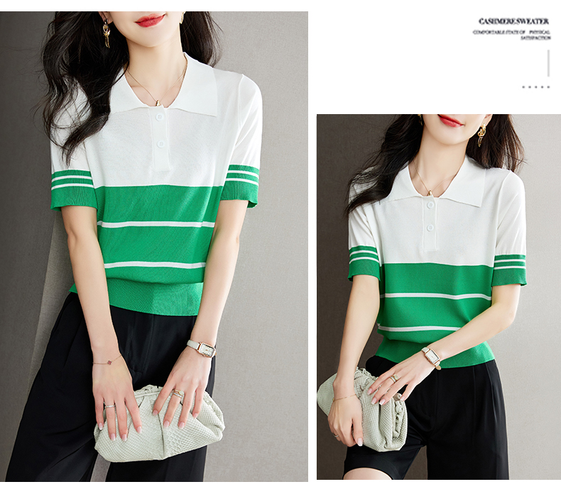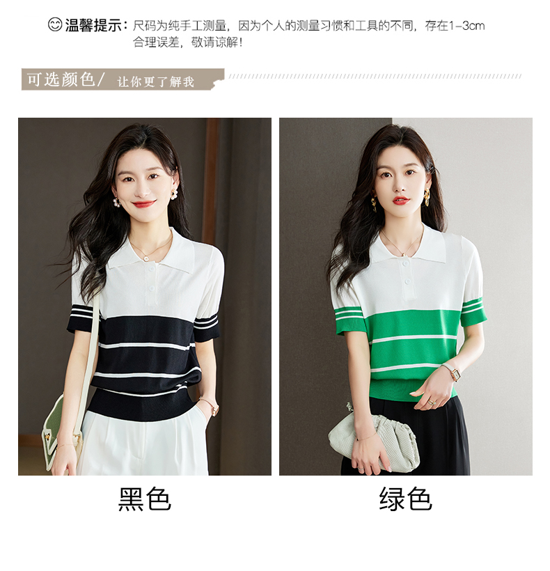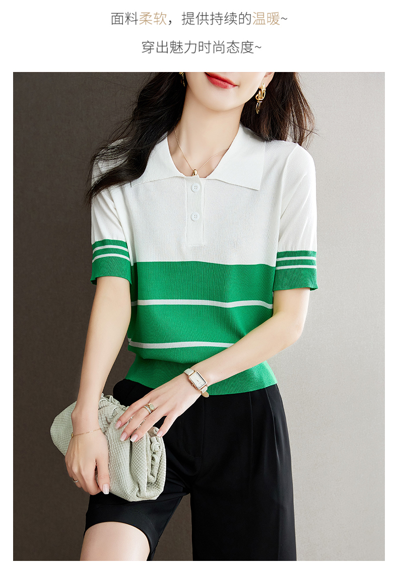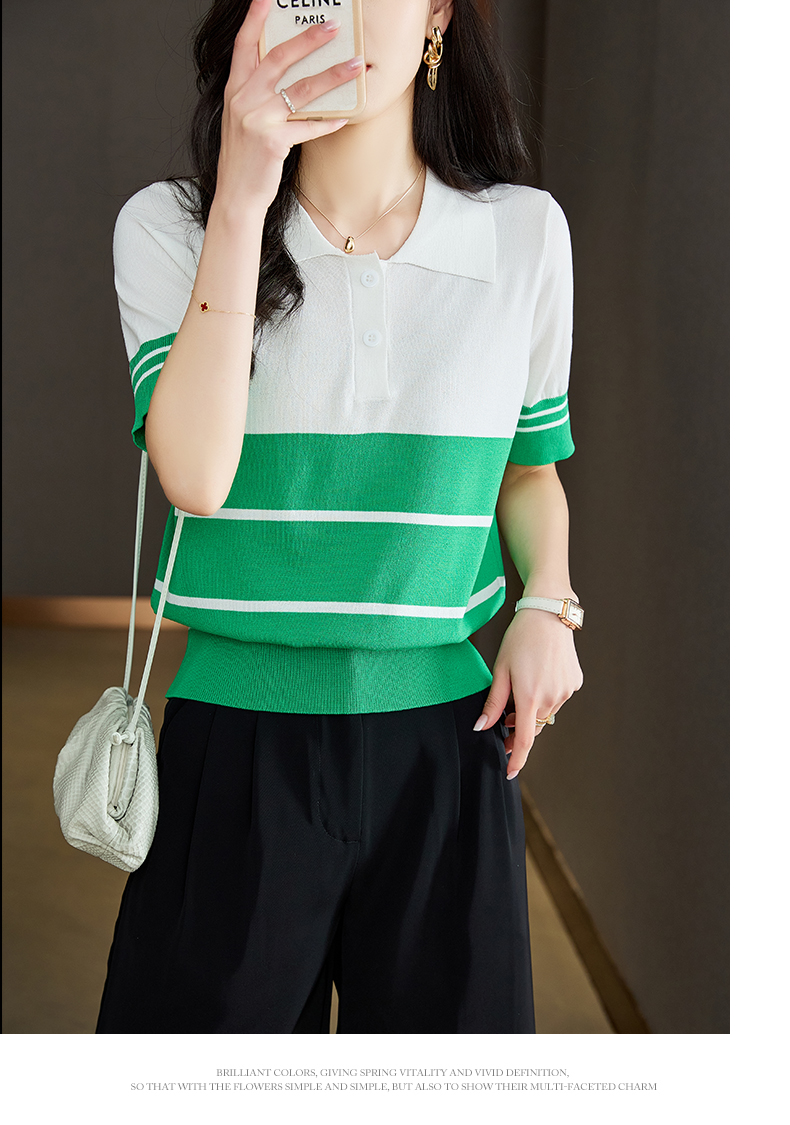 宽松撞色,短袖套头薄款翻领t恤打底冰丝针织衫CC-J211