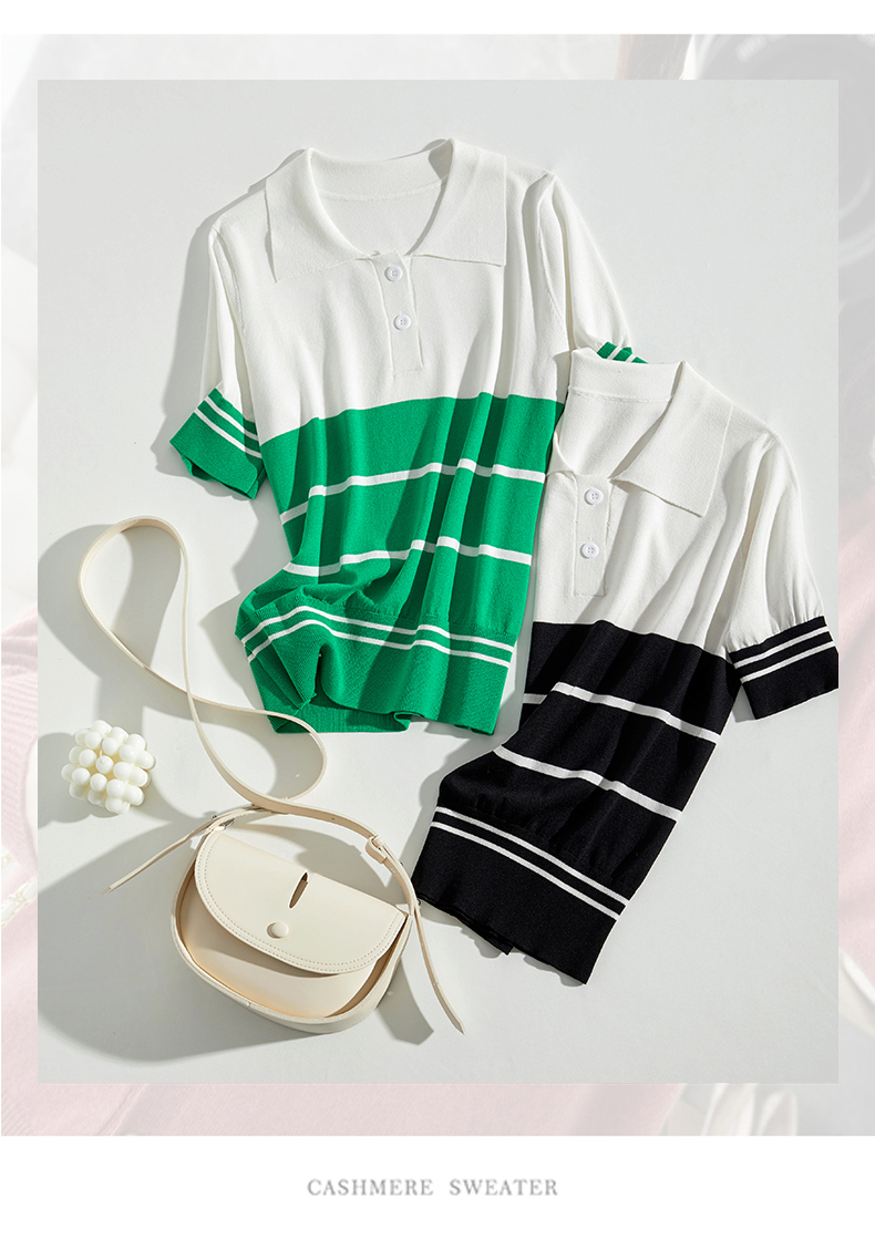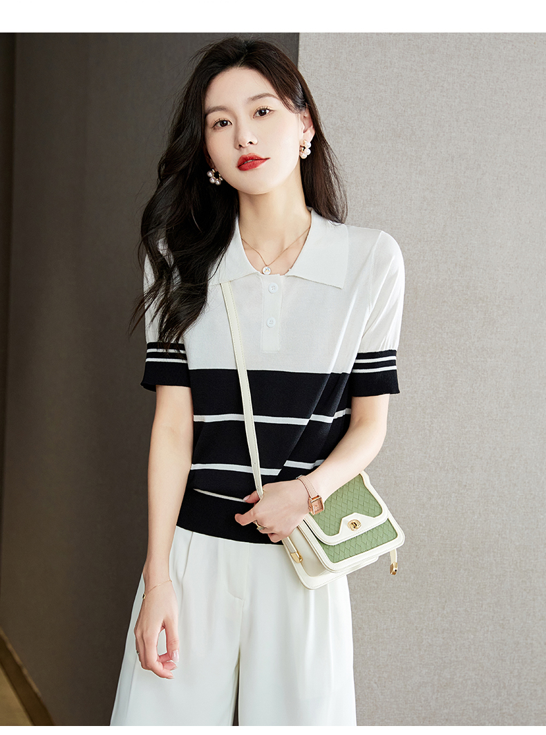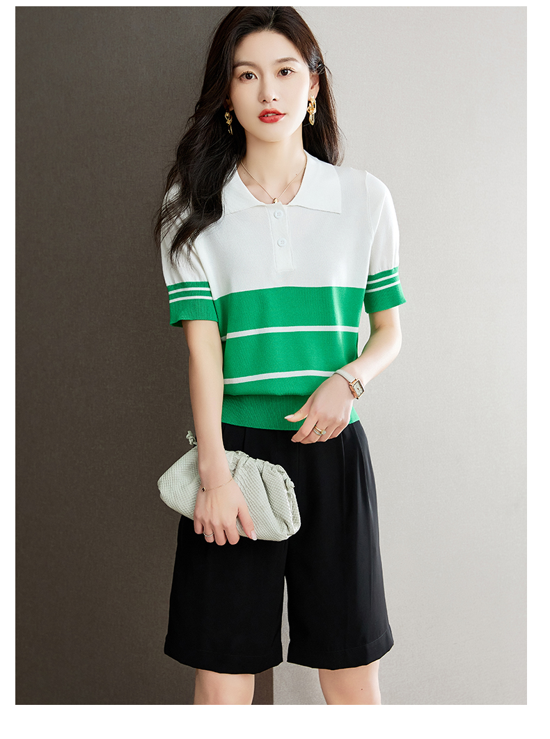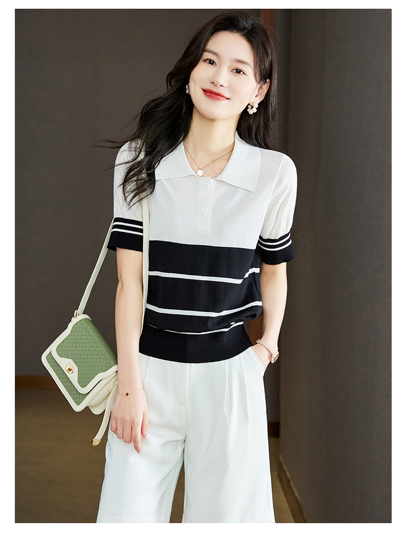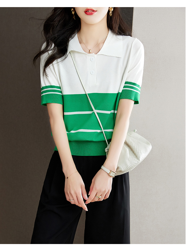 宽松撞色,短袖套头薄款翻领t恤打底冰丝针织衫CC-J211
