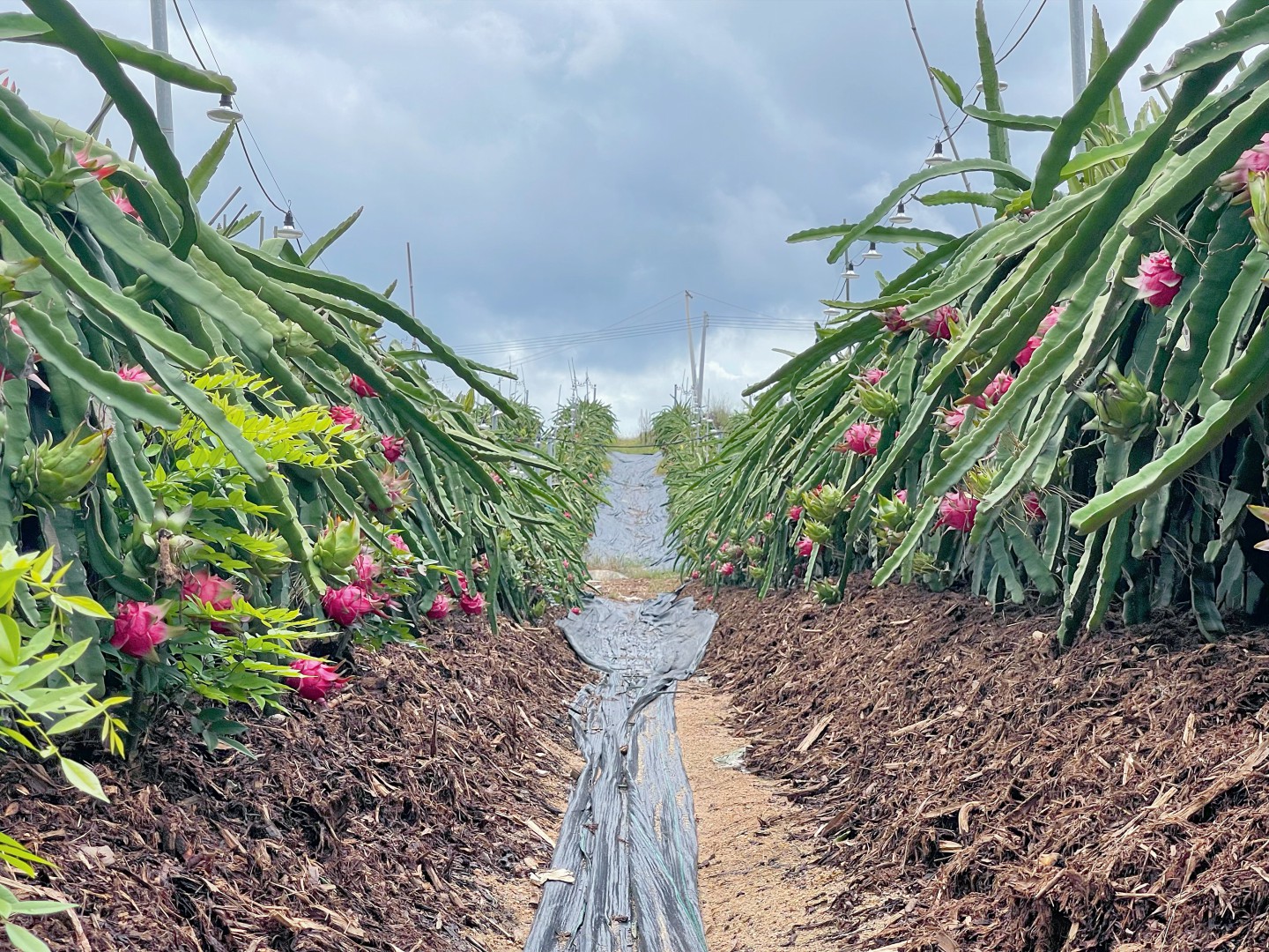 以地膜覆盖间隙可以物理抑制杂草的生长,同时对火龙果可以进行辅助保温的作用,并且火龙果之间的间隙有利于果地进行排水管理