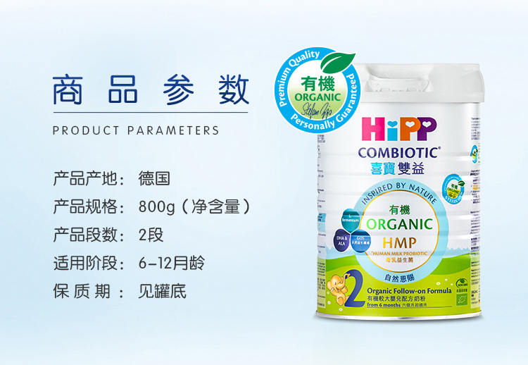 喜寶HiPP 有機HMP母乳益生菌+益生元較大嬰兒配方奶粉 2段( 800g)德国原罐进口