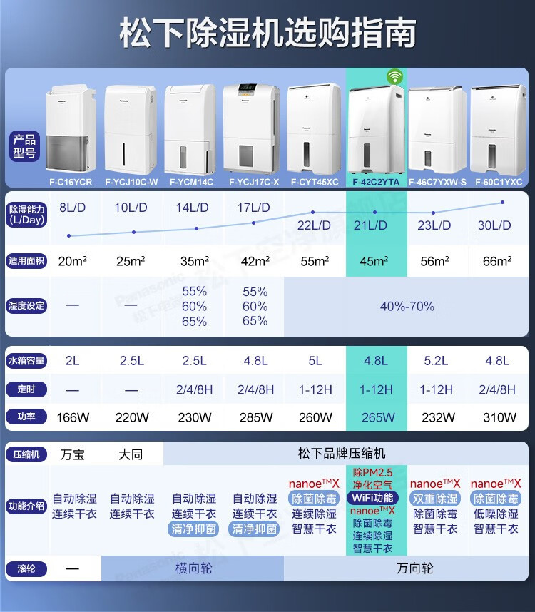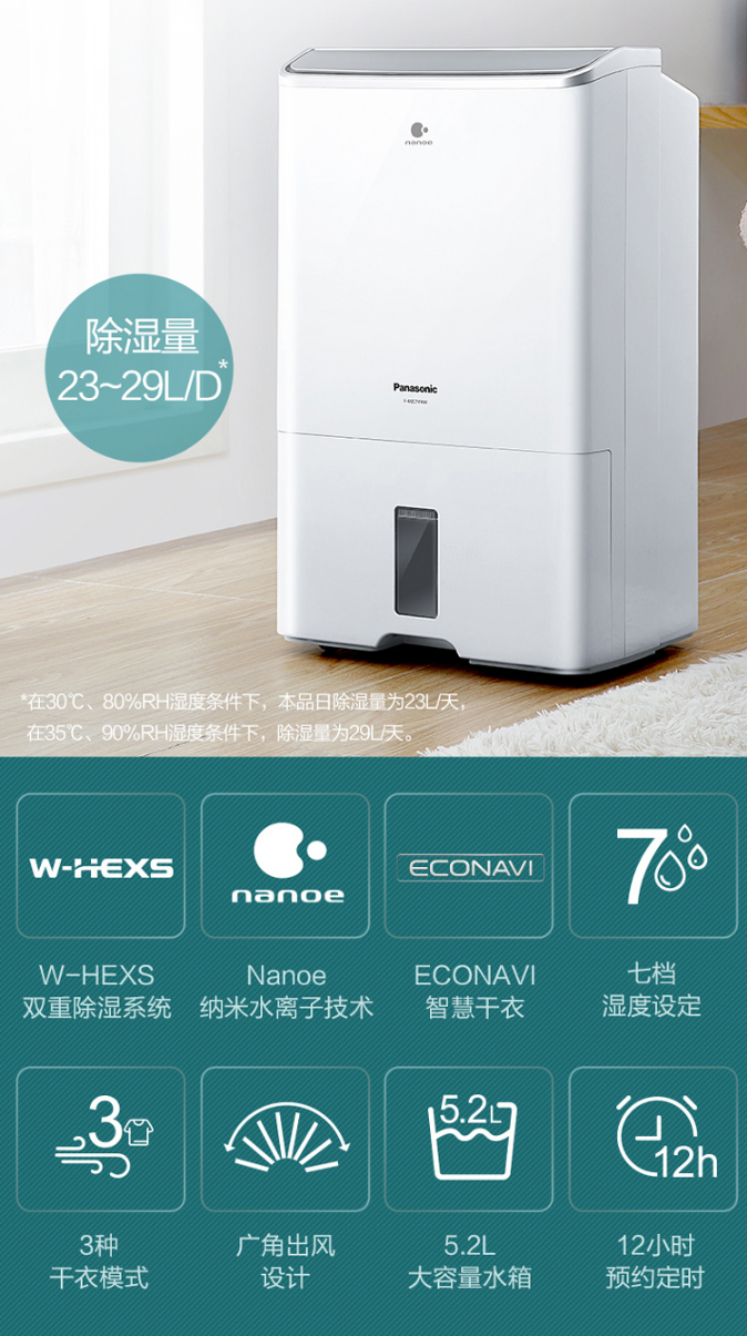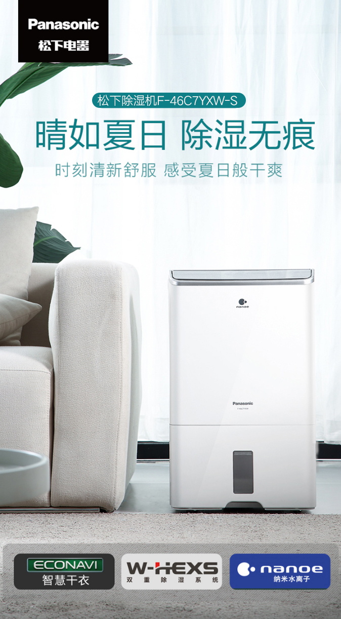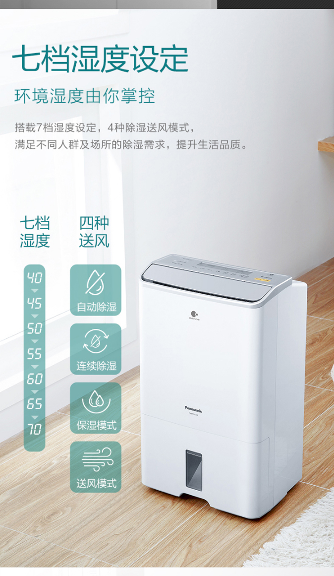 松下(Panasonic) 除湿机 抽湿机 日除湿23升家用别墅客厅地下室低音省电纳诺怡除菌抑霉干衣 F-46C7YXW-S