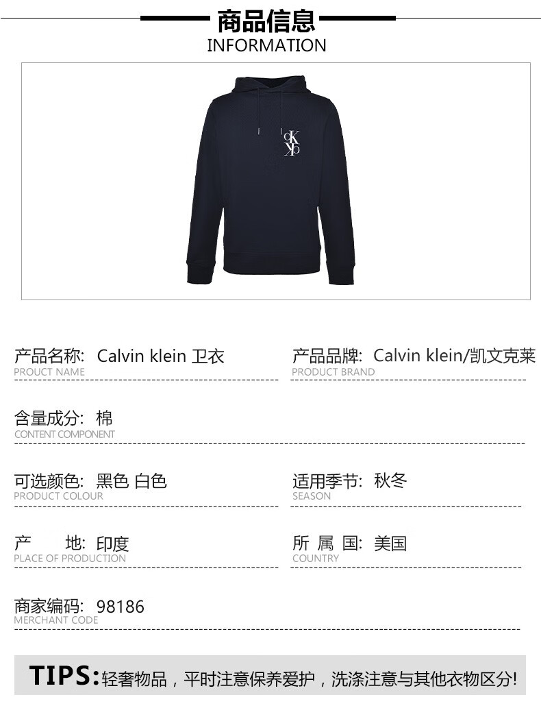 【特惠秒】卡尔文·克莱恩(Calvin Klein)凯文克莱()CK男装 时尚潮流男士休闲连帽卫衣 98186