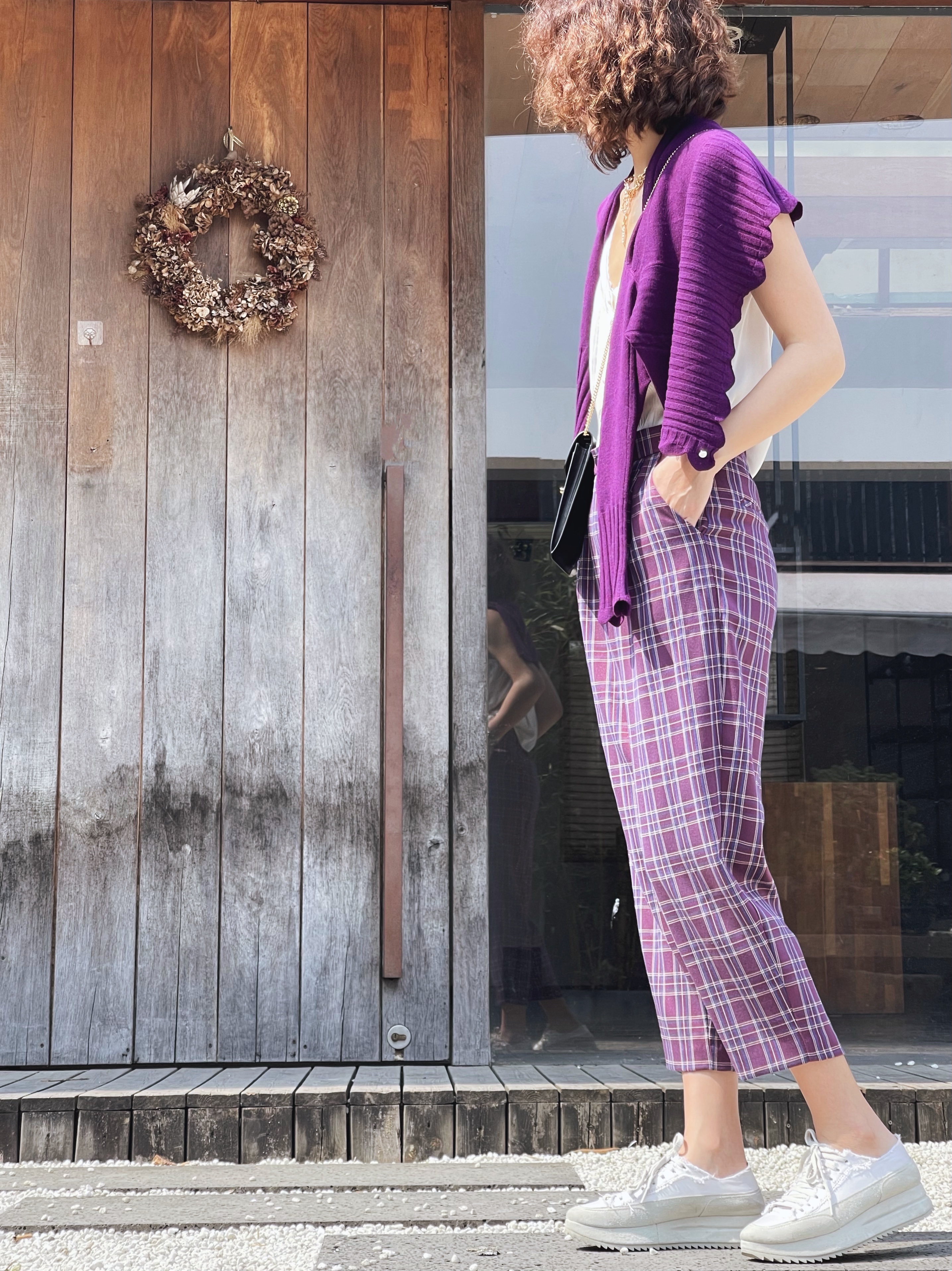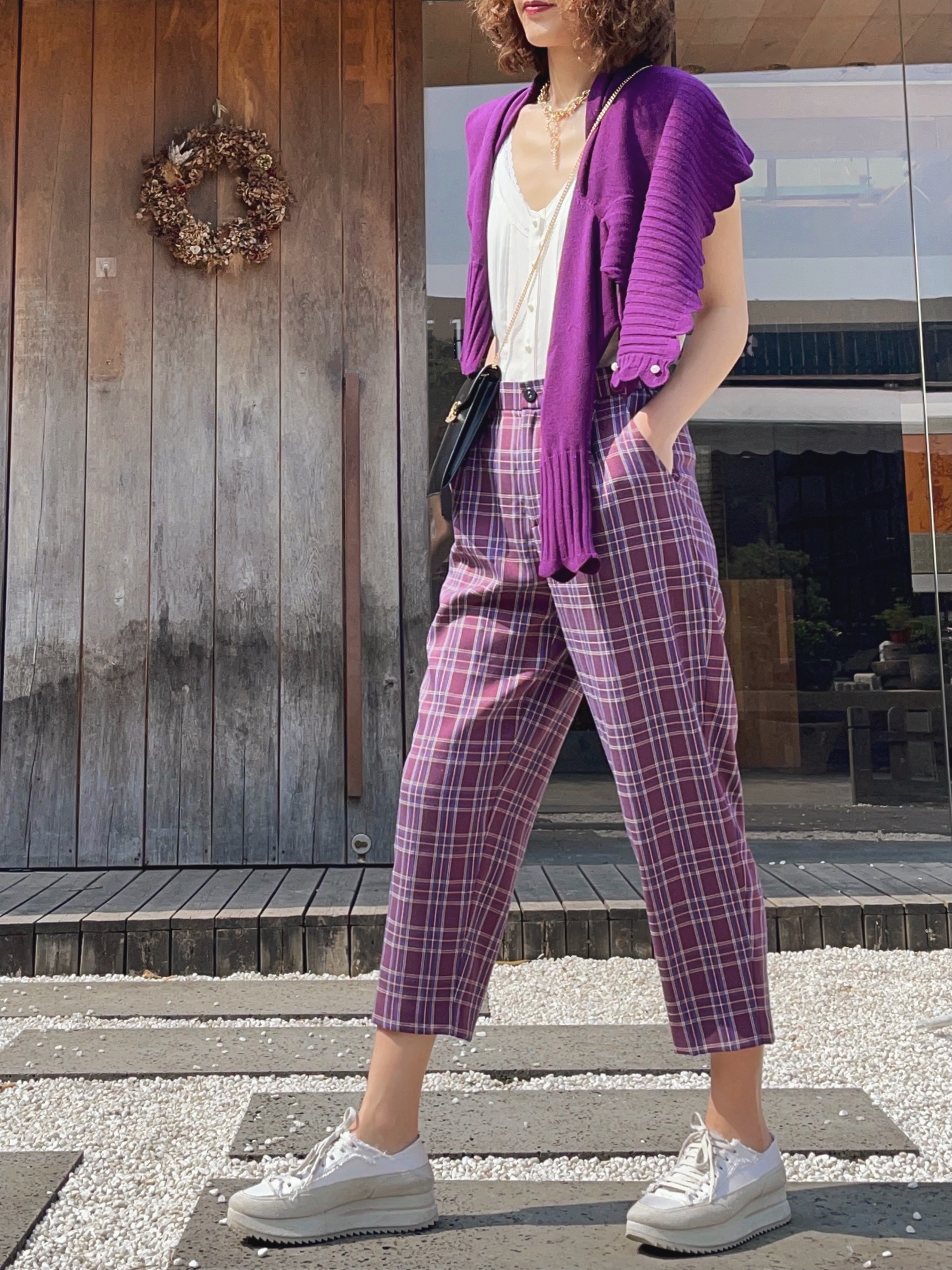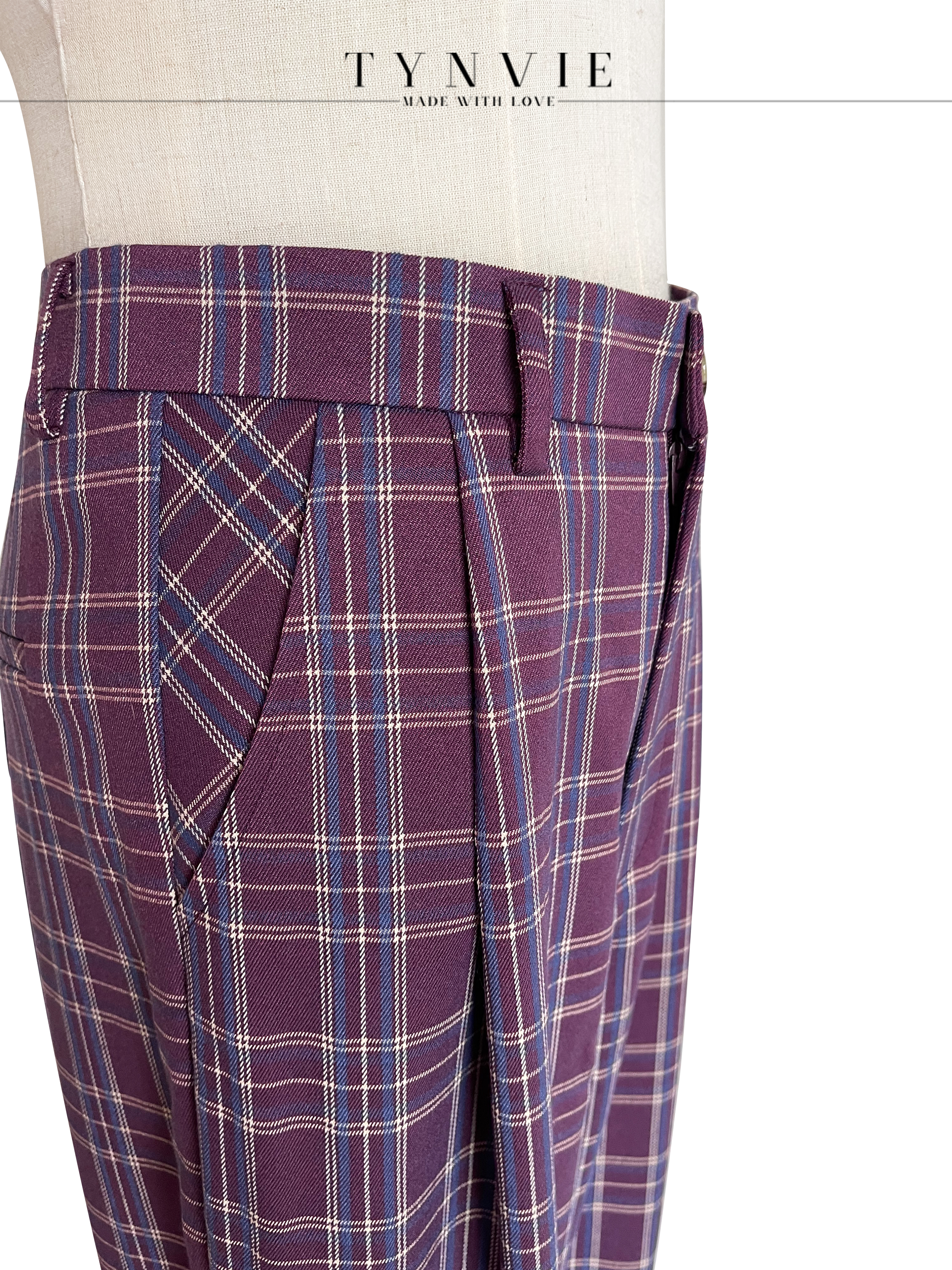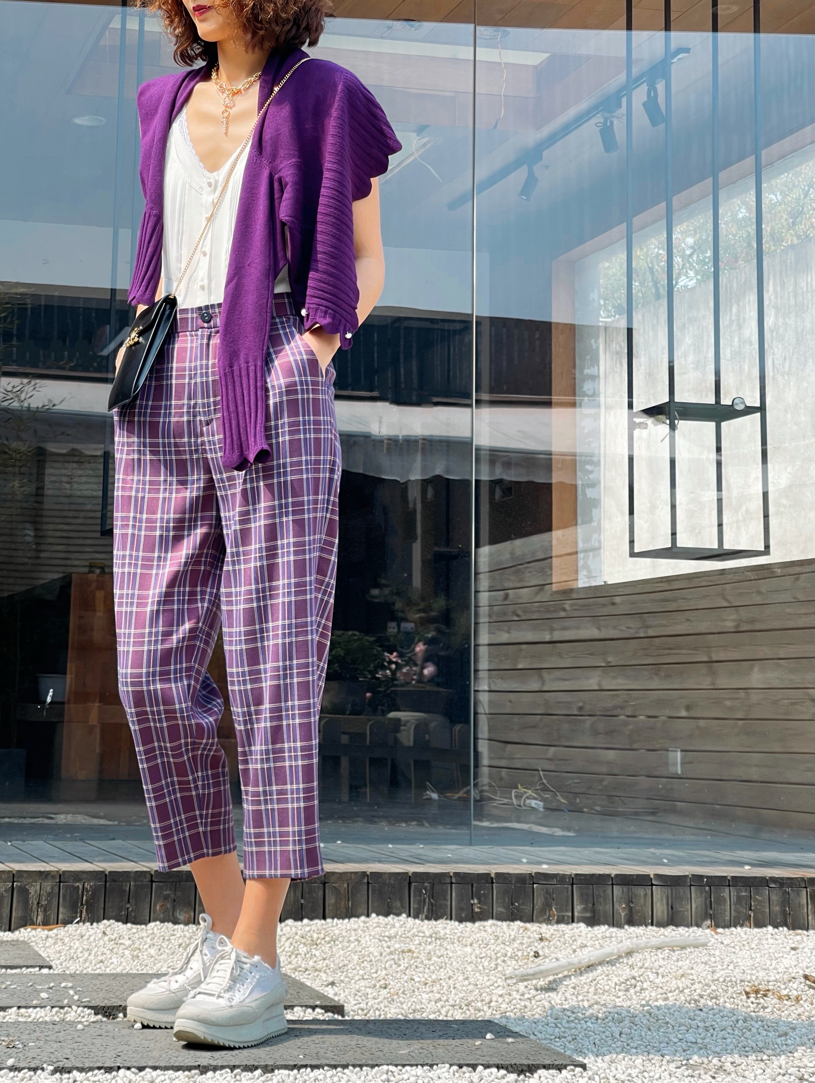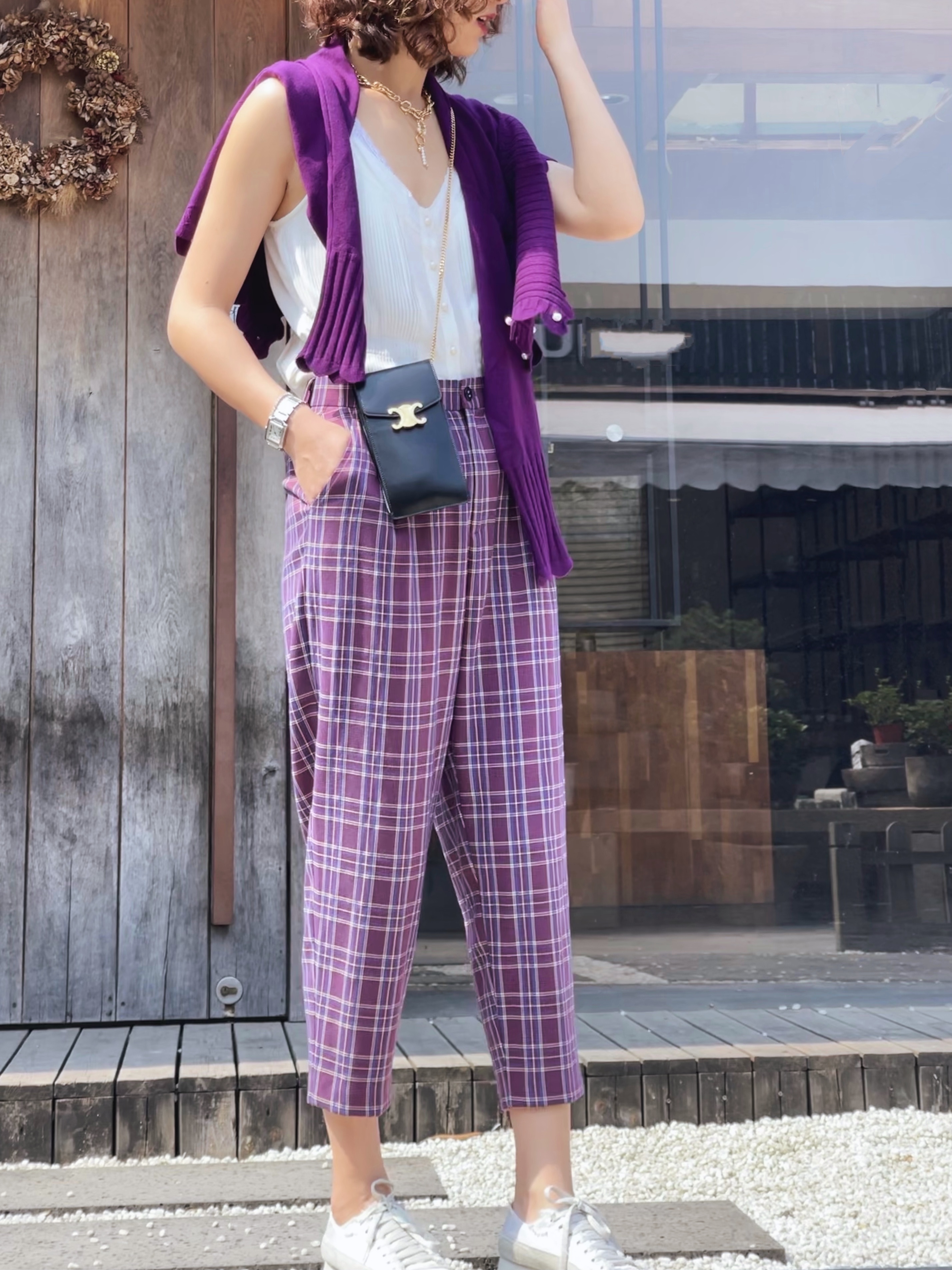 TYNVIE插袋9分萝卜裤-紫格纹