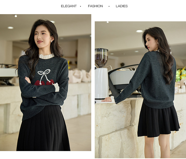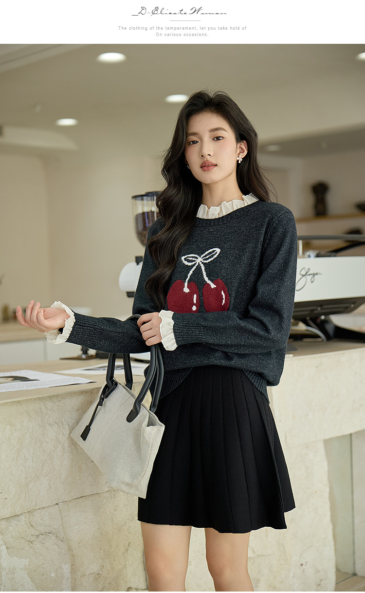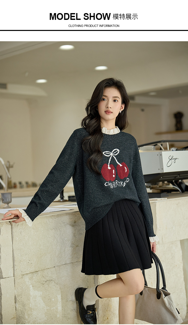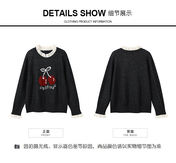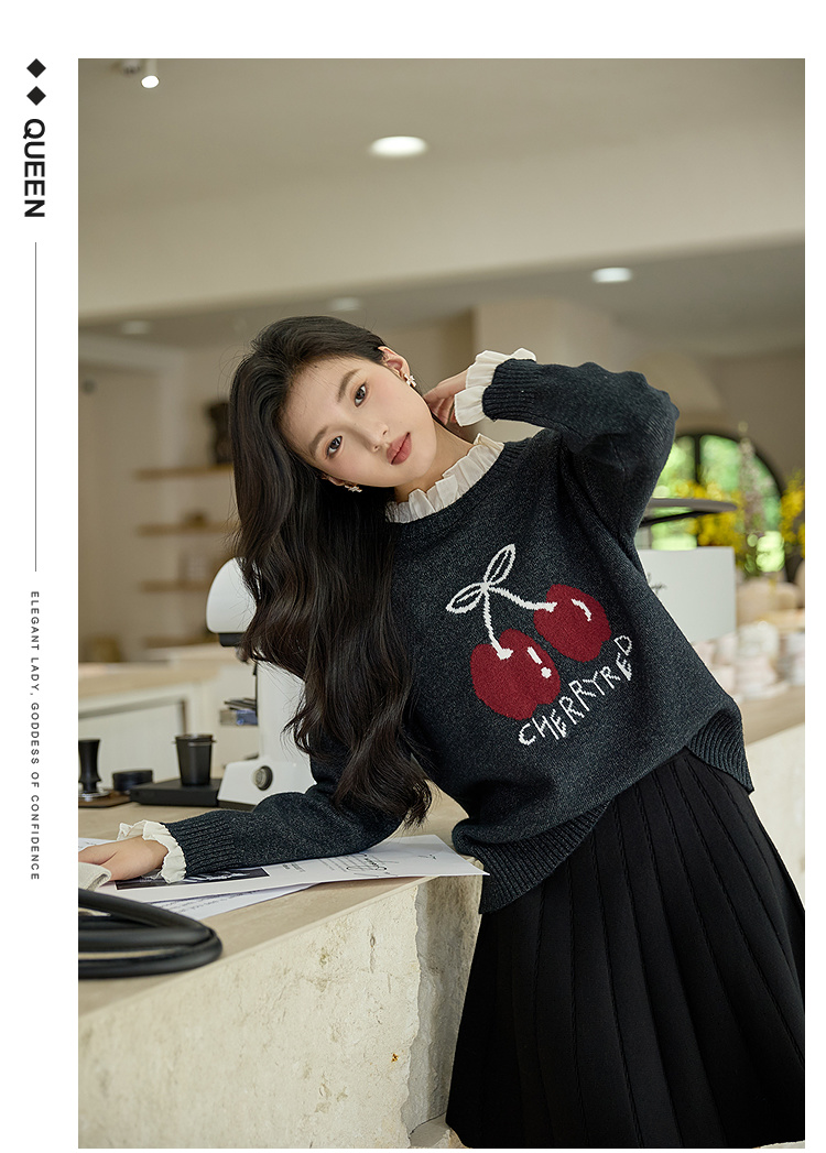 奢姿大码女装2025秋季胖妹妹时尚减龄樱桃图案气质花边装饰针织衫9653653643