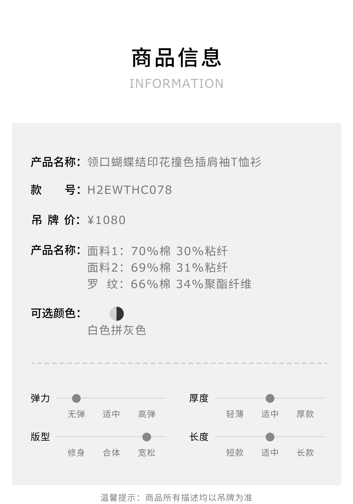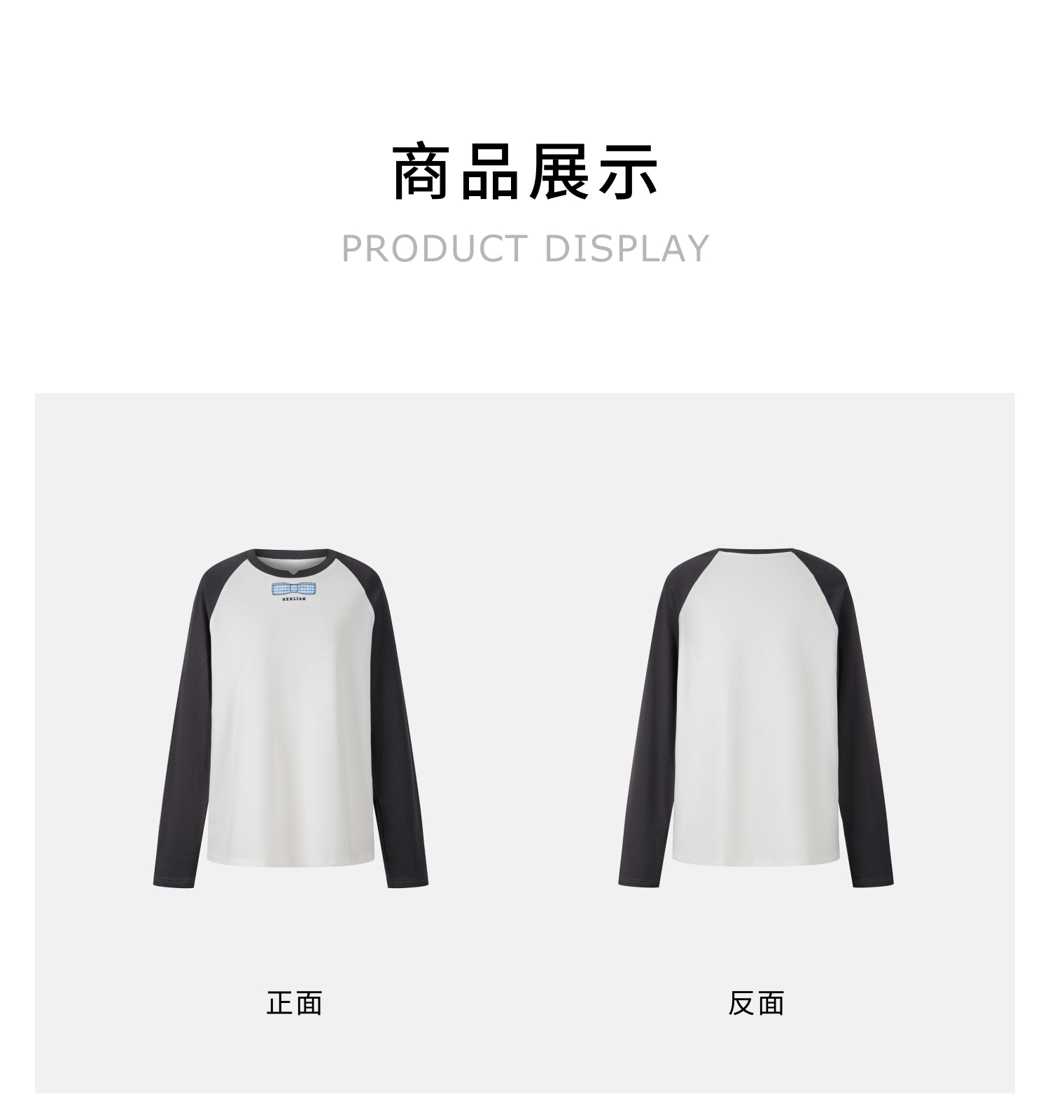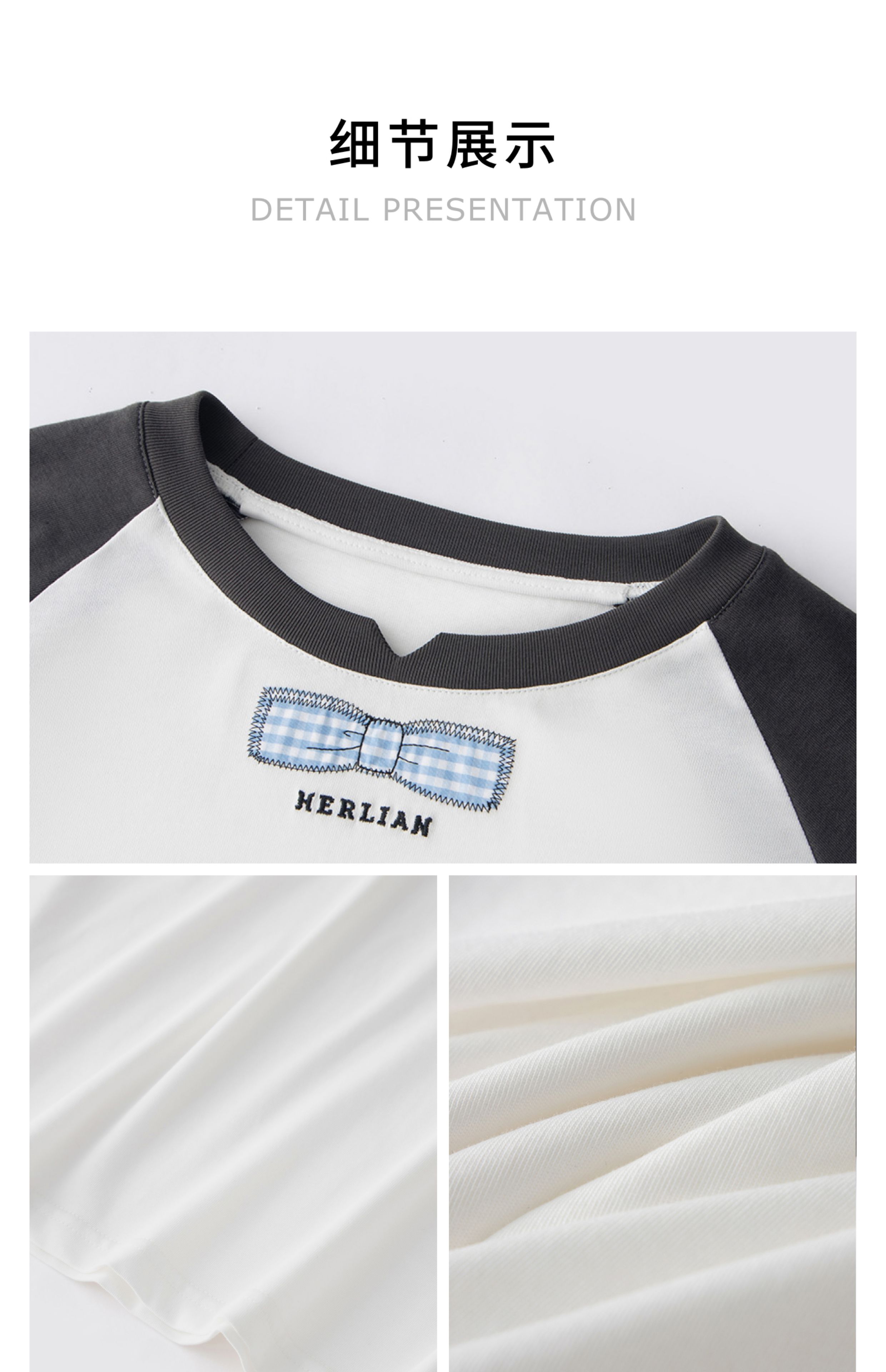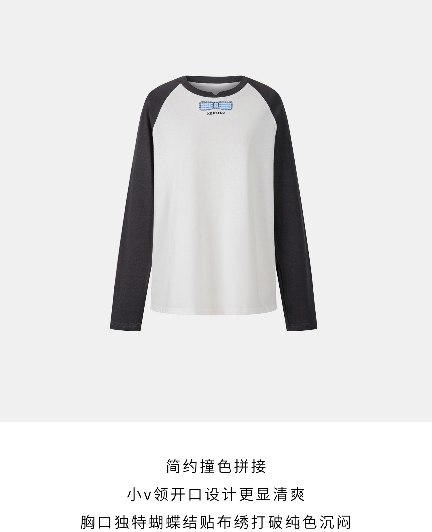 HERLIAN2025年秋季新品女士领口蝴蝶结印花撞色插肩袖T恤衫