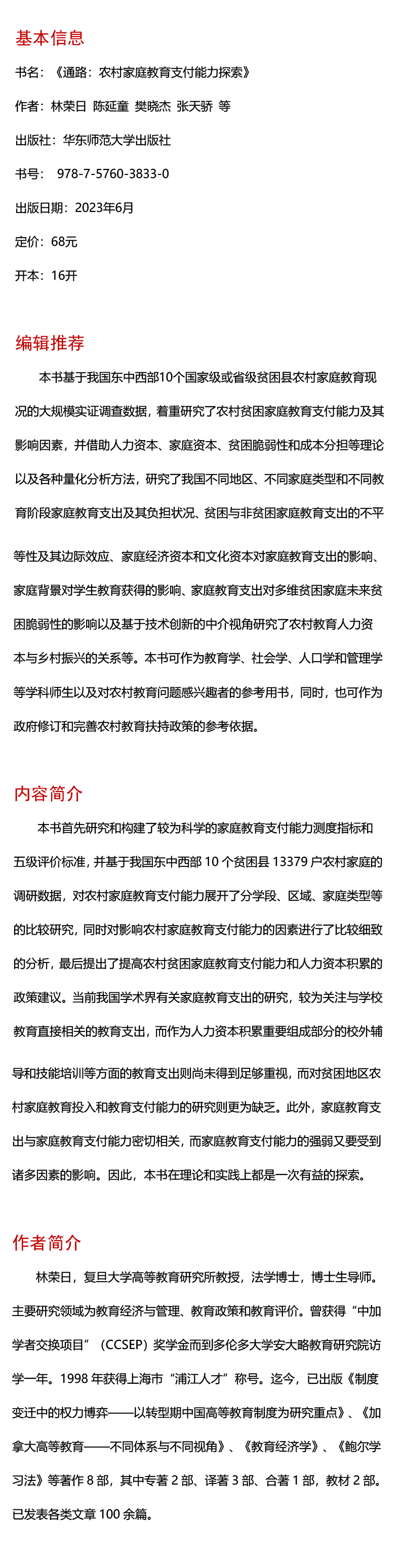 本书首先研究和构建了较为科学的家庭教育支付能力测度指标和五级评价标准,并基于我国东中西部10个贫困县13379户农村家庭的调研数据,对农村家庭教育支付能力展开了分学段、区域、家庭类型等的比较研究,同时对影响农村家庭教育支付能力的因素进行了比较细致的分析,最后提出了提高农村贫困家庭教育支付能力和人力资本积累的政策建议。当前我国学术界有关家庭教育支出的研究,较为关注与学校教育直接相关的教育支出,而作为人力资本积累重要组成部分的校外辅导和技能培训等方面的教育支出则尚未得到足够重视,而对贫困地区农村家庭教育投入和教育支付能力的研究则更为缺乏。此外,家庭教育支出与家庭教育支付能力密切相关,而家庭教育支付能力的强弱又要受到诸多因素的影响。因此,本书在理论和实践上都是一次有益的探索。