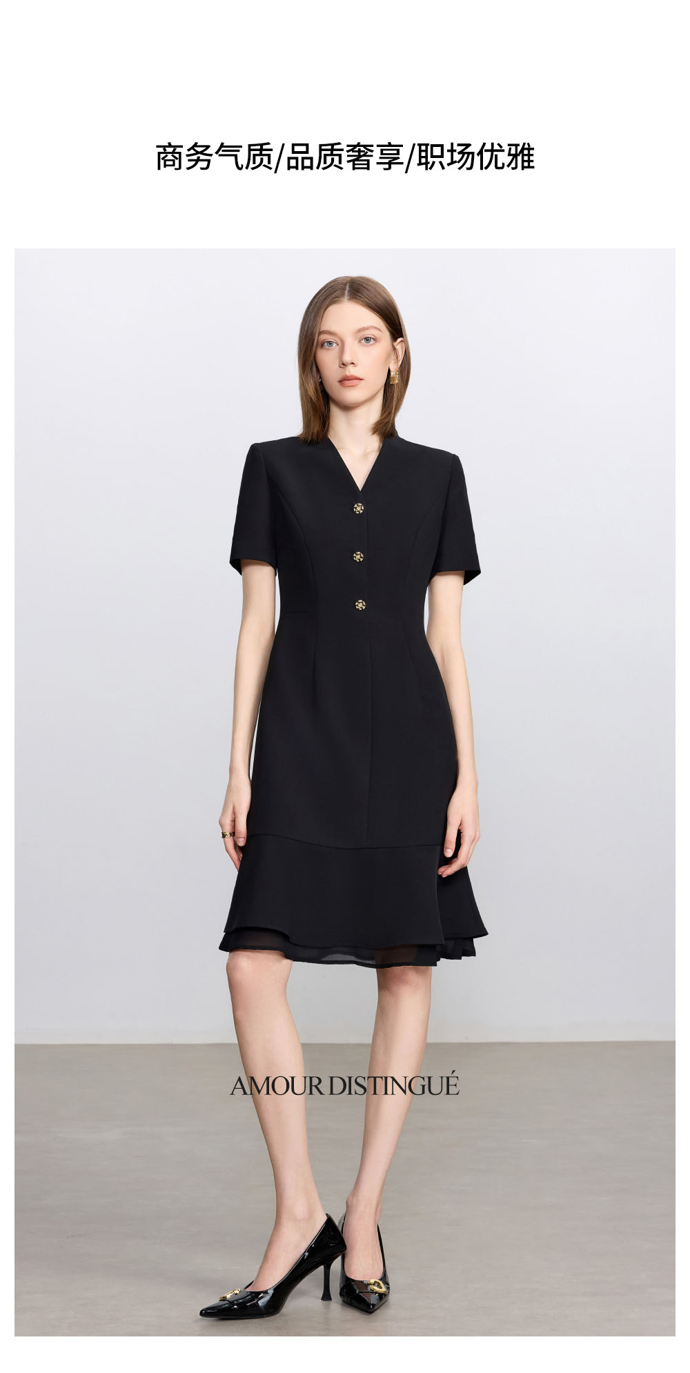 IWY/经典黑色短袖连衣裙女气质通勤酒店经理接待工作服职场套裙Q1416
