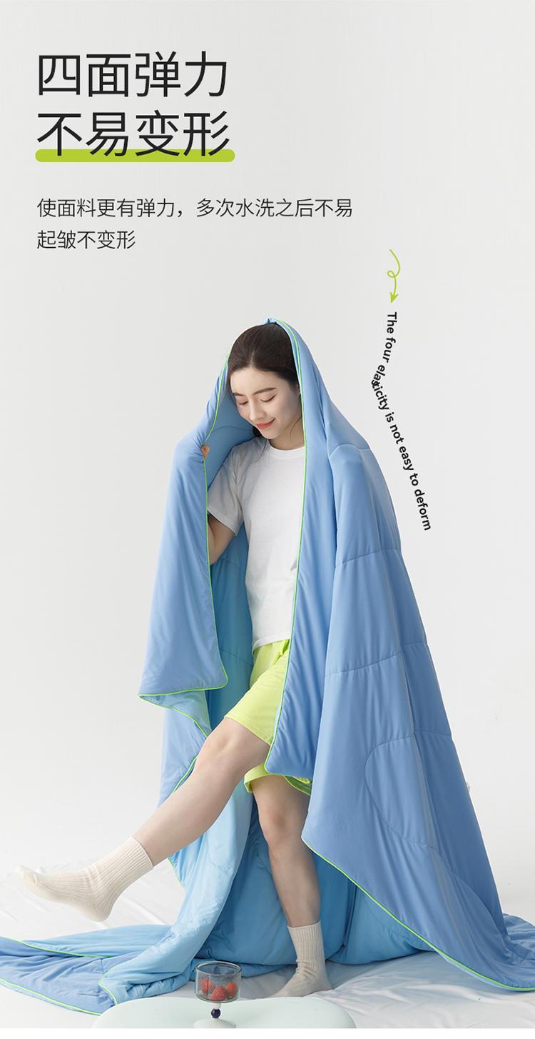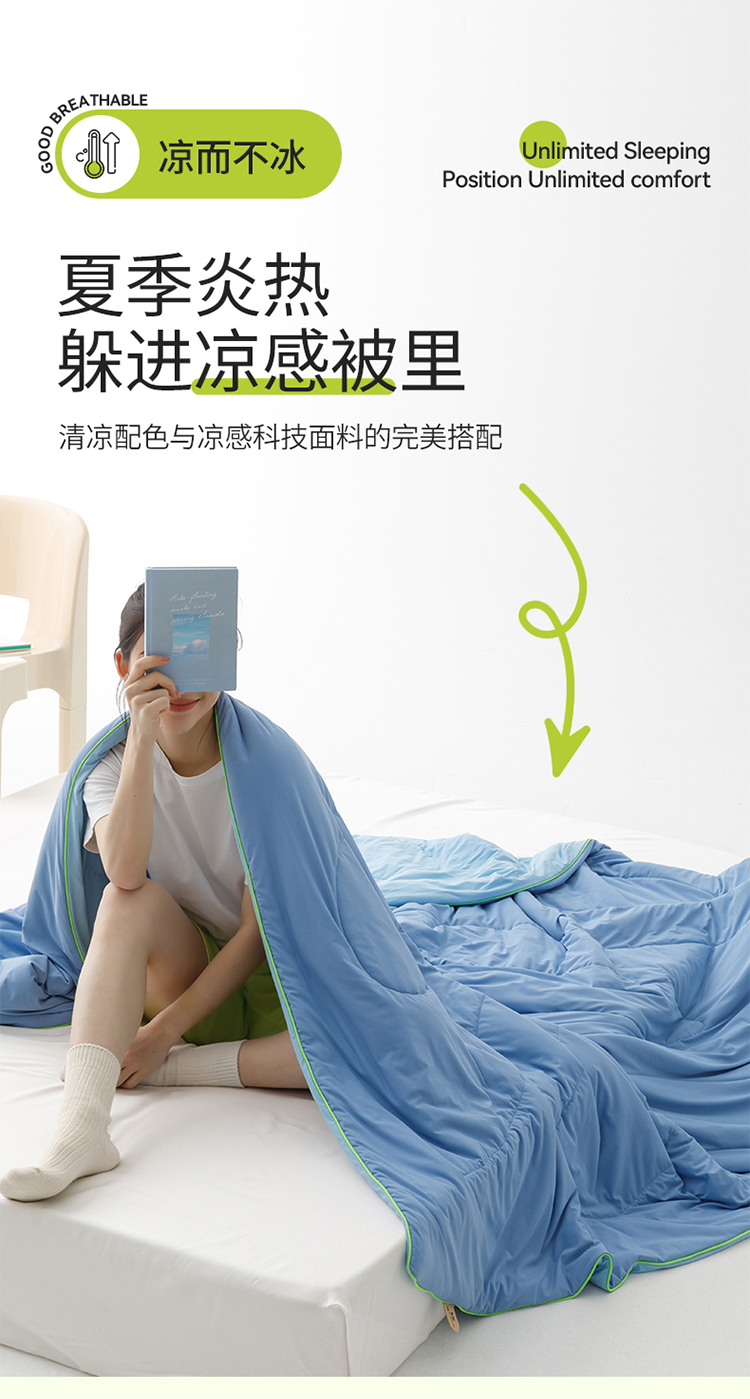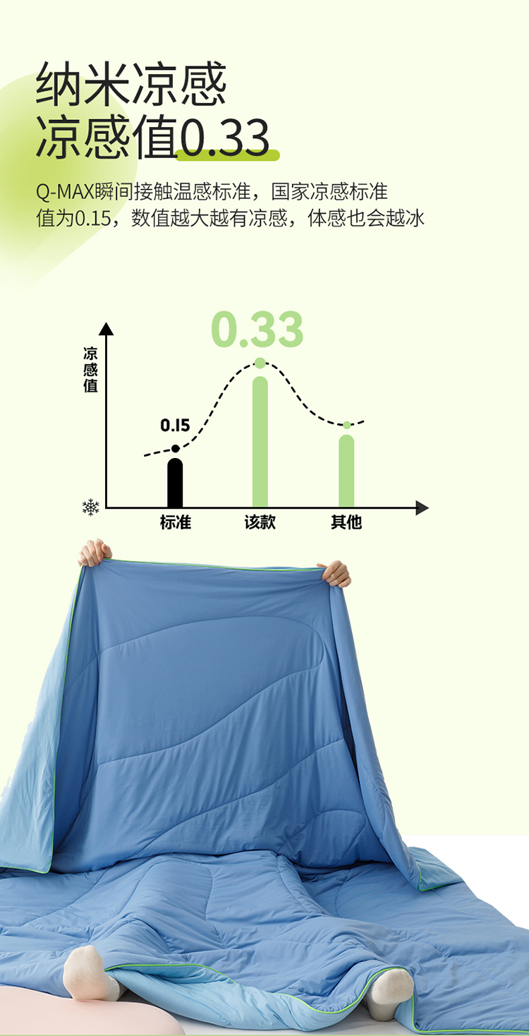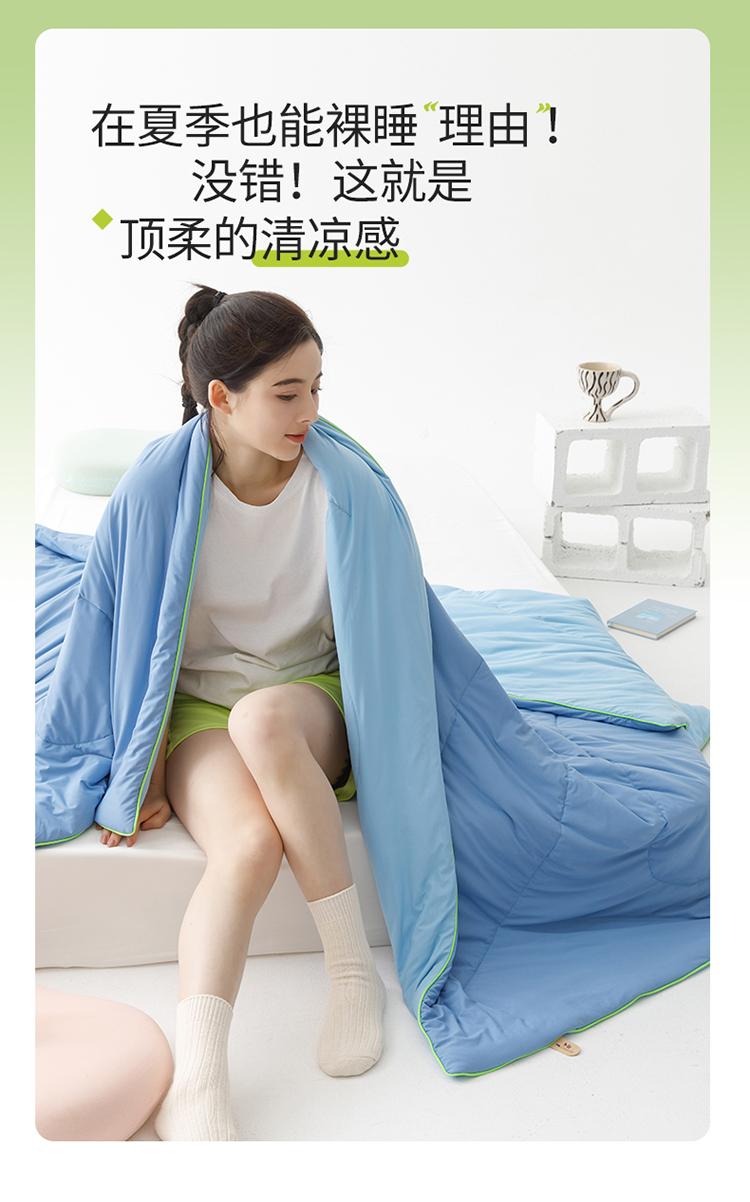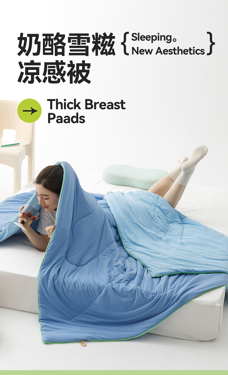 顶柔奶酪雪糍凉感被,以锦纶作为凉感纤维,通过纤维的配比,提供更加透气的温和清凉感