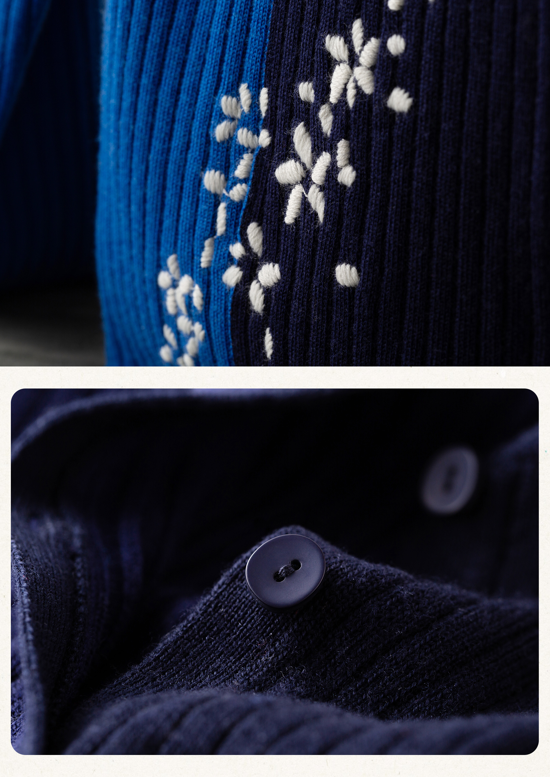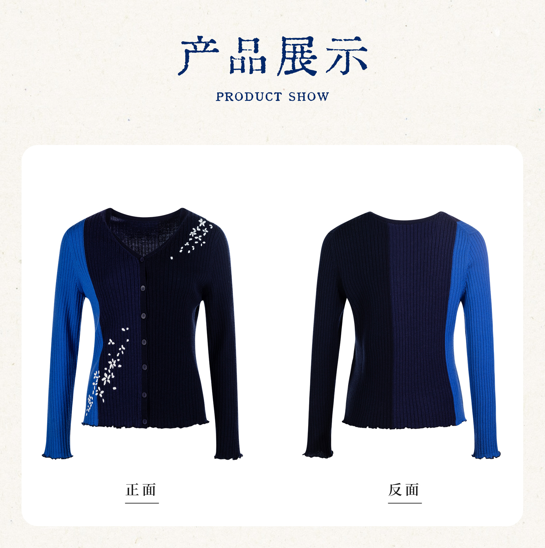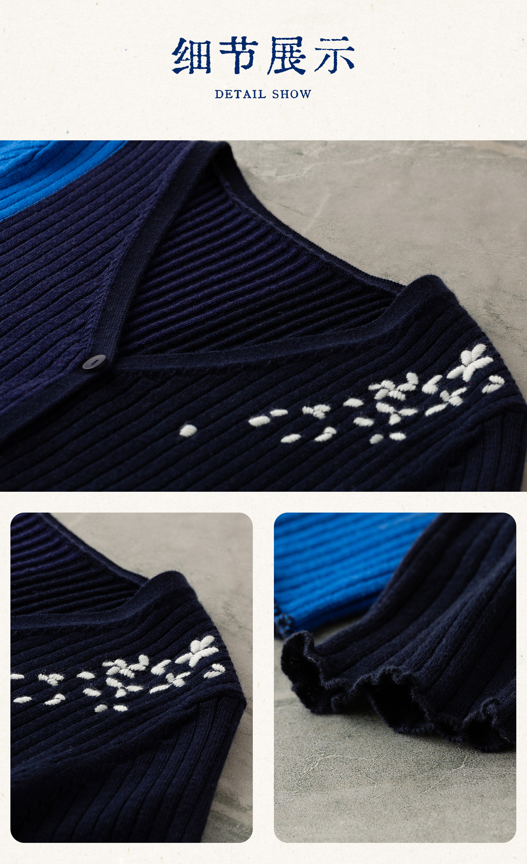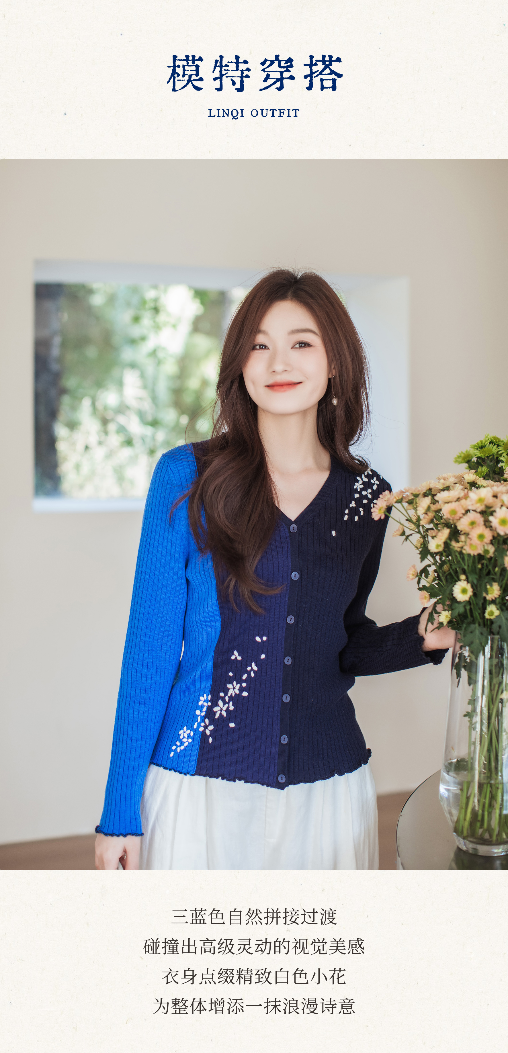 【林栖设计小店】【林栖推荐】蓝色落英缤纷多色拼接绵羊毛针织绣花开衫N1961361