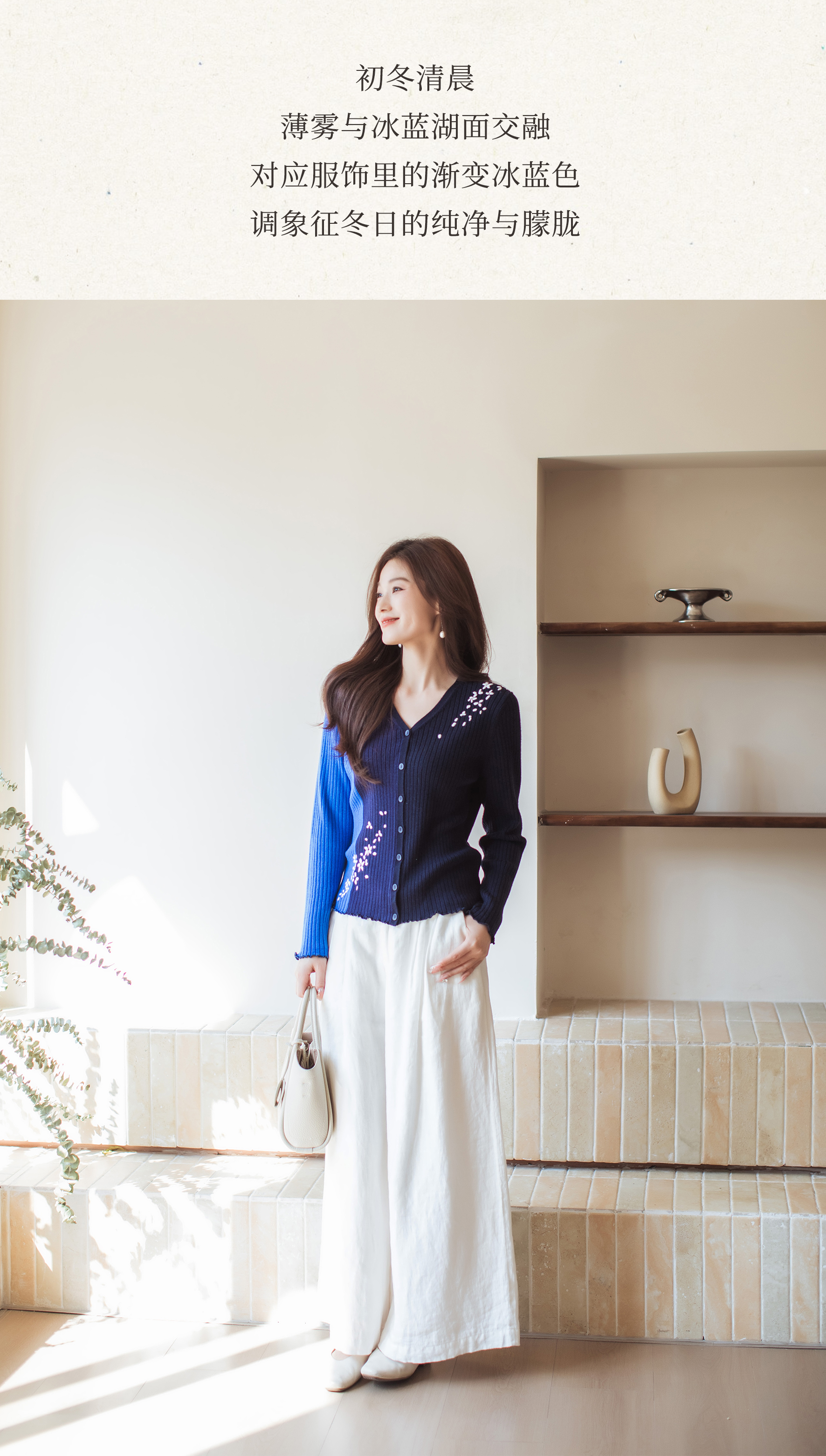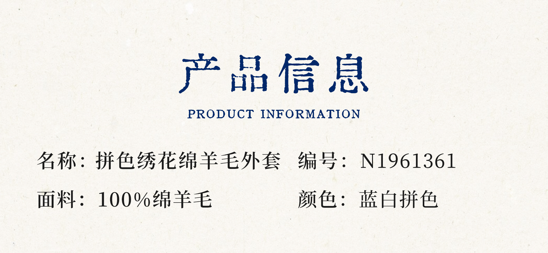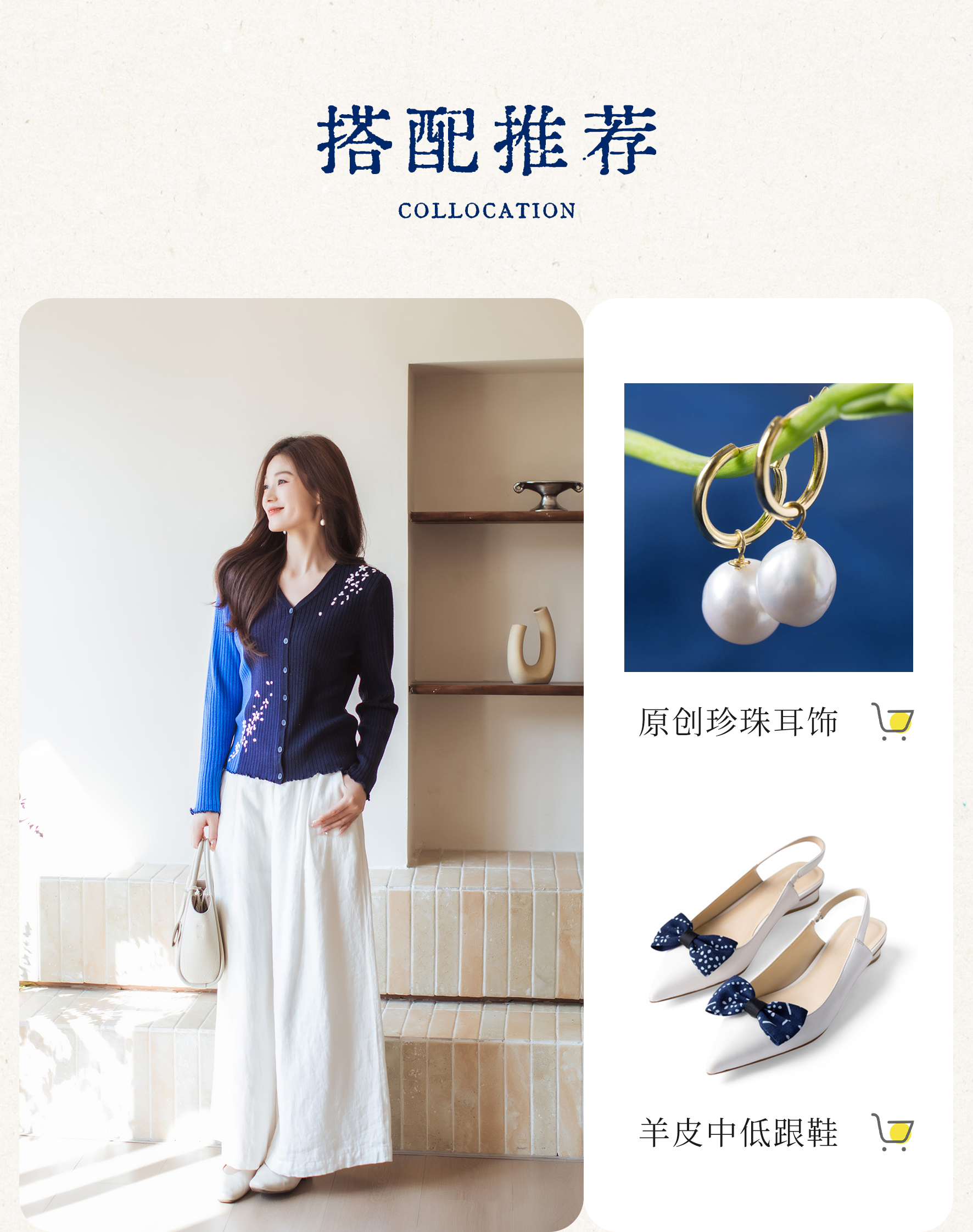 【林栖设计小店】【林栖推荐】蓝色落英缤纷多色拼接绵羊毛针织绣花开衫N1961361