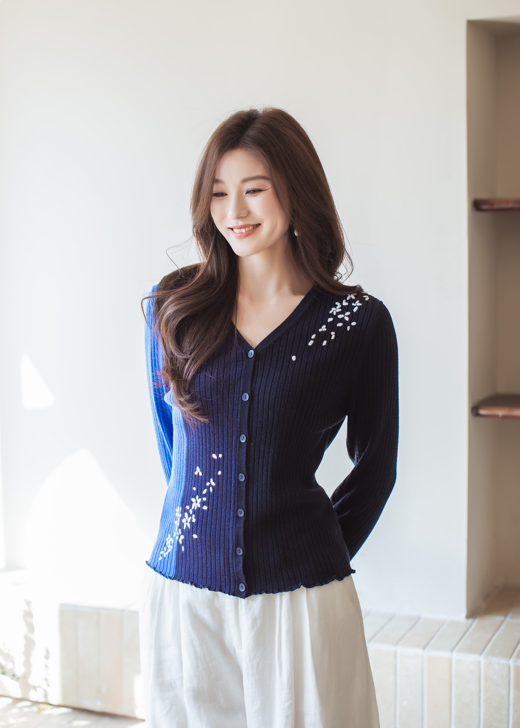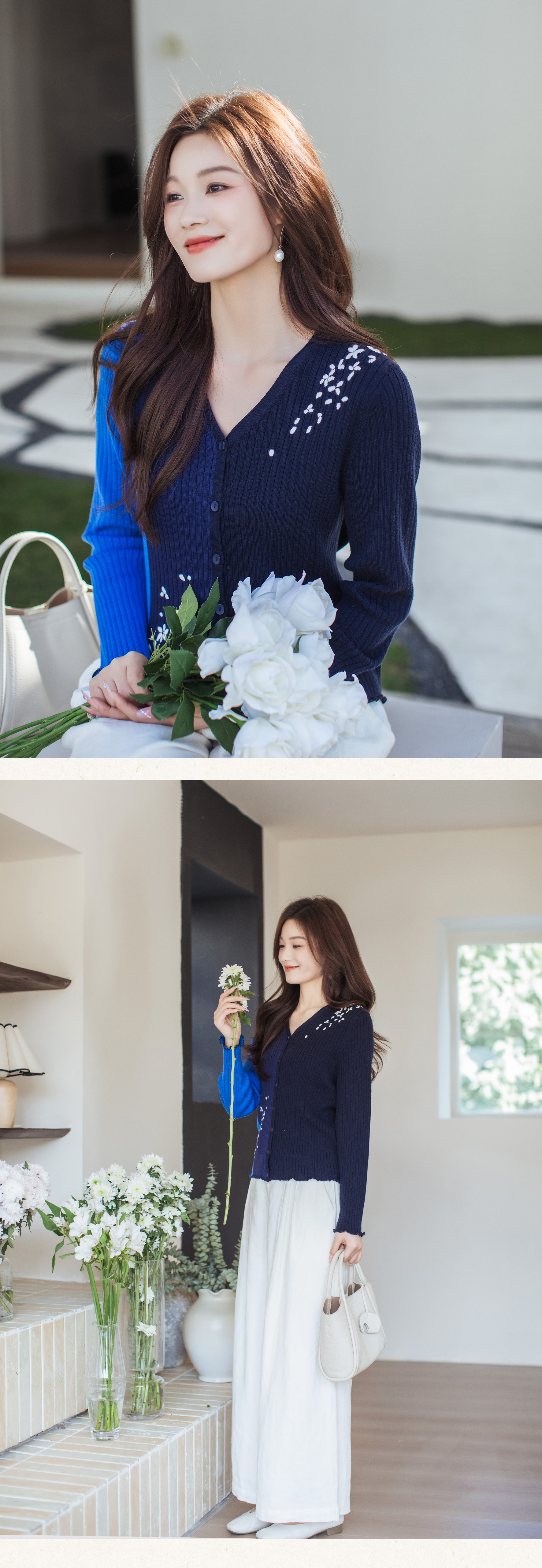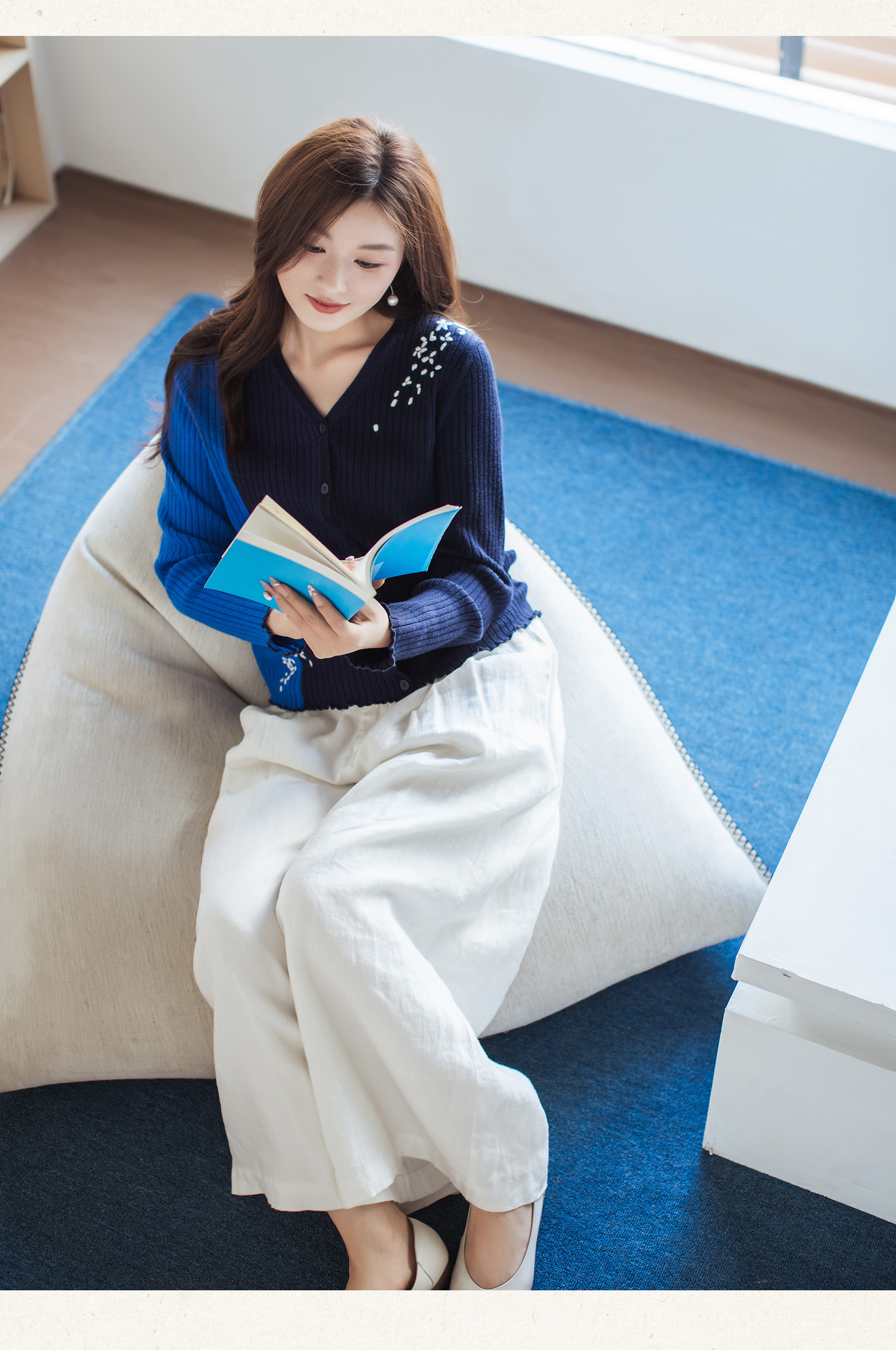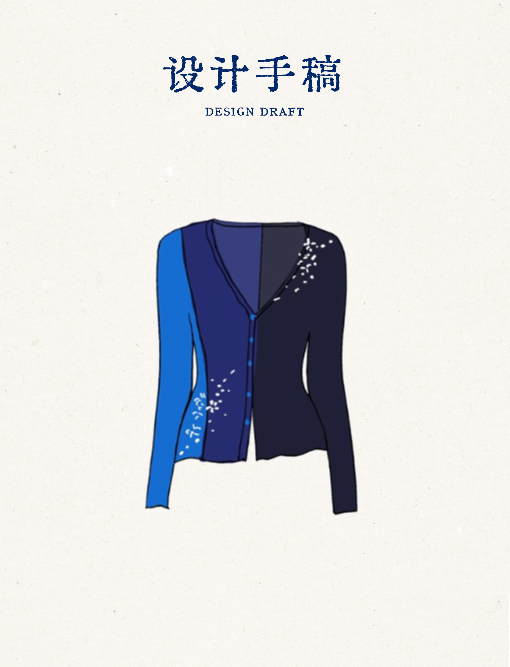 【林栖设计小店】【林栖推荐】蓝色落英缤纷多色拼接绵羊毛针织绣花开衫N1961361