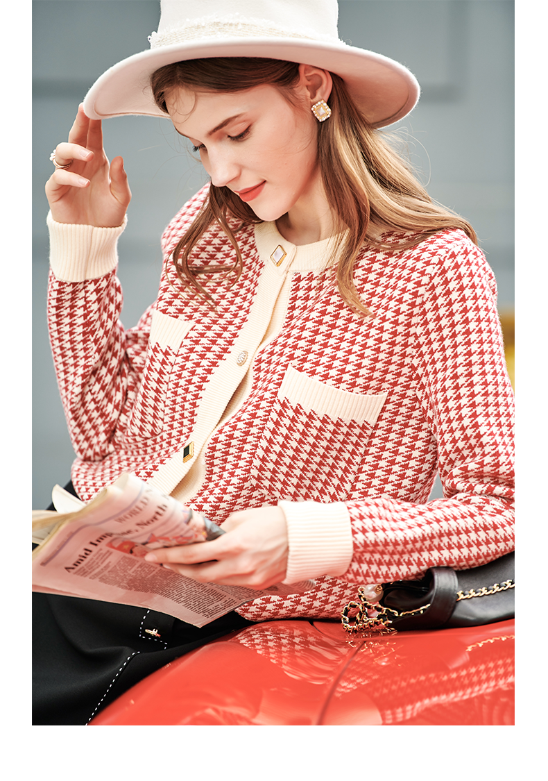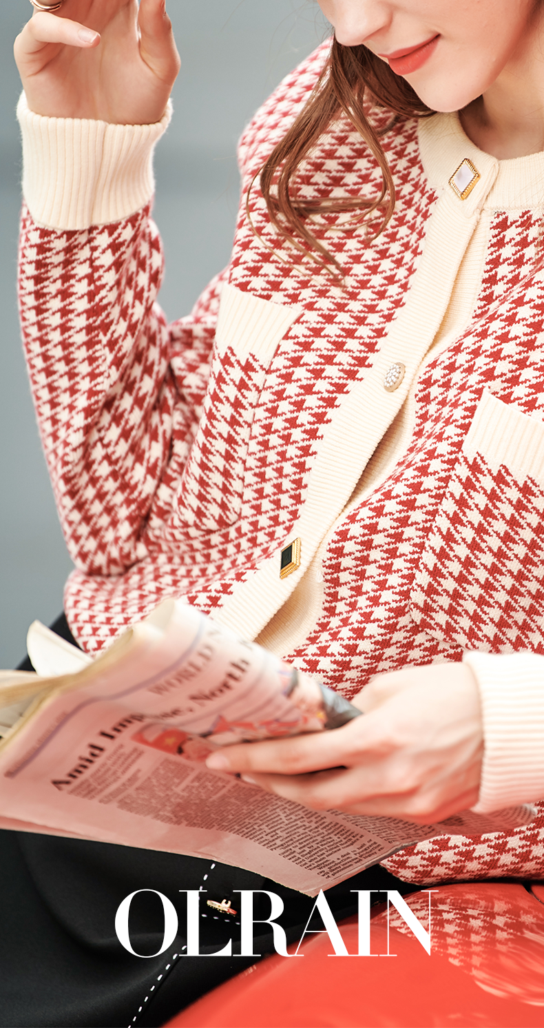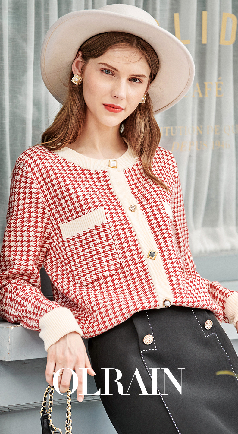 【欧芮儿会员日】【满300-30元】【满600-60元】OLrain欧芮儿法式红色格纹针织开衫女早春2023年新款外穿毛衣外套