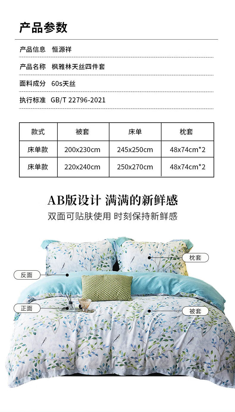 恒源祥家纺60支天丝四件套莱赛尔AB面套件 200*230cm枫雅林
