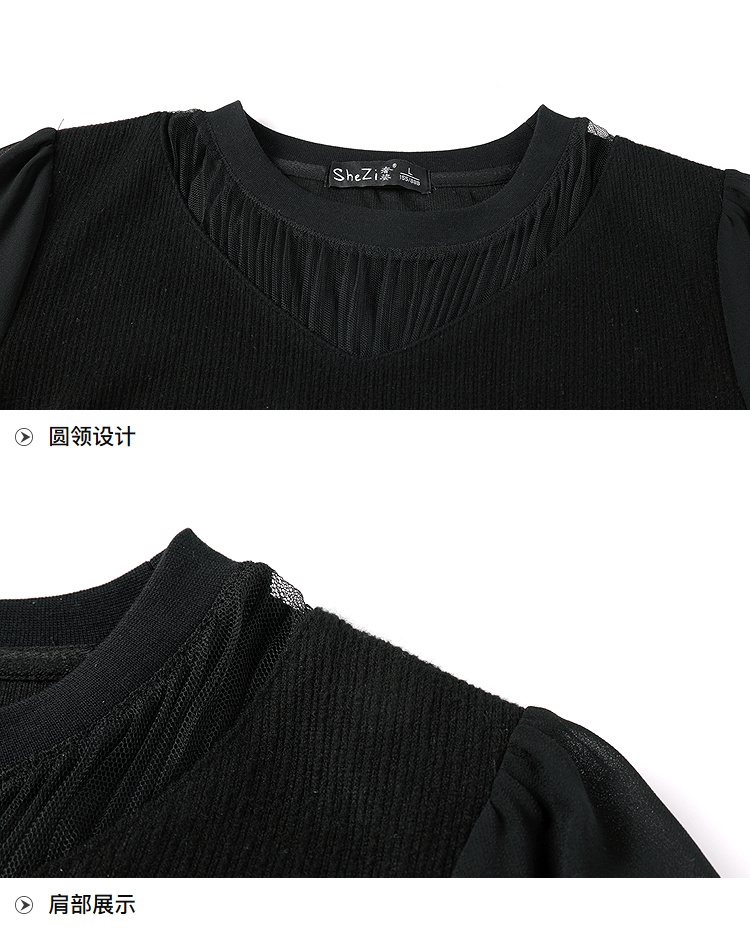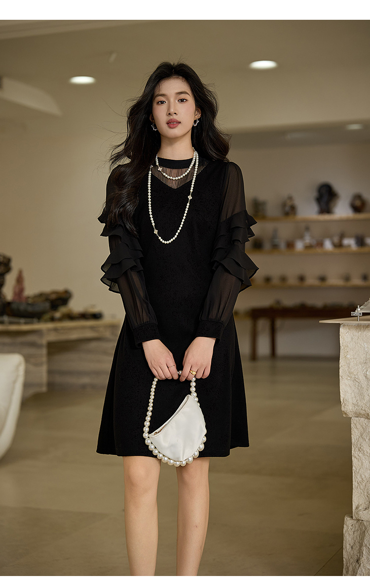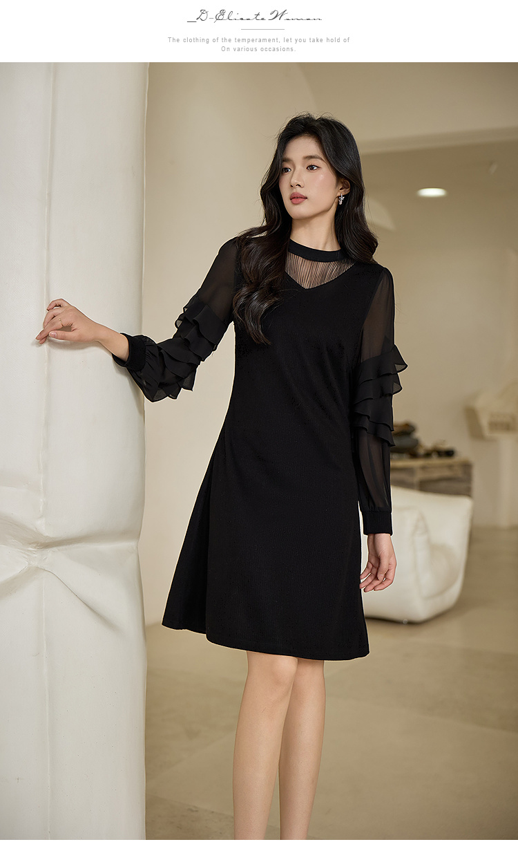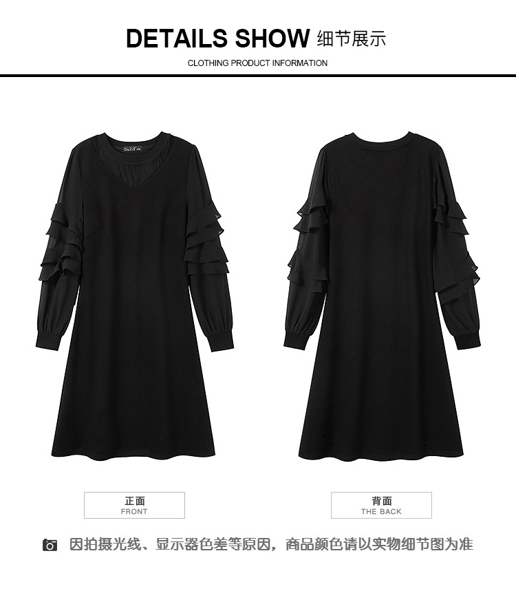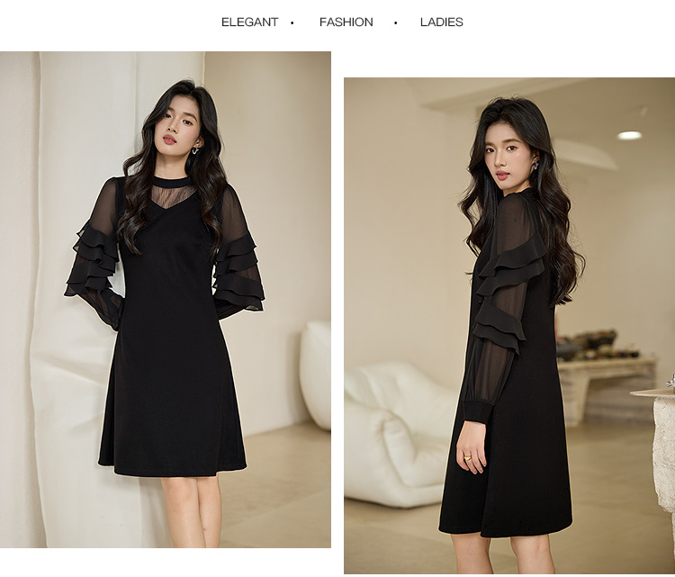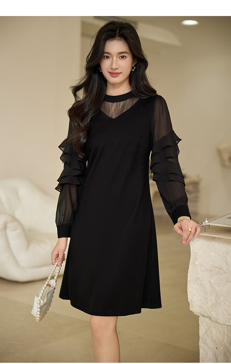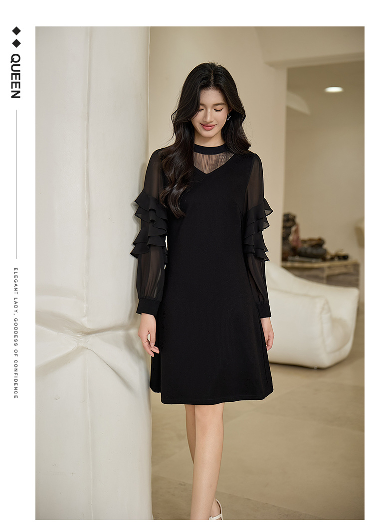 奢姿大码女装2025冬季胖妹妹时尚黑纱层叠袖设计气质圆领连衣裙9954870682