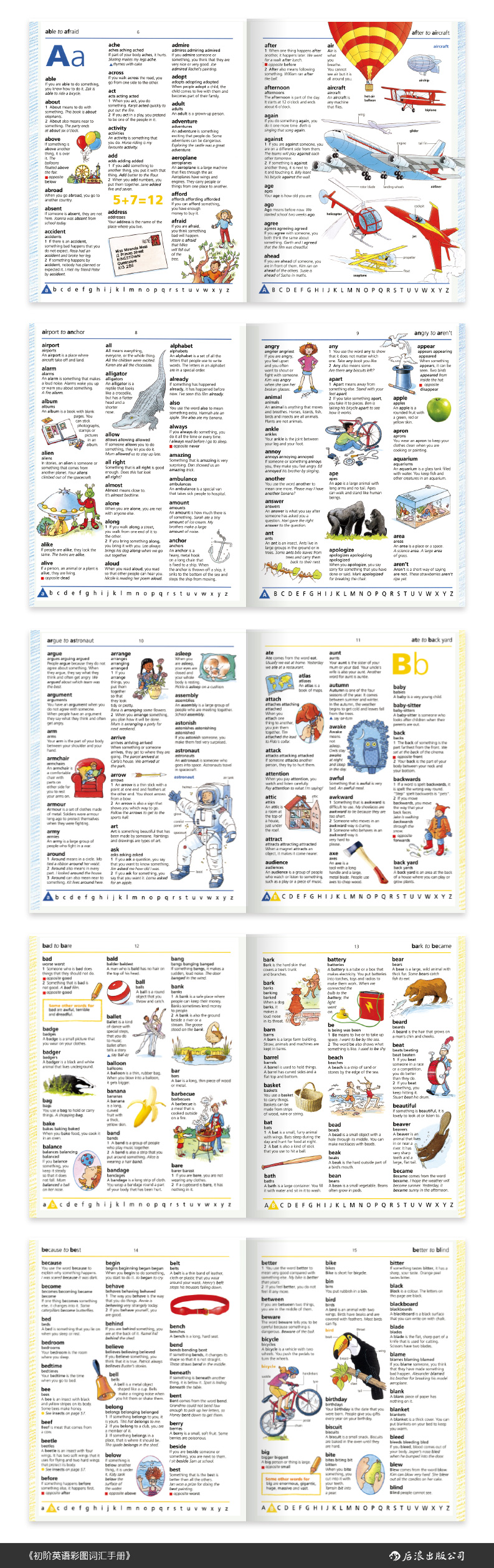 ◎ 内容编排借鉴工具书的呈现形式,词汇按照字母顺序排列,页眉及页脚处具有可查找、定位单词的辅助内容。小读者几乎可以把本书当做一本入门级的英语小词典使用!