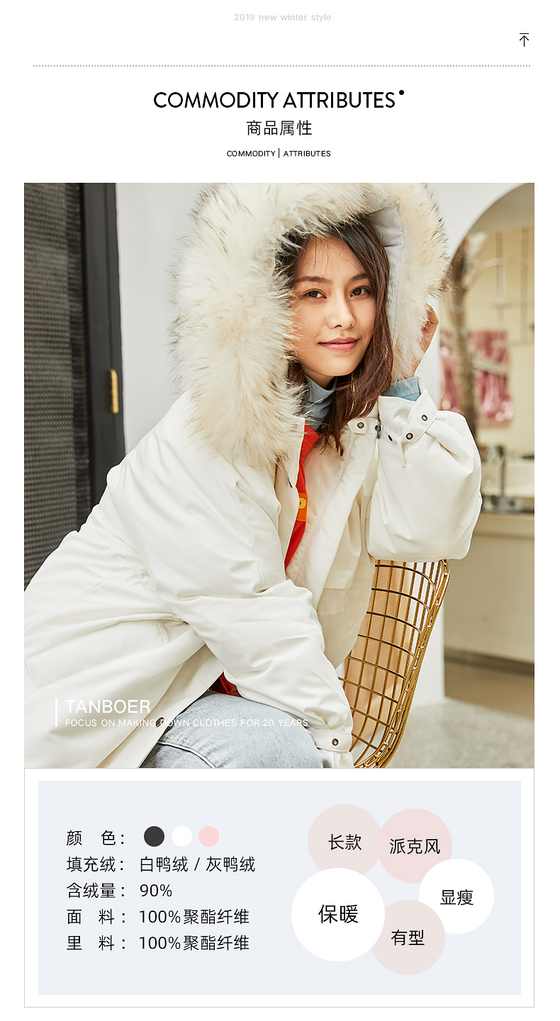 TD19170坦博尔羽绒服中长款2019新品工装大毛领羽绒服韩版外套冬
