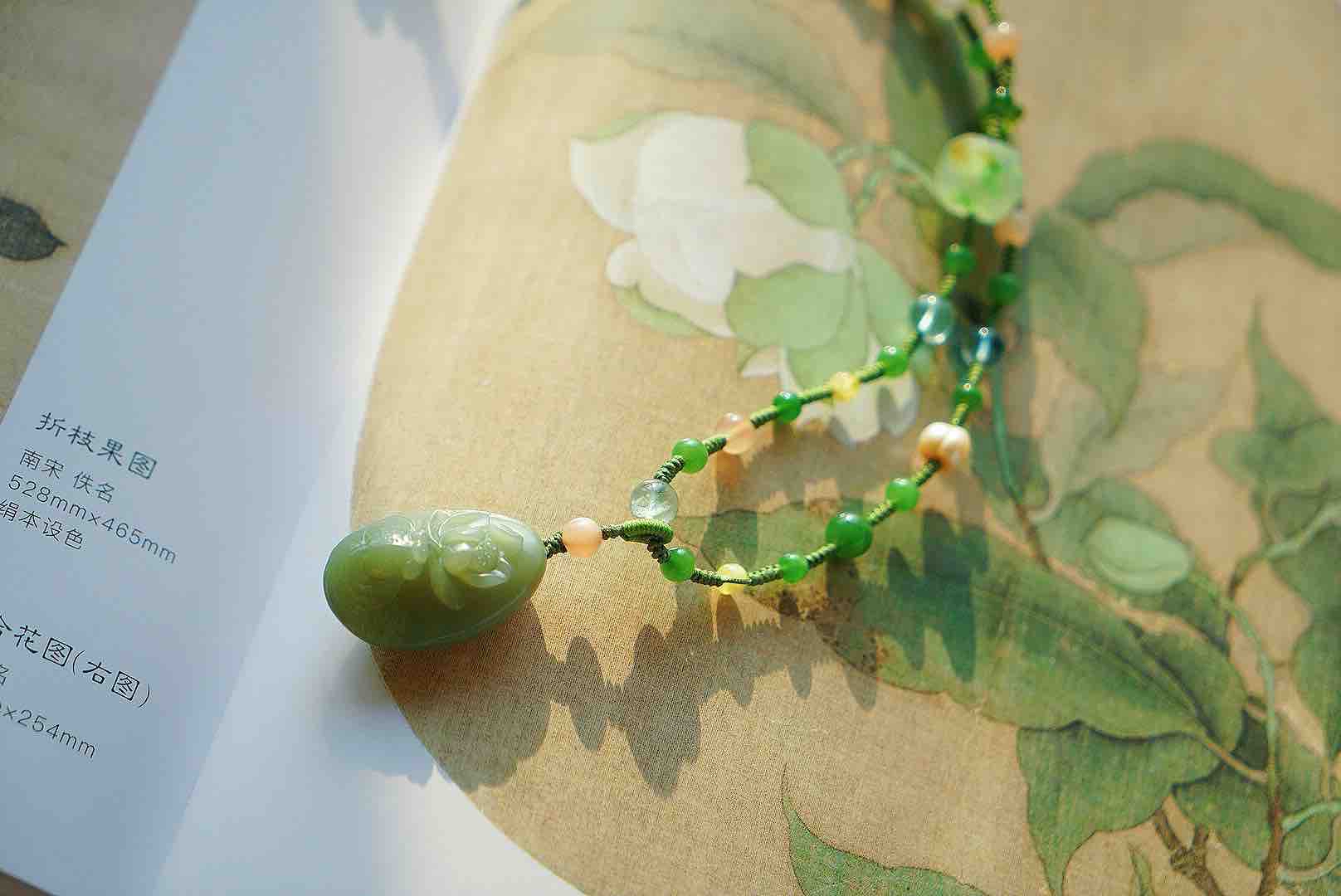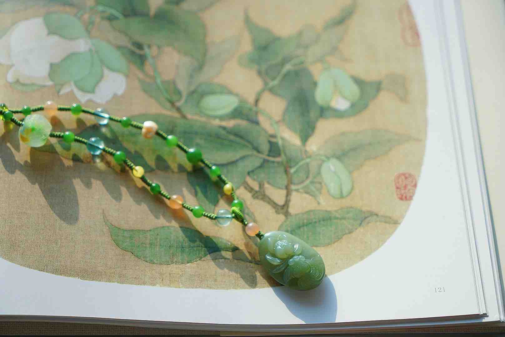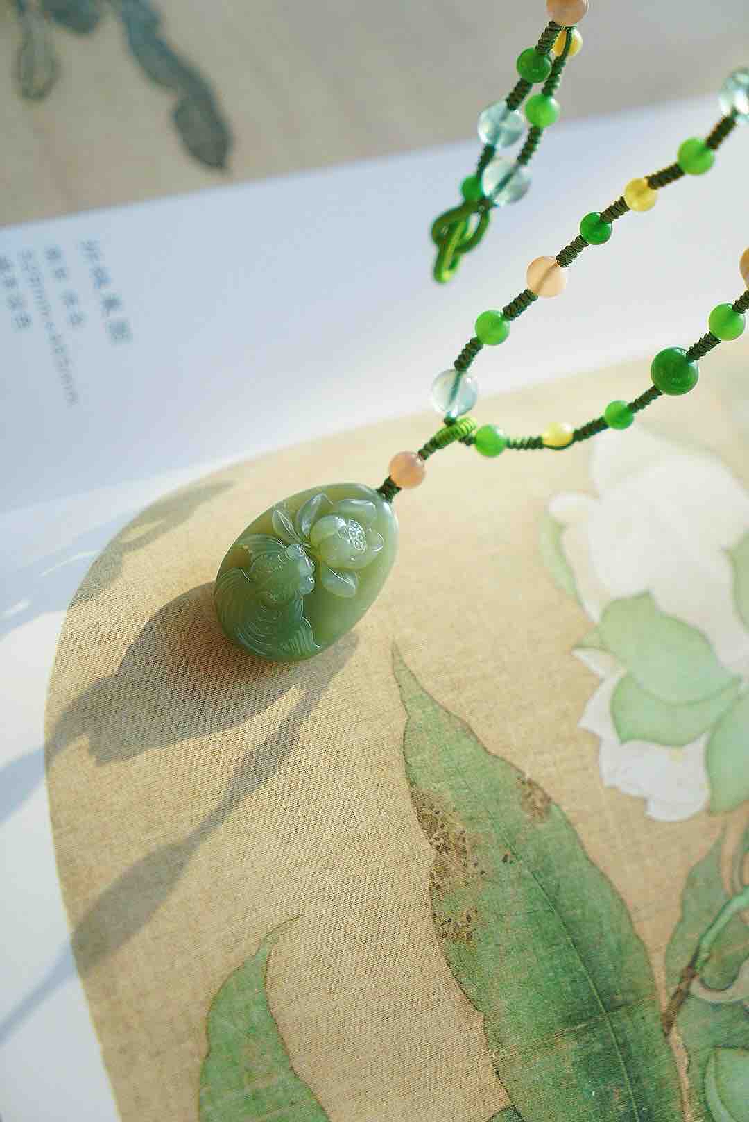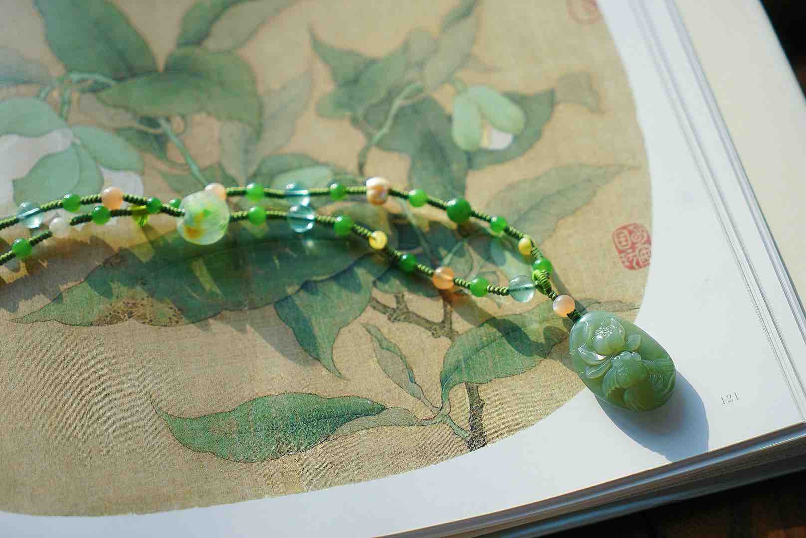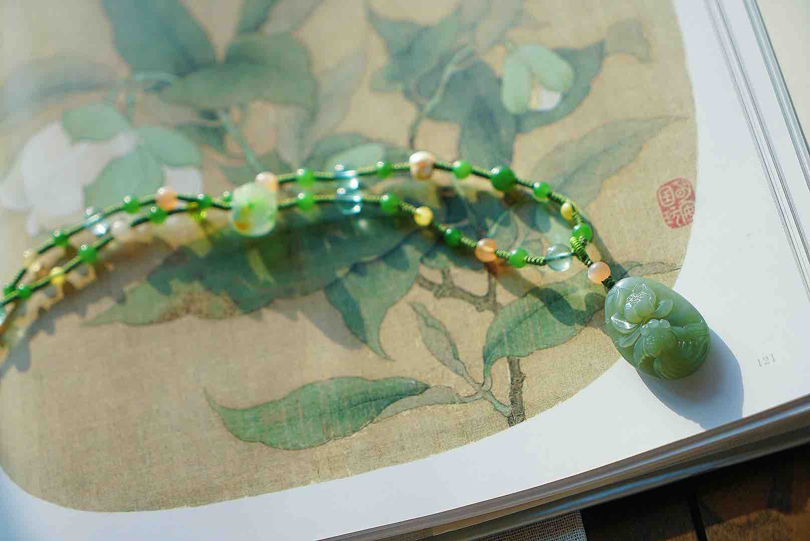 近无结构粉青碧玉,润润的,很完整很舒服的一块莲花牌子。清新素雅,链子也是我们原创多宝(碧玉,琉璃,老珍珠,橙月光颗颗精品!)编绳设计,整体灵动又素静,材质都很棒,百搭是真的很百搭,穿任意衣服都可以,会有随意休闲的感觉,但是需要文艺典雅一下的时候,又很够用。嘿嘿嘿。