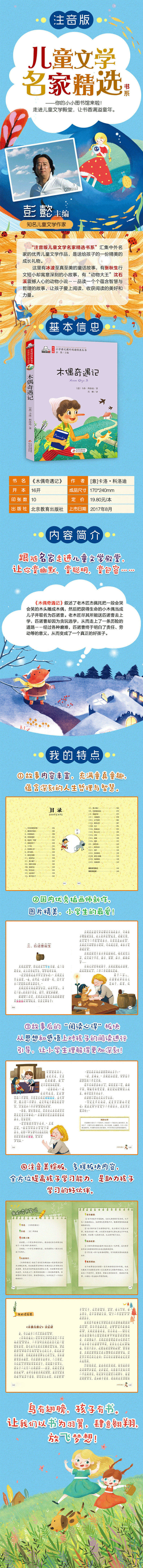 《小学生语文经典丛书:木偶奇遇记(彩图注音版)》以普通话标准读音为故事内容注音,孩子们可以边读拼音边认字,而用彩色字标注的百余个词语皆是他们需要学会的重点词语。读完故事,他们都可以掌握一些拼音、学到一些词语,从自主阅读中获得成就感。