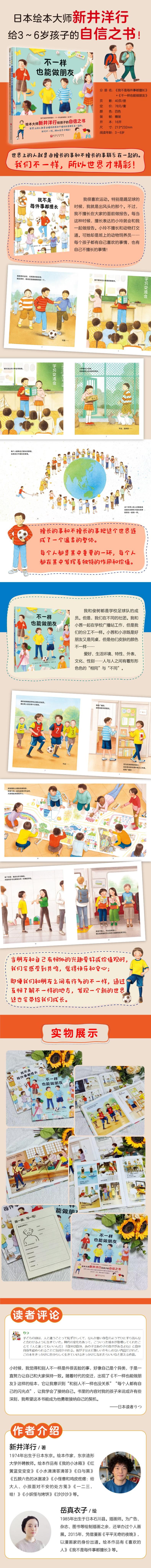 这是一套给孩子的自信之书,由日本绘本大师新井洋行精心创作。全2册,分别是《我不是每件事都擅长》《不一样也能做朋友》。3-6岁适读,非常适合亲子共读。 《我不是每件事都擅长》: 我很喜欢运动。特别是踢足球的时候,我就是出风头的那个。不过,我不擅长在大家的面前做报告。每当这种时候,擅长表达的小玲就会和我一起做报告。小玲不擅长和动物打交道。可她却是班上的动物饲养员……每个孩子都有自己喜欢的事情,也有自己不擅长的事情。 大人也是一样的。厨艺高超的爸爸开车技术一般。爱开车的妈妈不擅长整理房间。还有不擅长应付小孩子的邮递员、不擅长早起的幼儿园老师…… “喜欢”和“不擅长”甚至还超越了国界。擅长英语的玛丽不擅长使用电脑。敏俊虽然擅长操作电脑,但是…… 擅长的事和不擅长的事把这个世界连成了一个温柔的整体。每个人都是其中重要的一环,每个人都在其中发挥着独特的作用和价值。 《不一样也能做朋友》: 我和俊树都是......