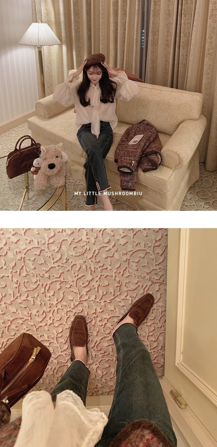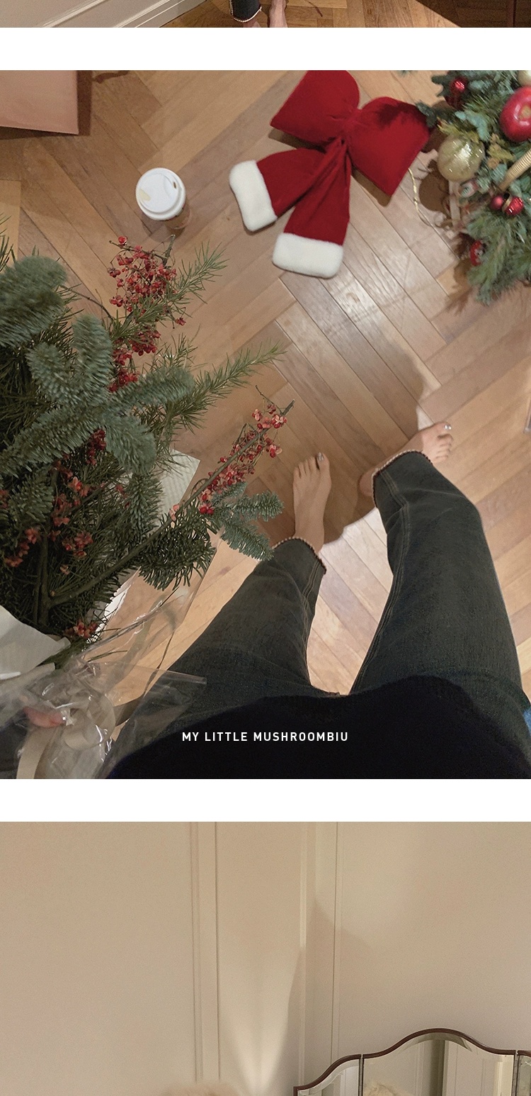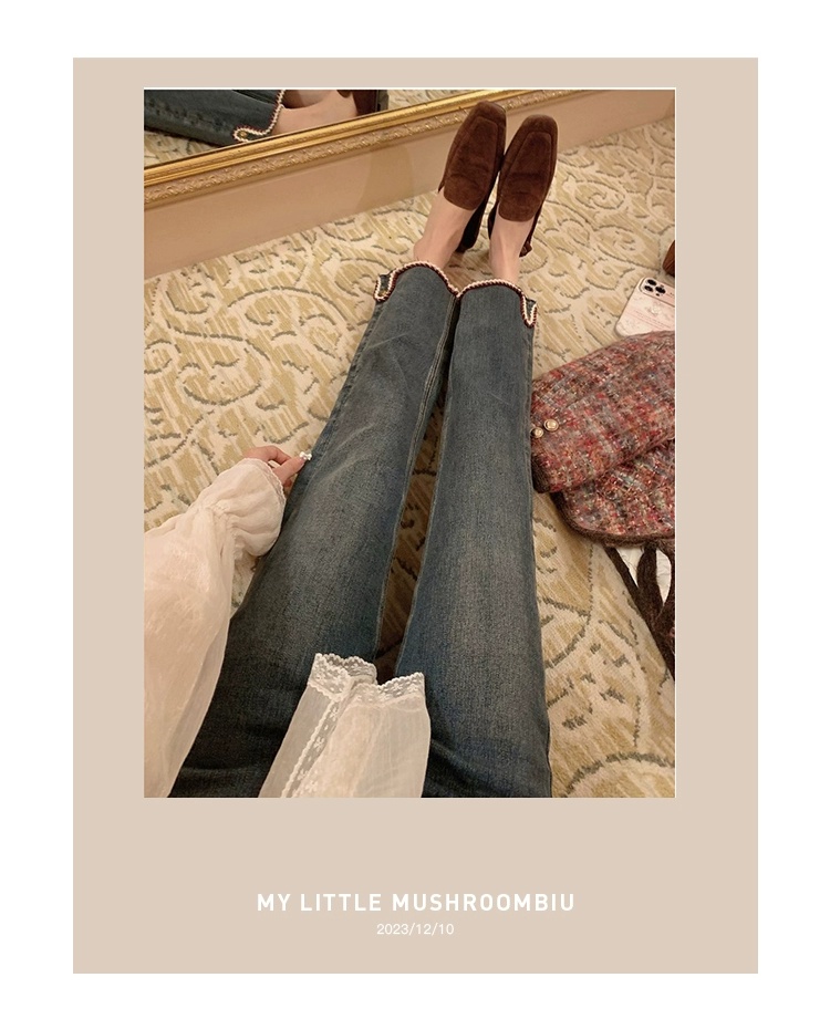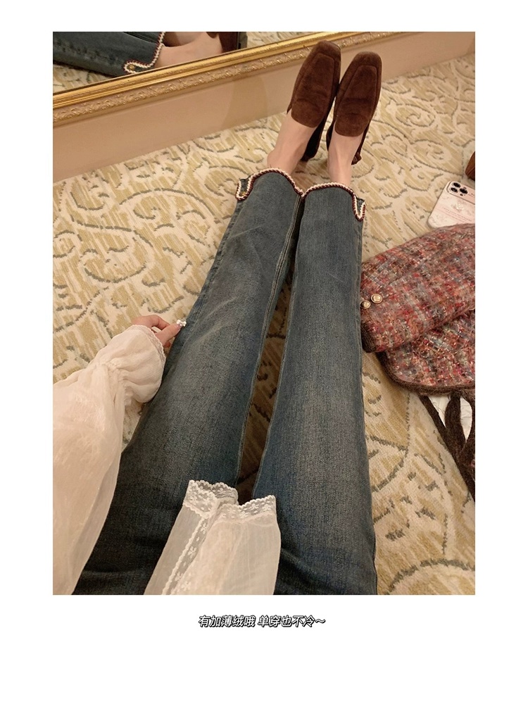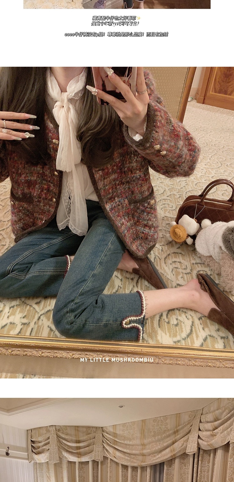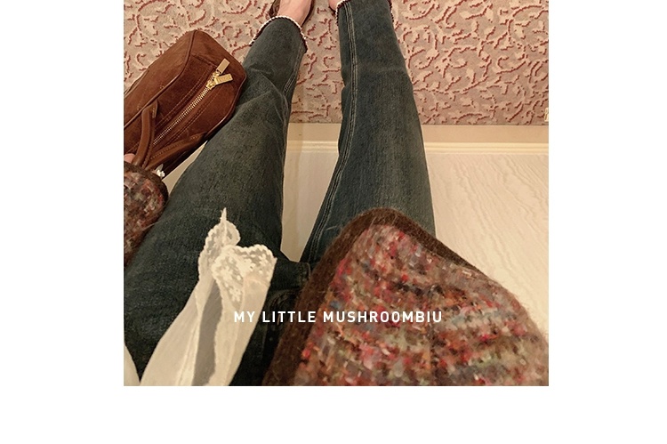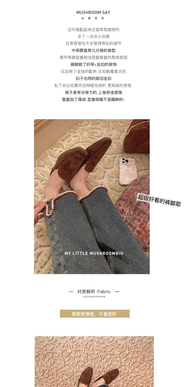 金蘑菇菇 coco rouge香香牛仔裤/复古蓝薄绒中高腰直筒九分休闲裤