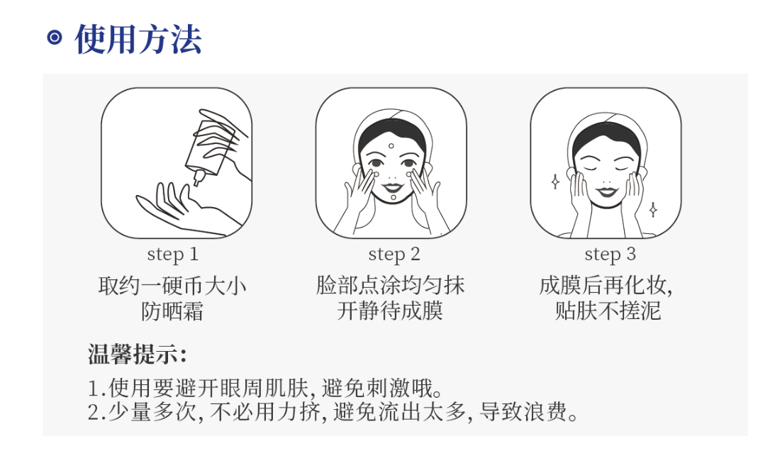 3、高原、海边、户外长时间停留,每2小时补涂一次,每次使用一元硬币大小用量。