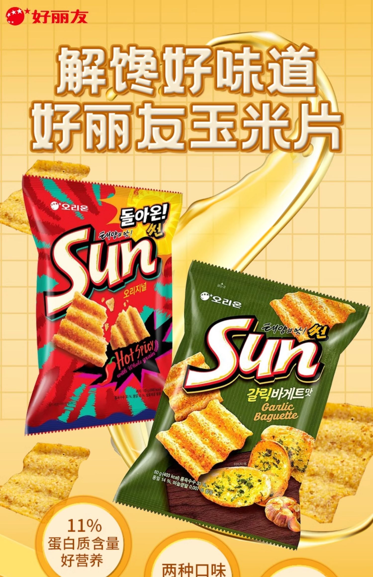 好丽友法式蒜香面包味/经典热辣味波浪形玉米片70g 香酥薄脆越嚼越香 050474/050475