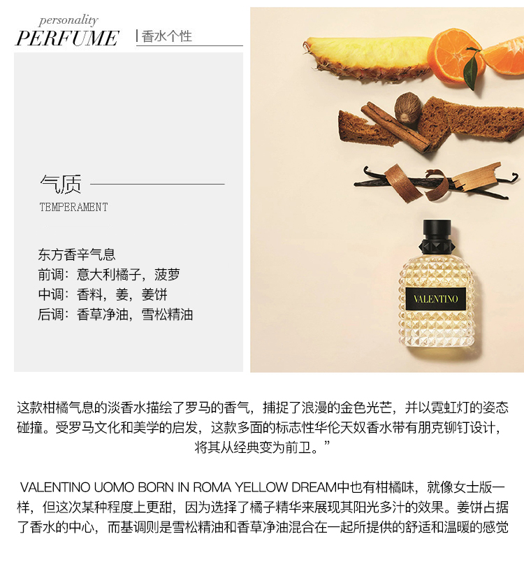 Valentino/华伦天奴坠梦罗马「黄色的梦想」男士香水50-100ml EDT淡香水 东方辛辣调
