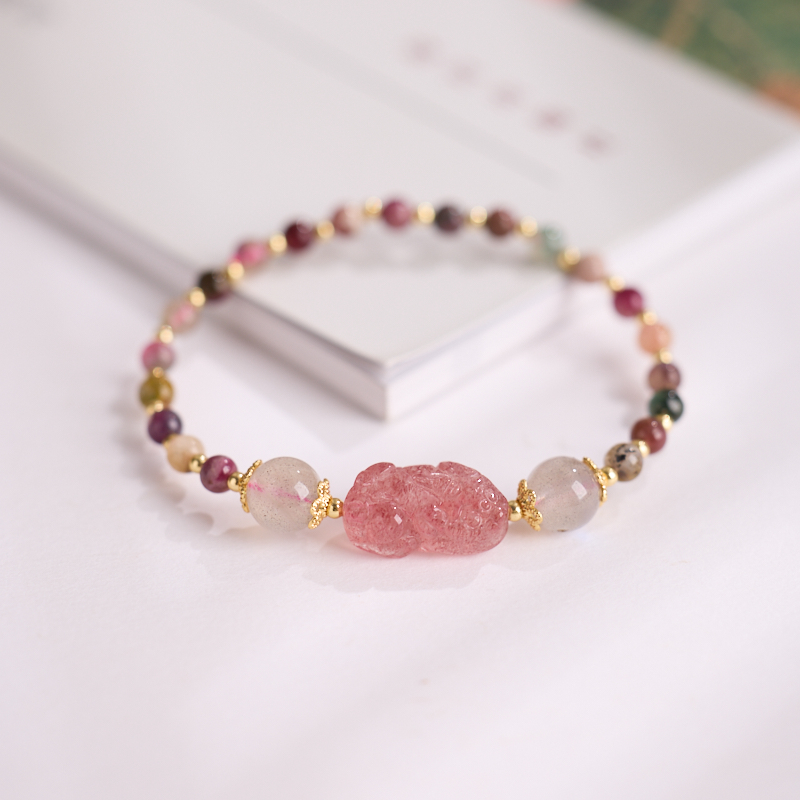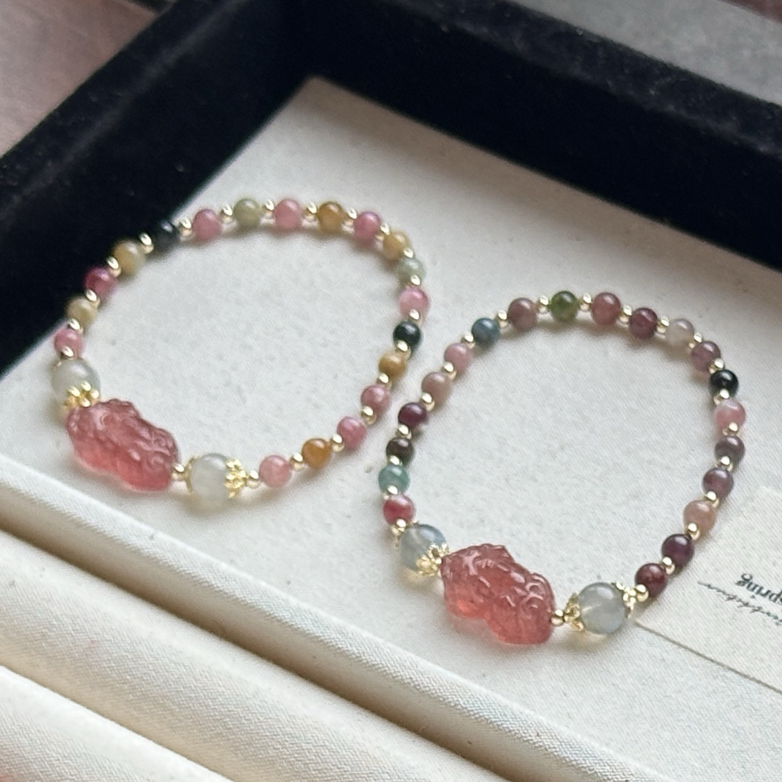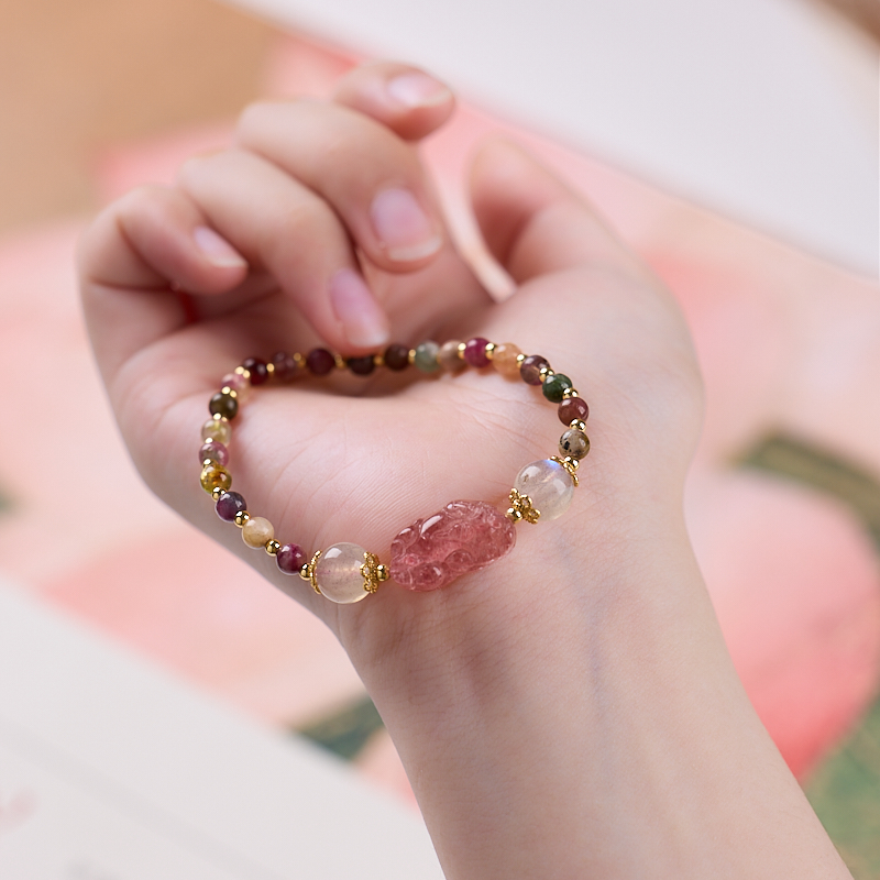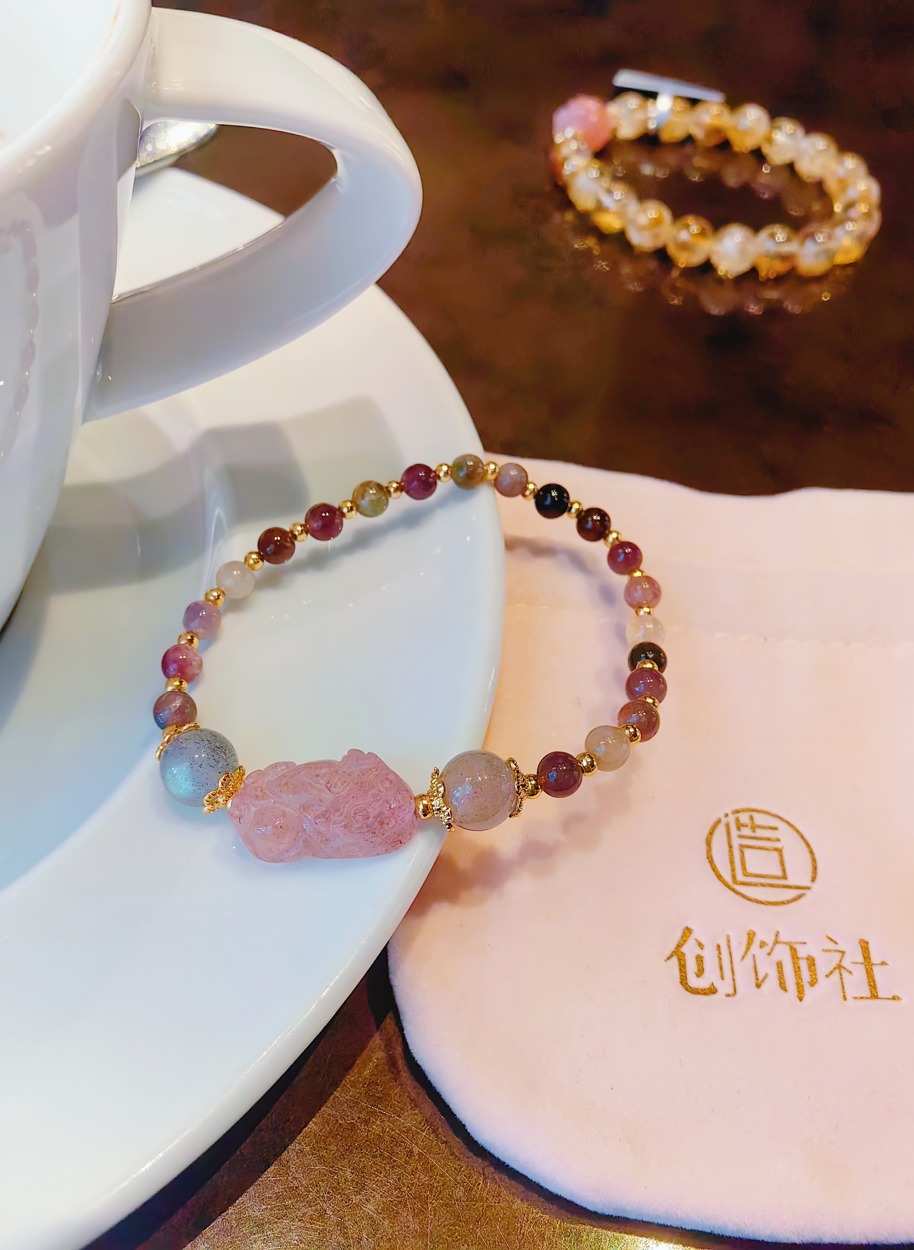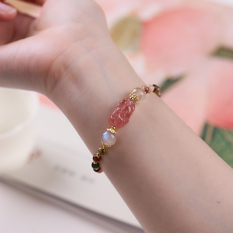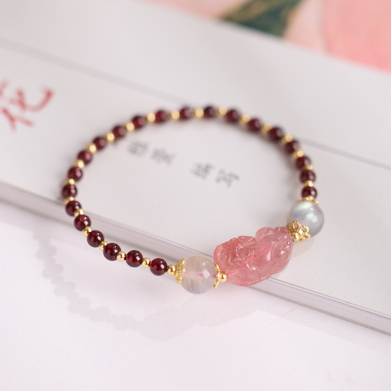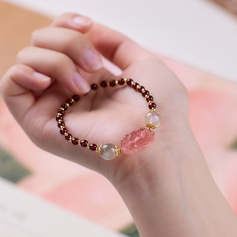 我们甄选色泽优质的石榴石,与手工雕琢的草莓晶貔貅搭配成串,寓意运转钱来。