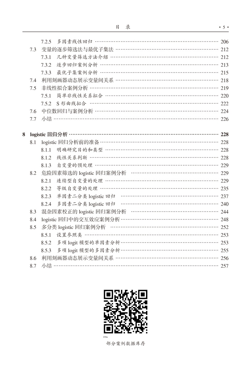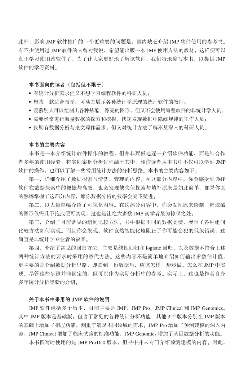 本书是一本介绍统计软件操作的教程,但并非死板地逐一介绍软件功能,而是结合作者多年的使用经验,将实际案例分析过程融于其中。相信读者从本书中不仅可以学到JMP软件的操作,也可以了解一些常用统计方法的分析思路。主要内容:第一,详细介绍了数据探索与清洗、管理的内容。在这部分内容中,你会感受到JMP软件在数据探索中的便捷与高效,也会发现缺失值探索与填补原来是如此简单。如果你真的熟练了这部分内容,你会发现数据分析的效率会突飞猛进。第二,以大量篇幅介绍了可视化内容。在这部分内容中,你会发现原来绘制一幅炫酷的图形仅需几下拖拽便可实现,这也是绝大多数JMP初学者最为惊叹之处。第三,介绍了目前常见的组间比较方法。根据不同的数据类型给出了各种组间比较方法的实现,而且你会发现,软件竟然智能化地阻止了你可能犯的低级错误,这对非统计学专业人士来说简直是不能再好。第四,介绍了常见的回归方法。主要是线性回归和logistic回归,以及数据不合适时的替代方法。这些内容不是简单地介绍如何输出参数估计值,更主要的是介绍数据分析思路,拿到一份数据后,应该怎么一步步做,怎么在JMP中实现。尽管这些步骤并非固定的,但在实际分析中可以作为参考。实际上,这也是作者的多年分析经验的介绍。