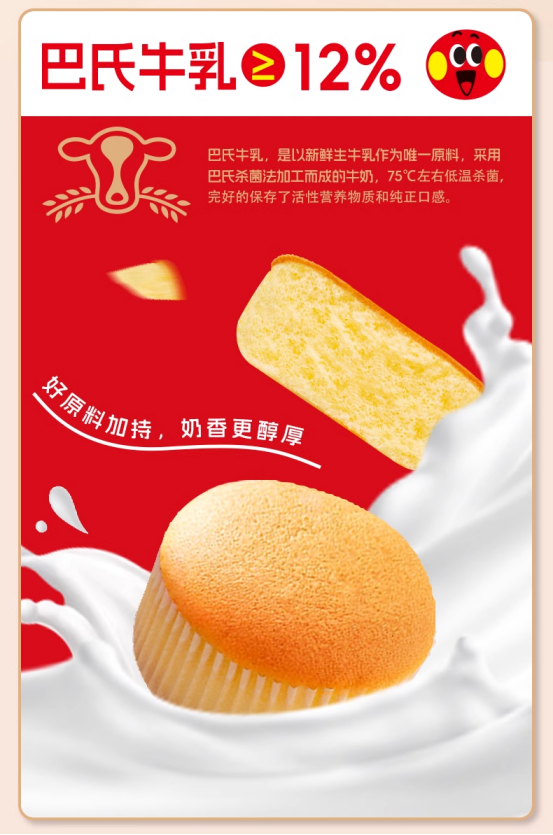 ✅0反式脂肪酸!放心吃!! ✅采用巴氏牛乳,营养丰富,牛乳含量≥12% ✅不添加一滴水,鲜鸡蛋含量≥51% ✅口感轻盈细腻,香浓蓬松