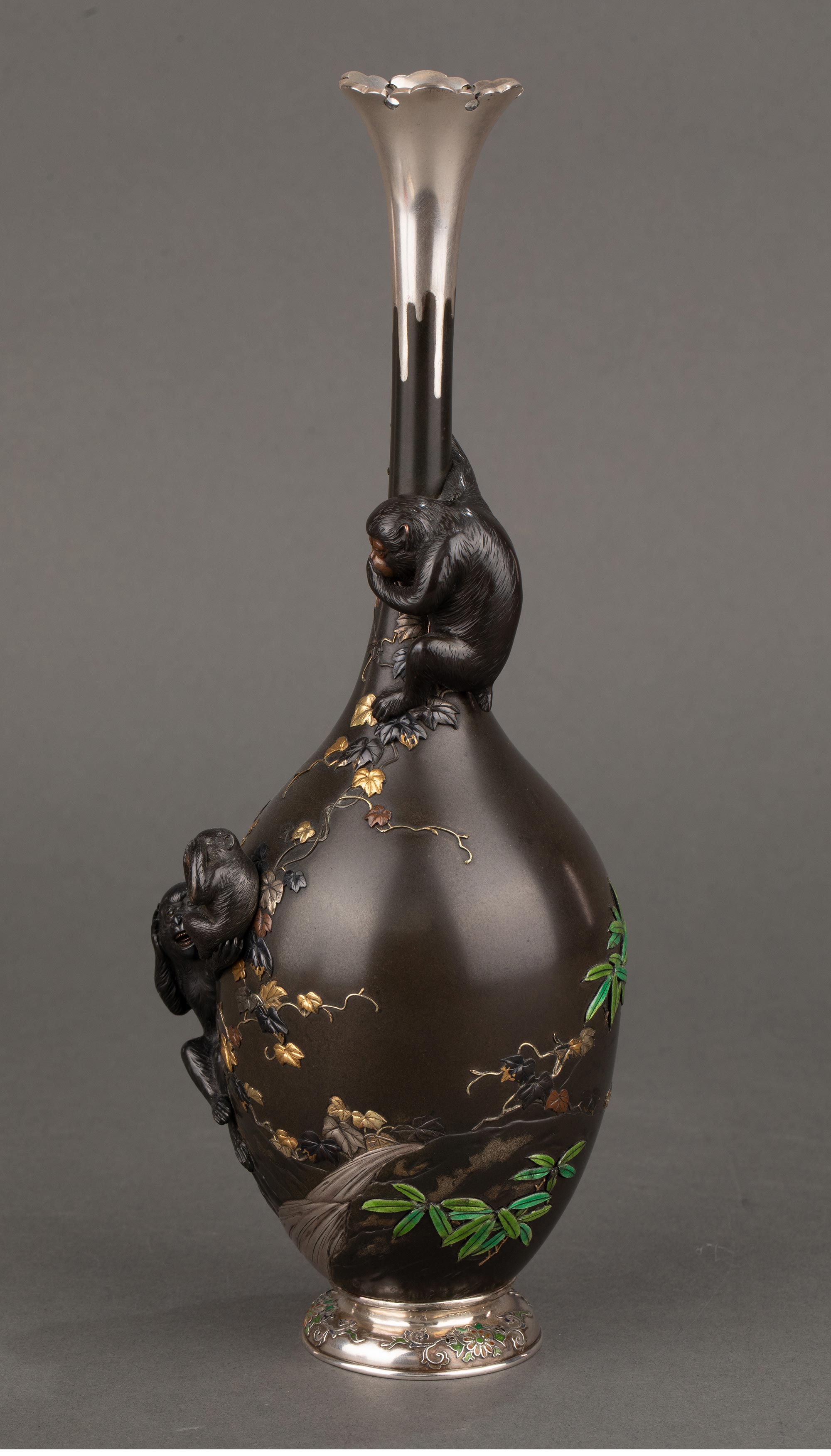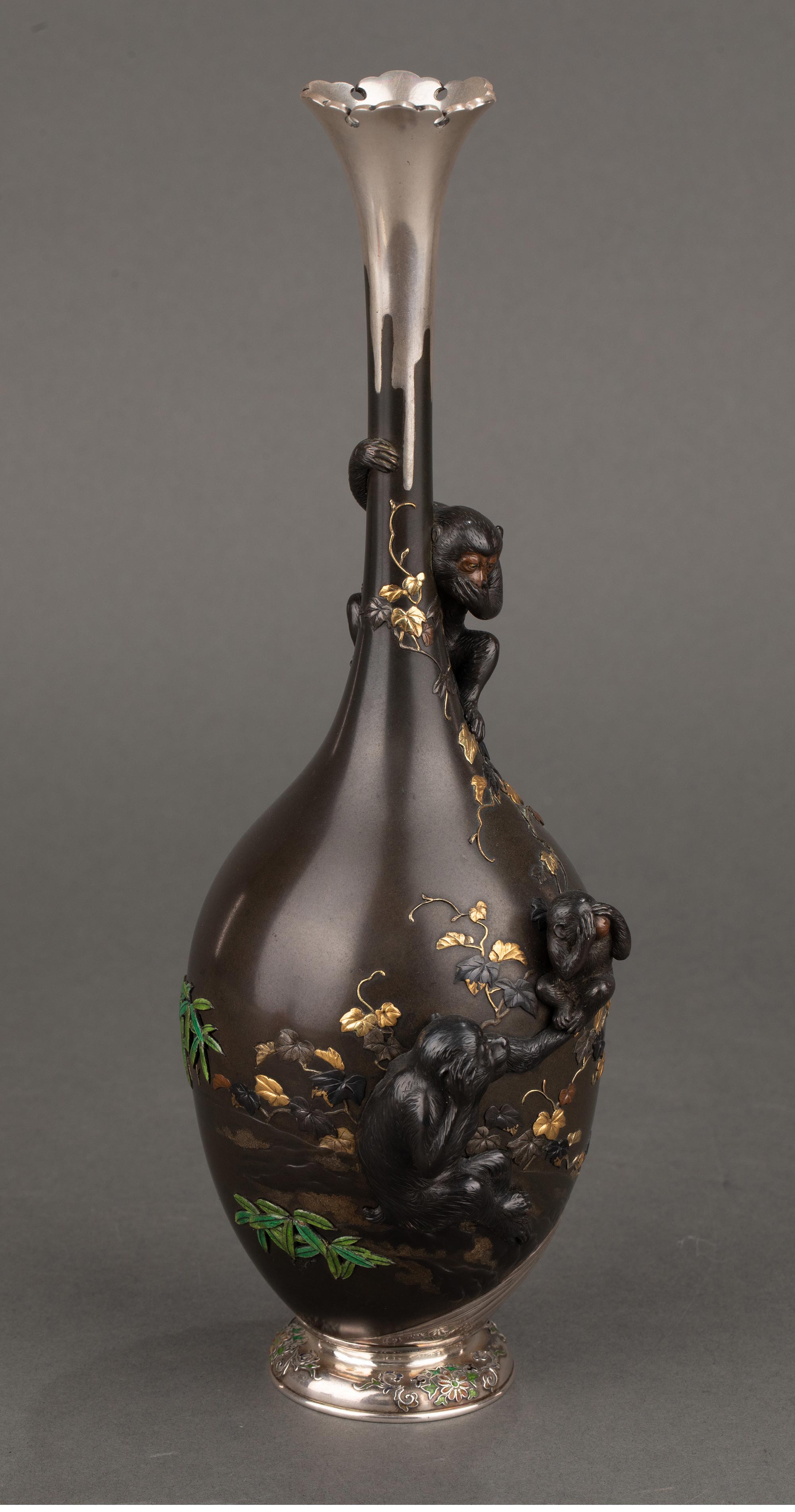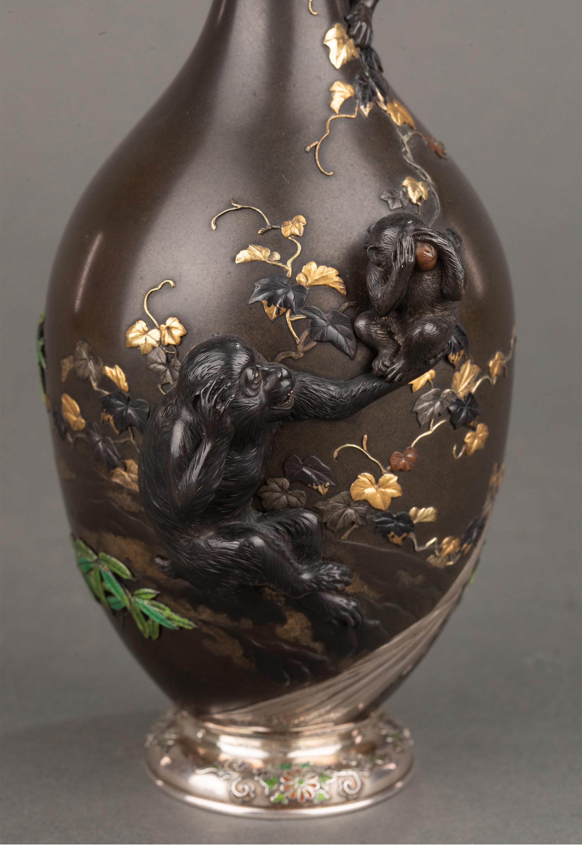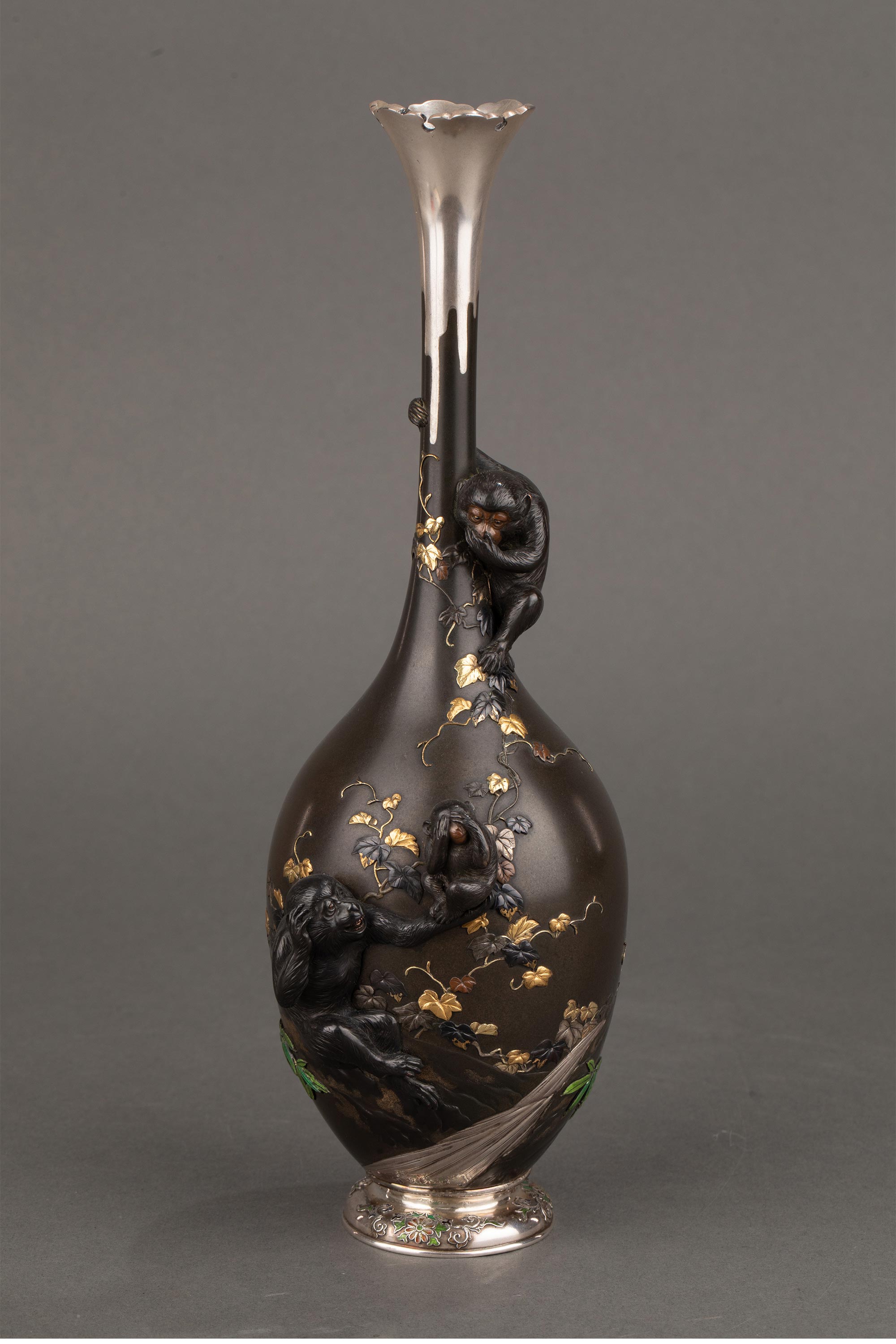 1868-1912年代日本明治时期武蔵屋大関签名创作三不猴主题镀金银精雕装饰珐琅彩绘细颈铜花瓶