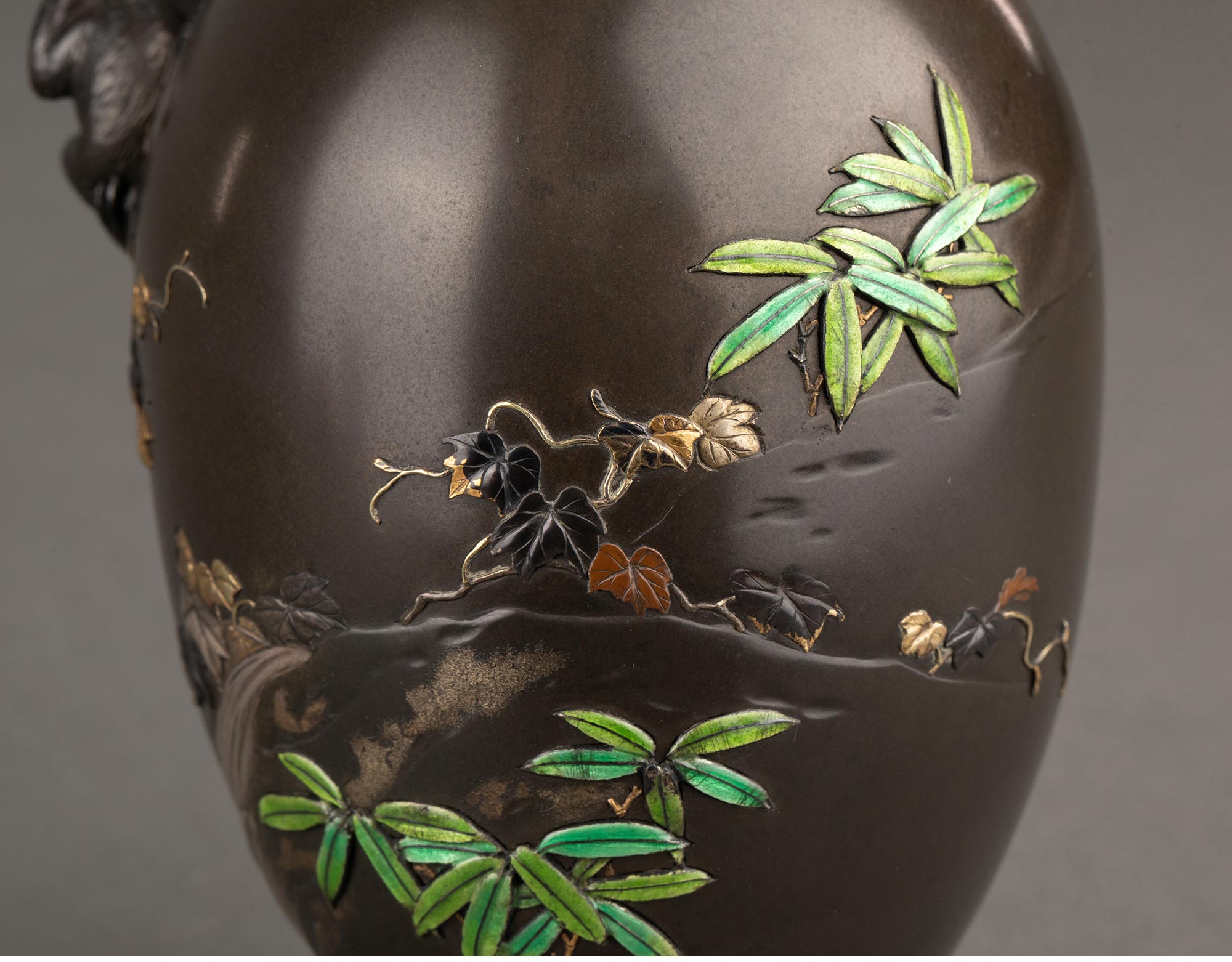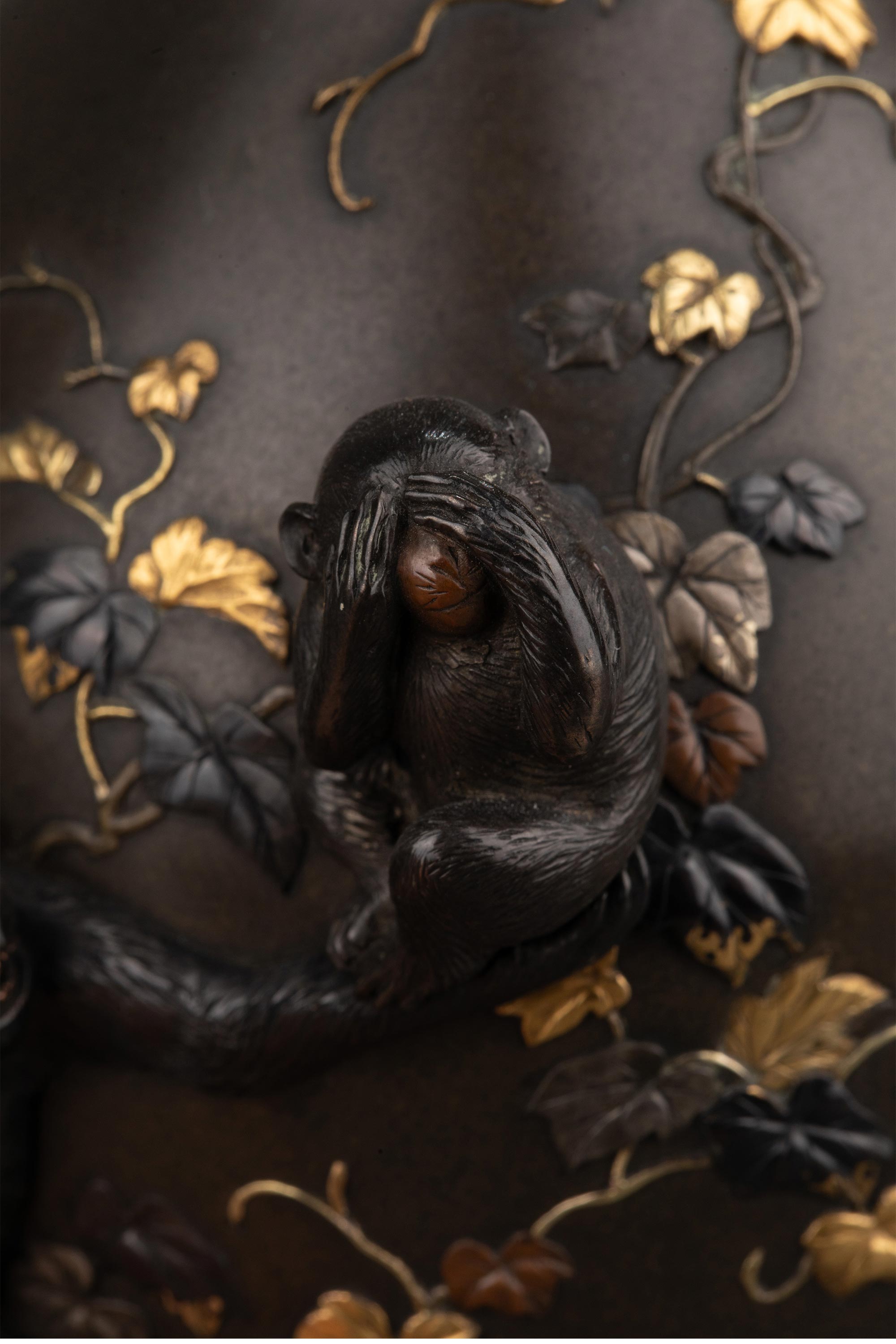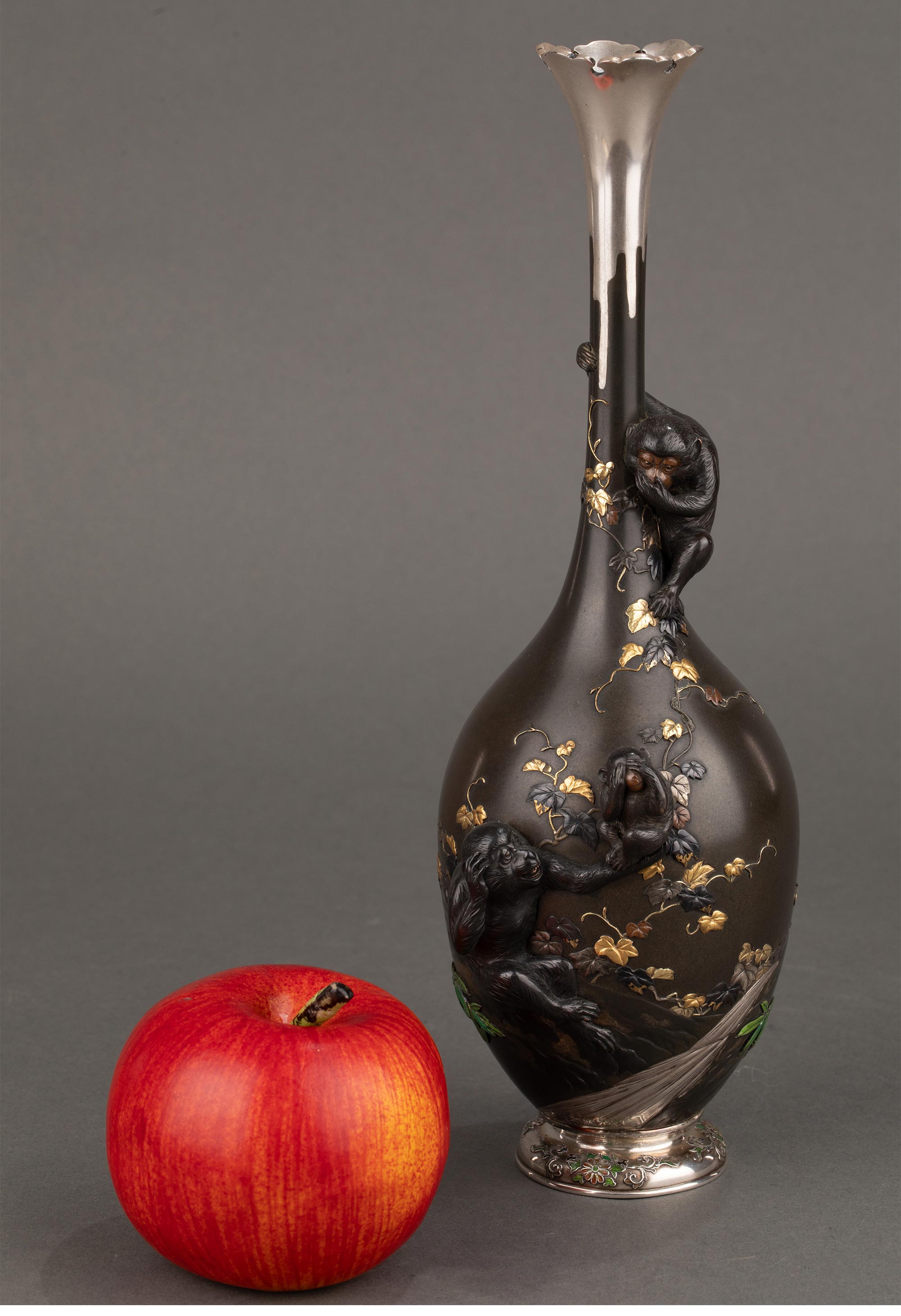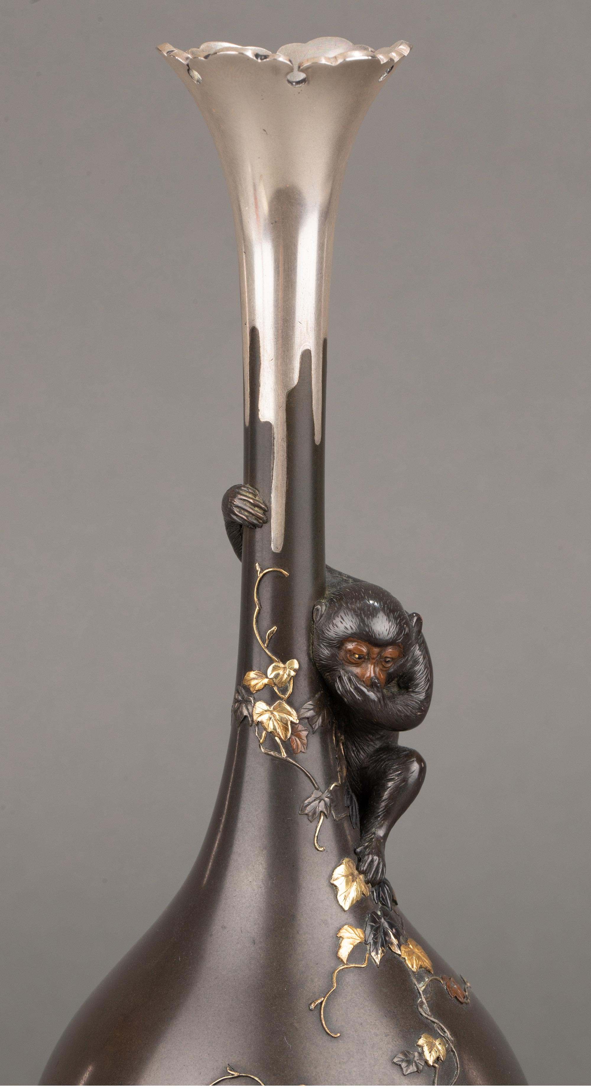 1868-1912年代日本明治时期武蔵屋大関签名创作三不猴主题镀金银精雕装饰珐琅彩绘细颈铜花瓶