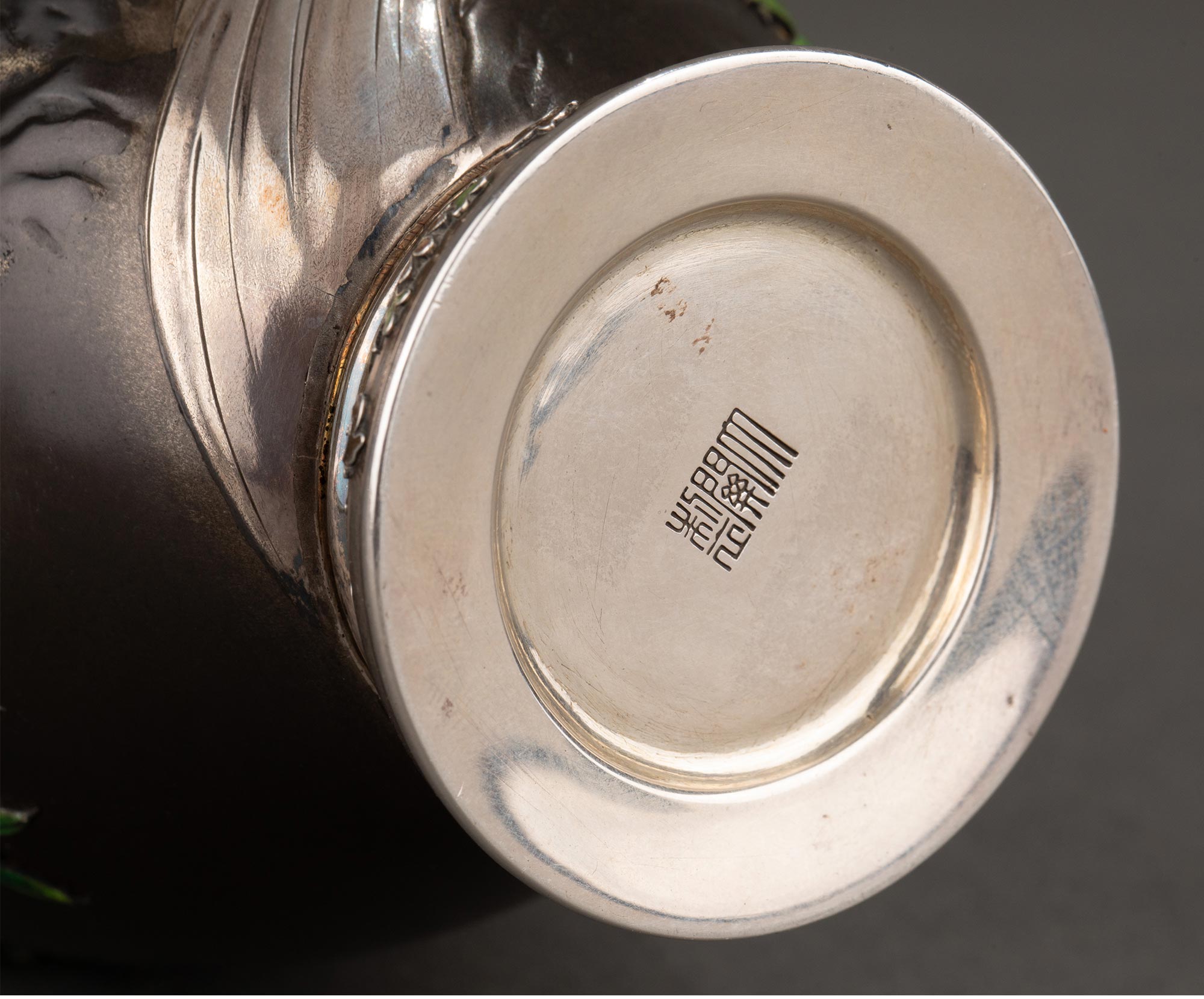 独角鹿西洋古董 日本明治时期武蔵屋大関签名创作三不猴主题镀金银精雕装饰珐琅彩绘细颈铜花瓶