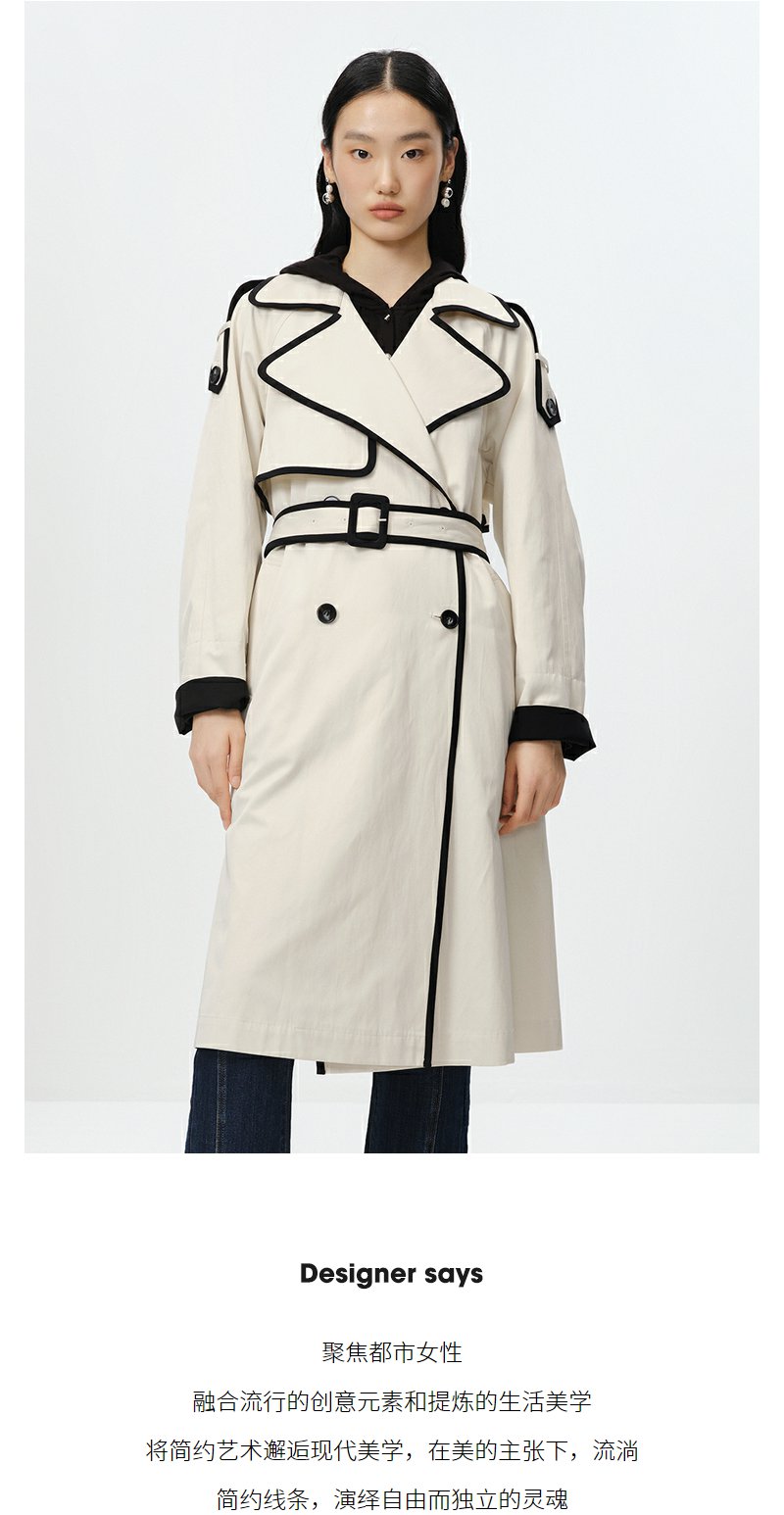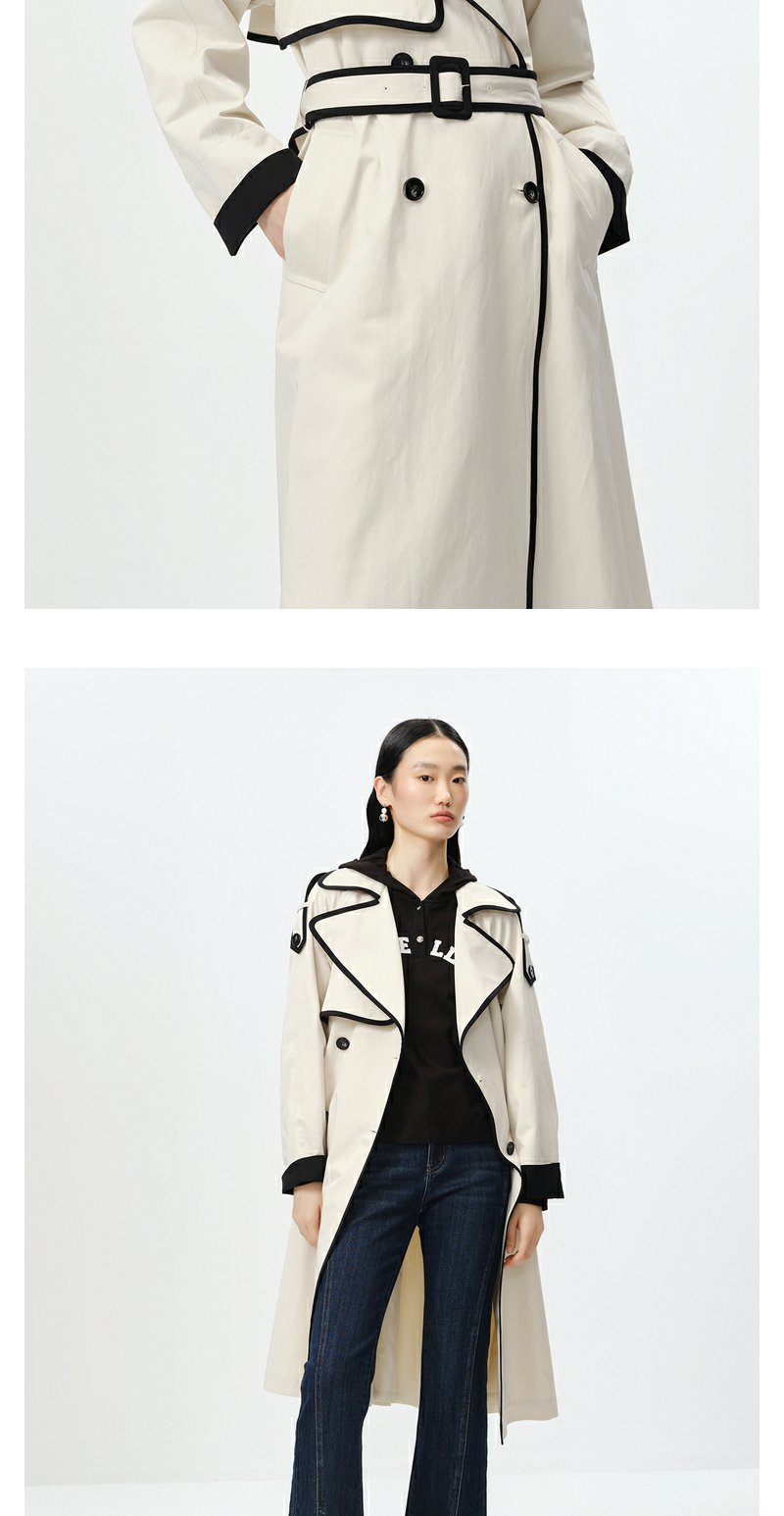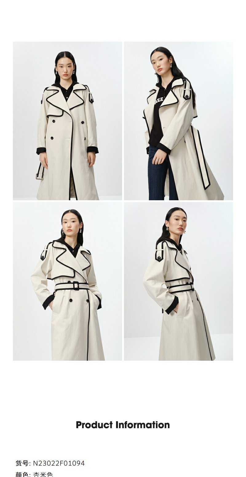NEELLY纳俪商场同款撞色大翻领双排扣风衣女中长款收腰大衣百搭N23084F14412