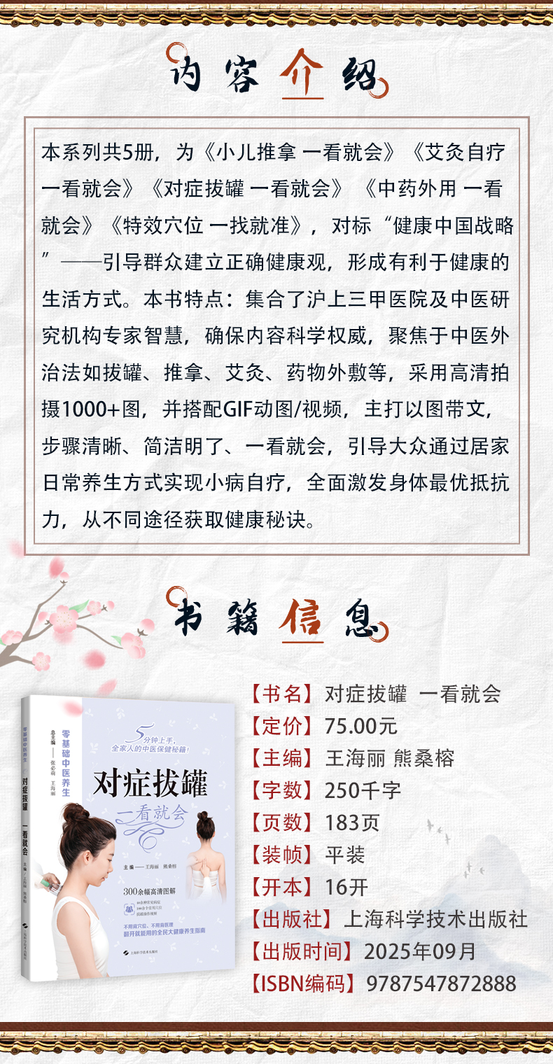 本系列共5册,为《小儿推拿 一看就会》《艾灸自疗 一看就会》《对症拔罐 一看就会》 《中药外用 一看就会》《特效穴位 一找就准》,对标“健康中国战略”——引导群众建立正确健康观,形成有利于健康的生活方式。本书特点:集合了沪上三甲医院及中医研究机构专家智慧,确保内容科学权威,聚焦于中医外治法如拔罐、推拿、艾灸、药物外敷等,采用高清拍摄1000+图,并搭配GIF动图/视频,主打以图带文,步骤清晰、简洁明了、一看就会,引导大众通过居家日常养生方式实现小病自疗,全面激发身体最优抵抗力,从不同途径获取健康秘诀。
