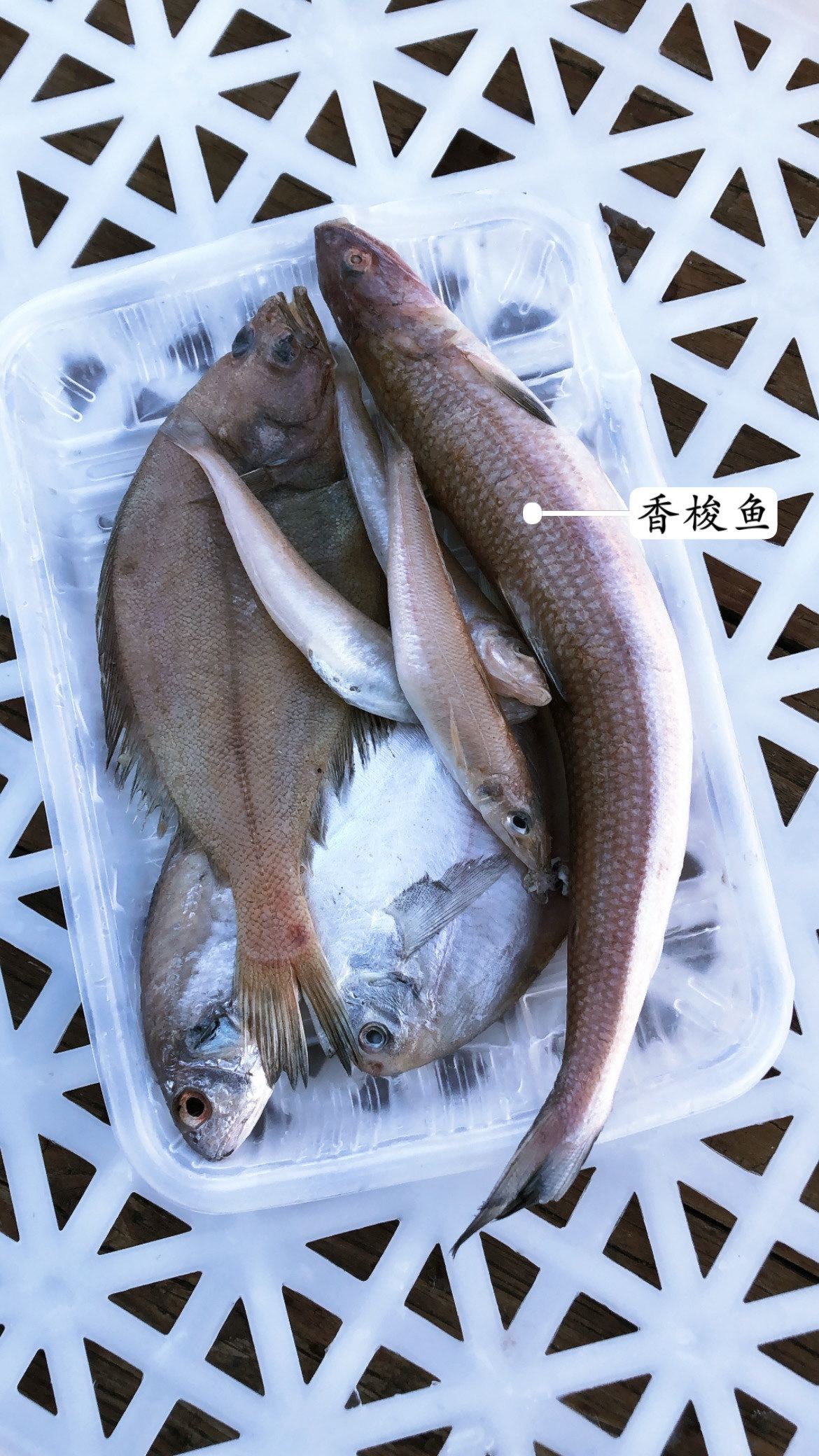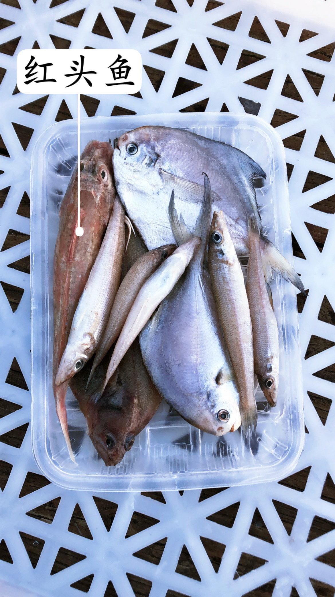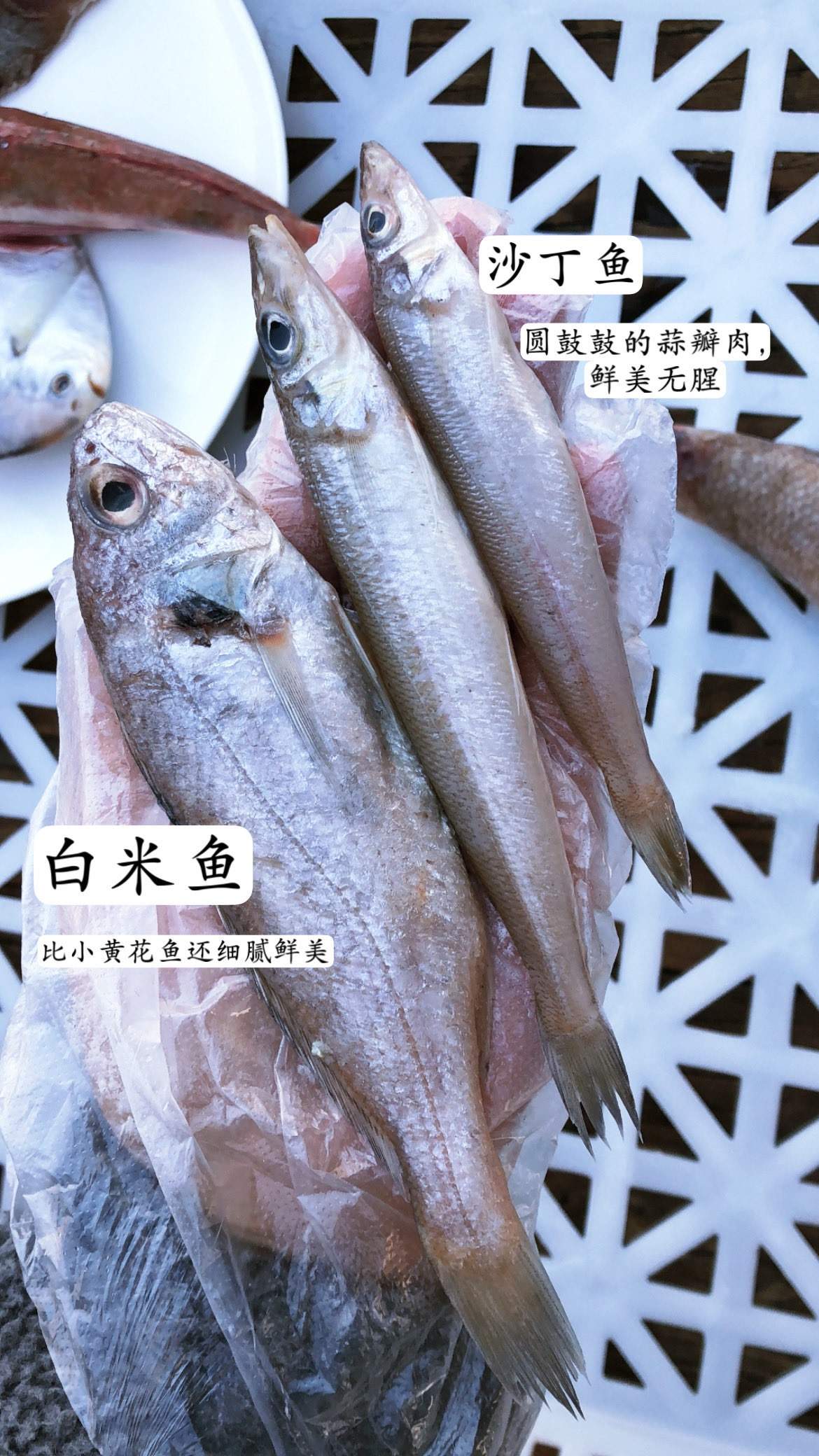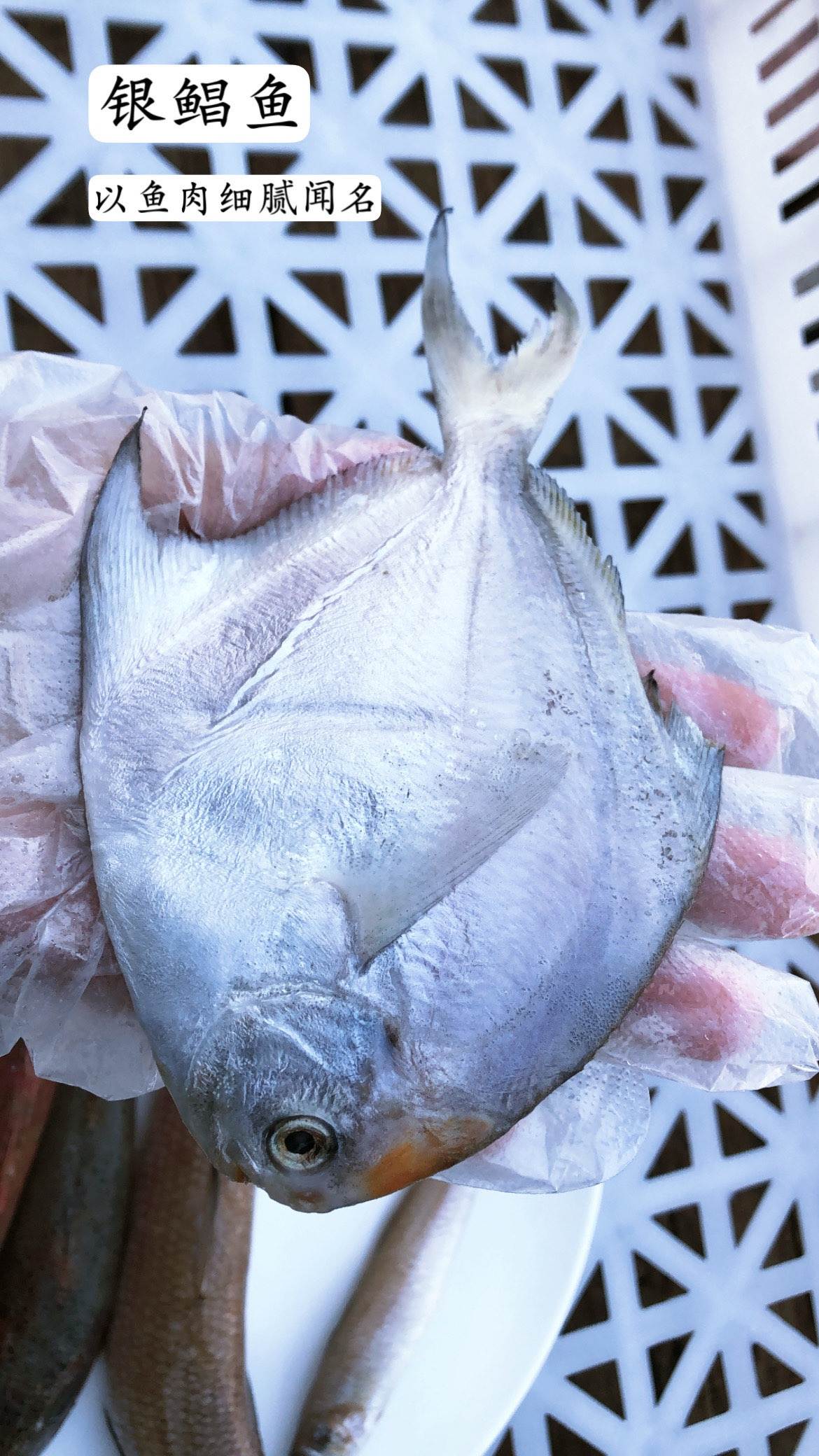 有:银鲳鱼、沙丁鱼、偏口鱼、红头鱼、香梭鱼、白米鱼、摆甲鱼!这些鱼一个共同特点都是当季渤海海域的特产,都是野生捕捞的!