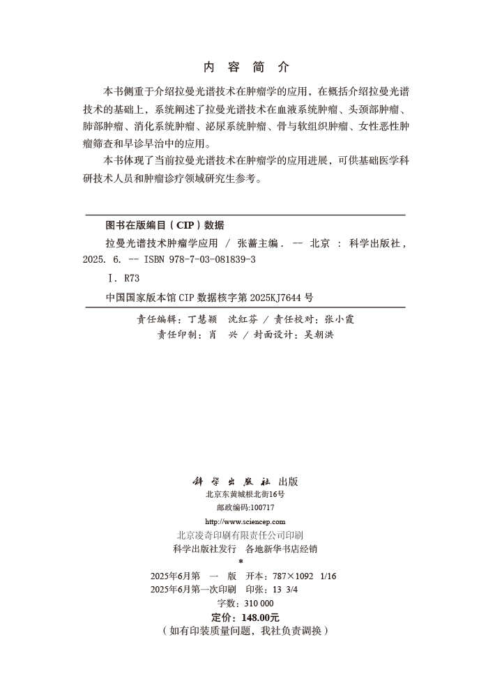 拉曼光谱技术肿瘤学应用 张蔷 系统阐述了拉曼光谱技术在血液系统肿瘤头颈部肿瘤女性恶性肿瘤筛查和早诊早治中的应用 科学出版社